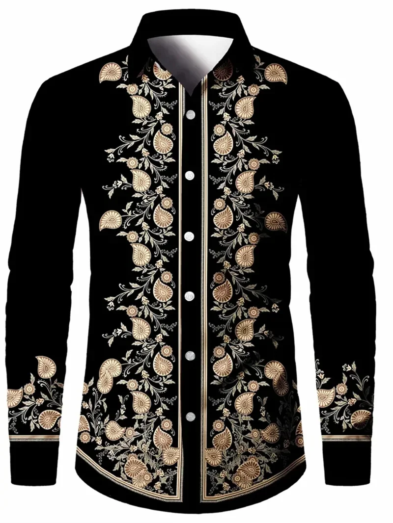 2025 New Men's Retro Fashion Classic Shirt Casual Collar Button Shirt Men's Ethnic Printed Party Shirt