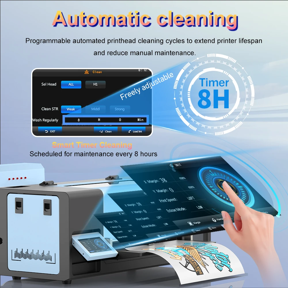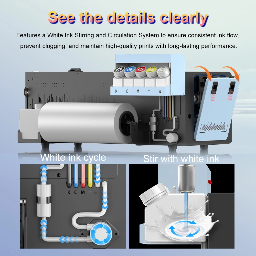 Features a White Ink Stirring and Circulation System to ensure consistent ink flow, prevent clogging, and maintain high-quality prints with long-lasting performance.