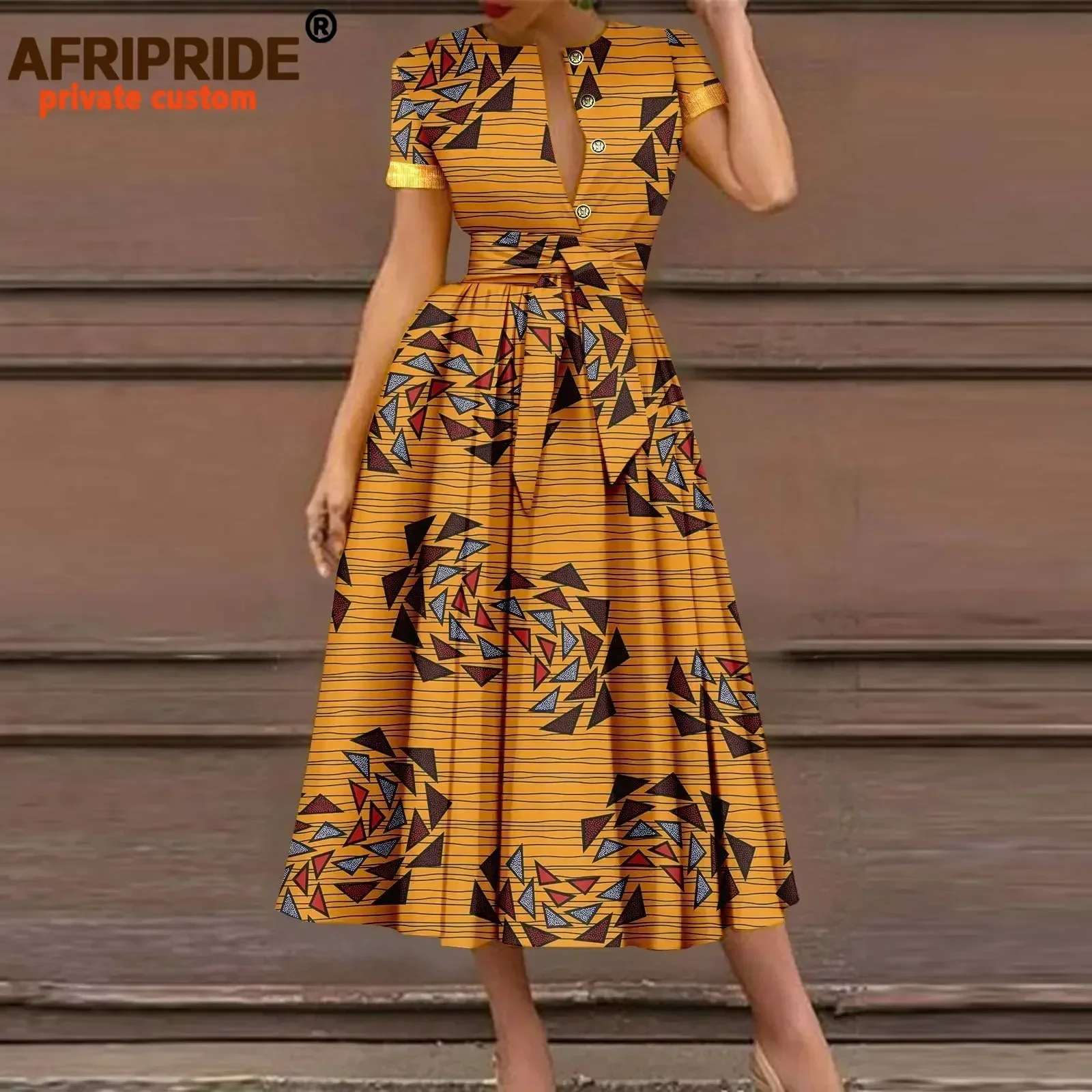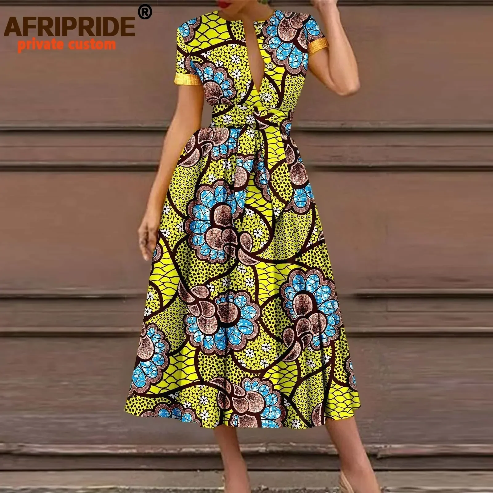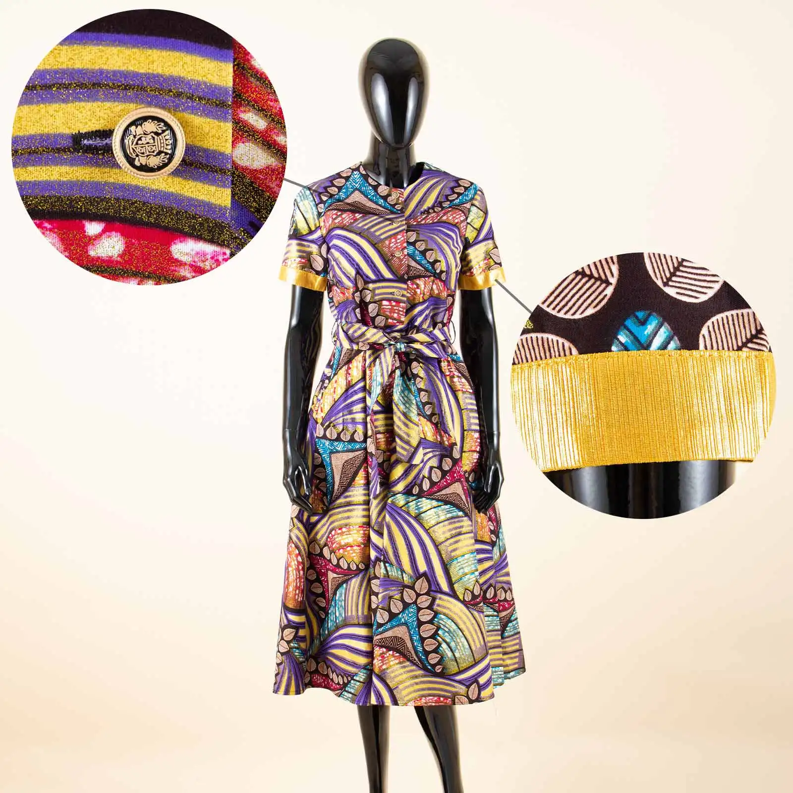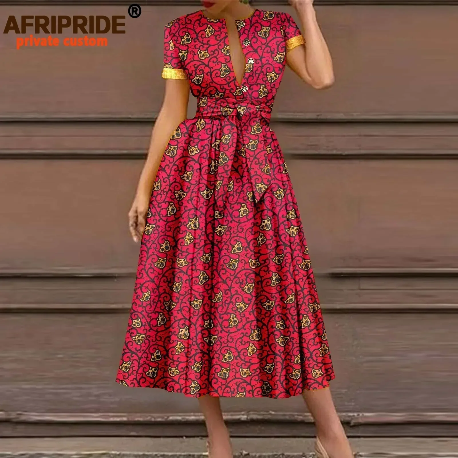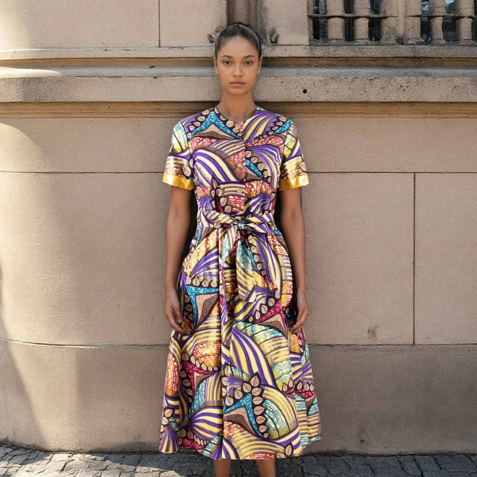 African Dresses for Women Short Sleeve High Waist Elegant Print Casual Outfits Midi Dress Dashiki Attire with Belt A2325003