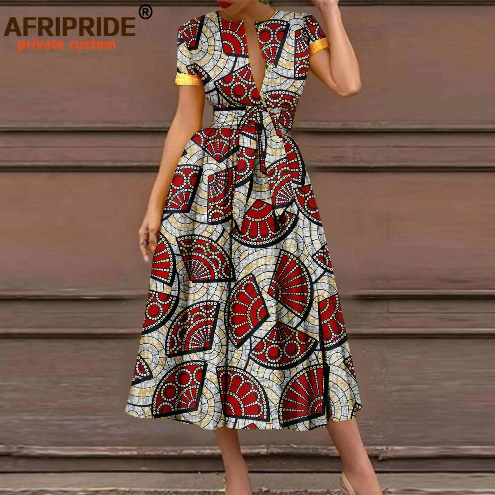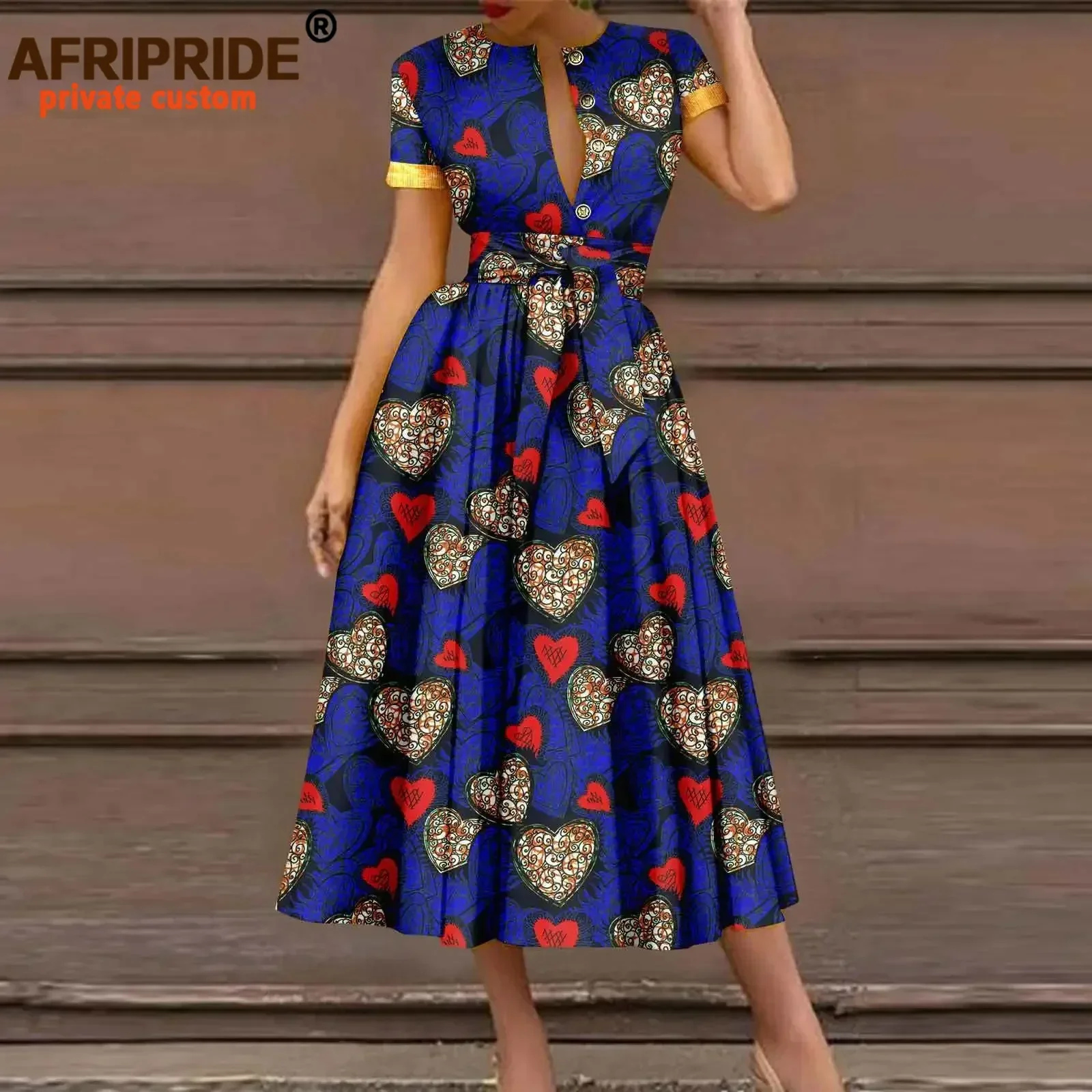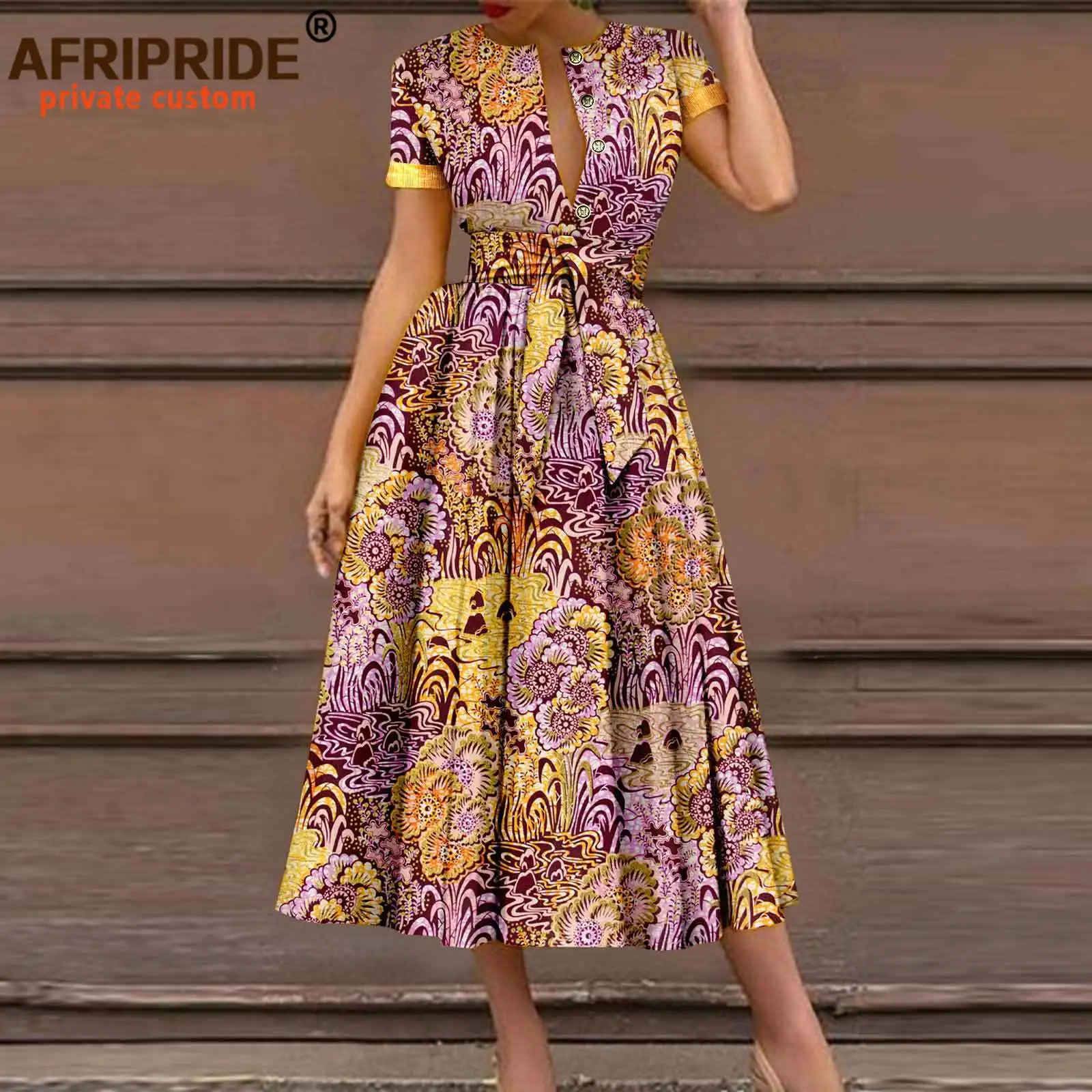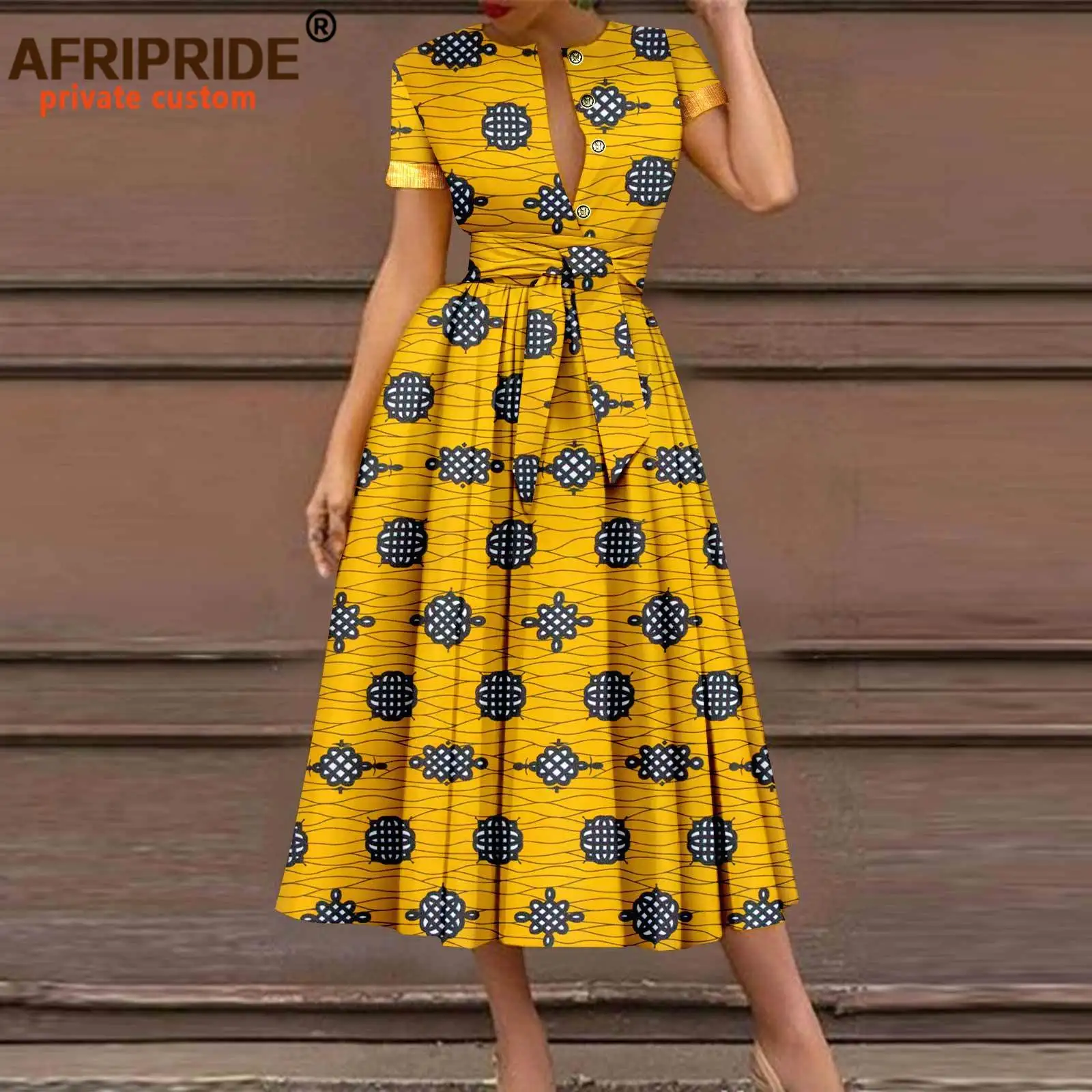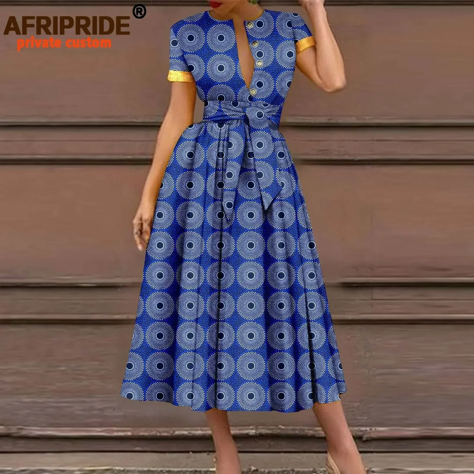 African Dresses for Women Short Sleeve High Waist Elegant Print Casual Outfits Midi Dress Dashiki Attire with Belt A2325003