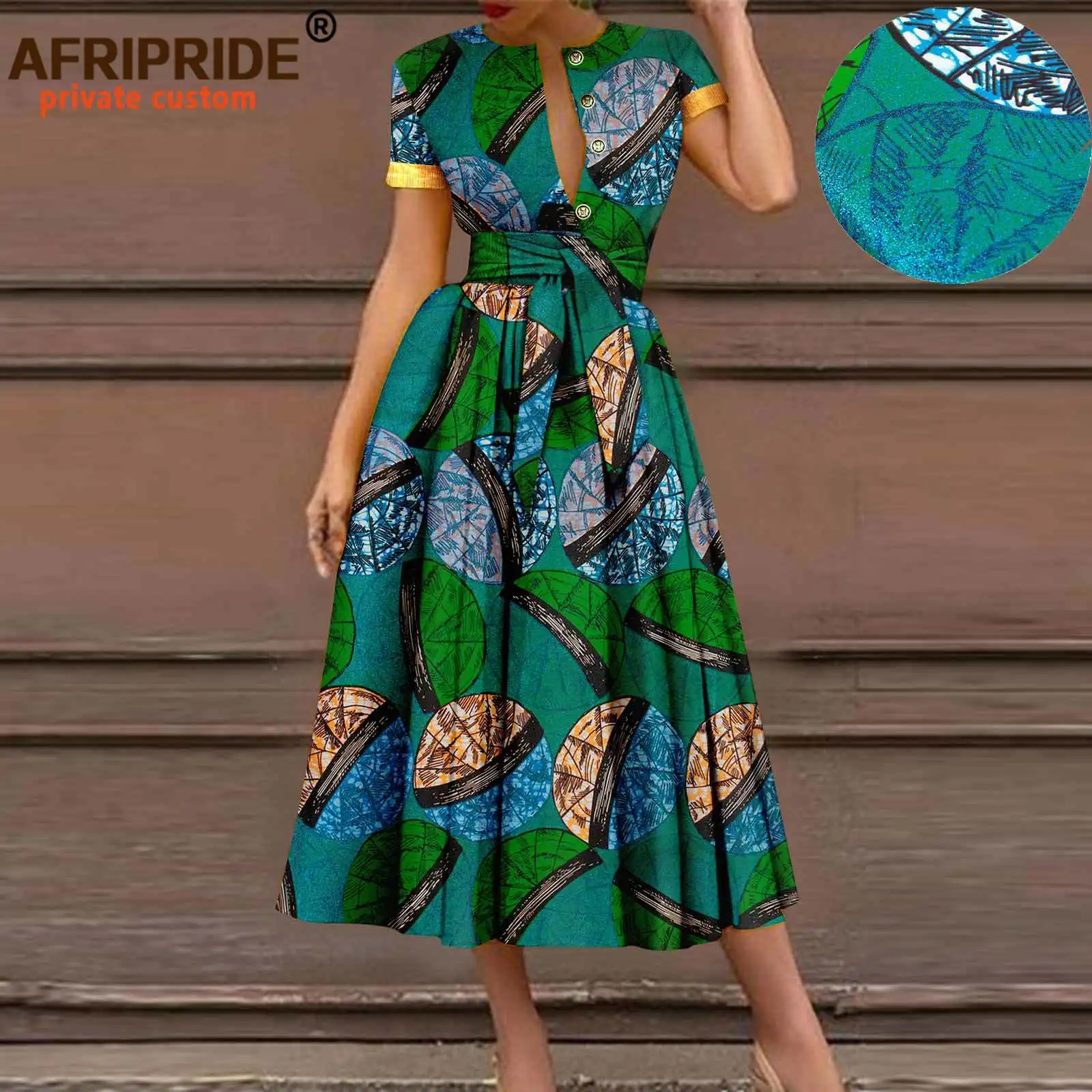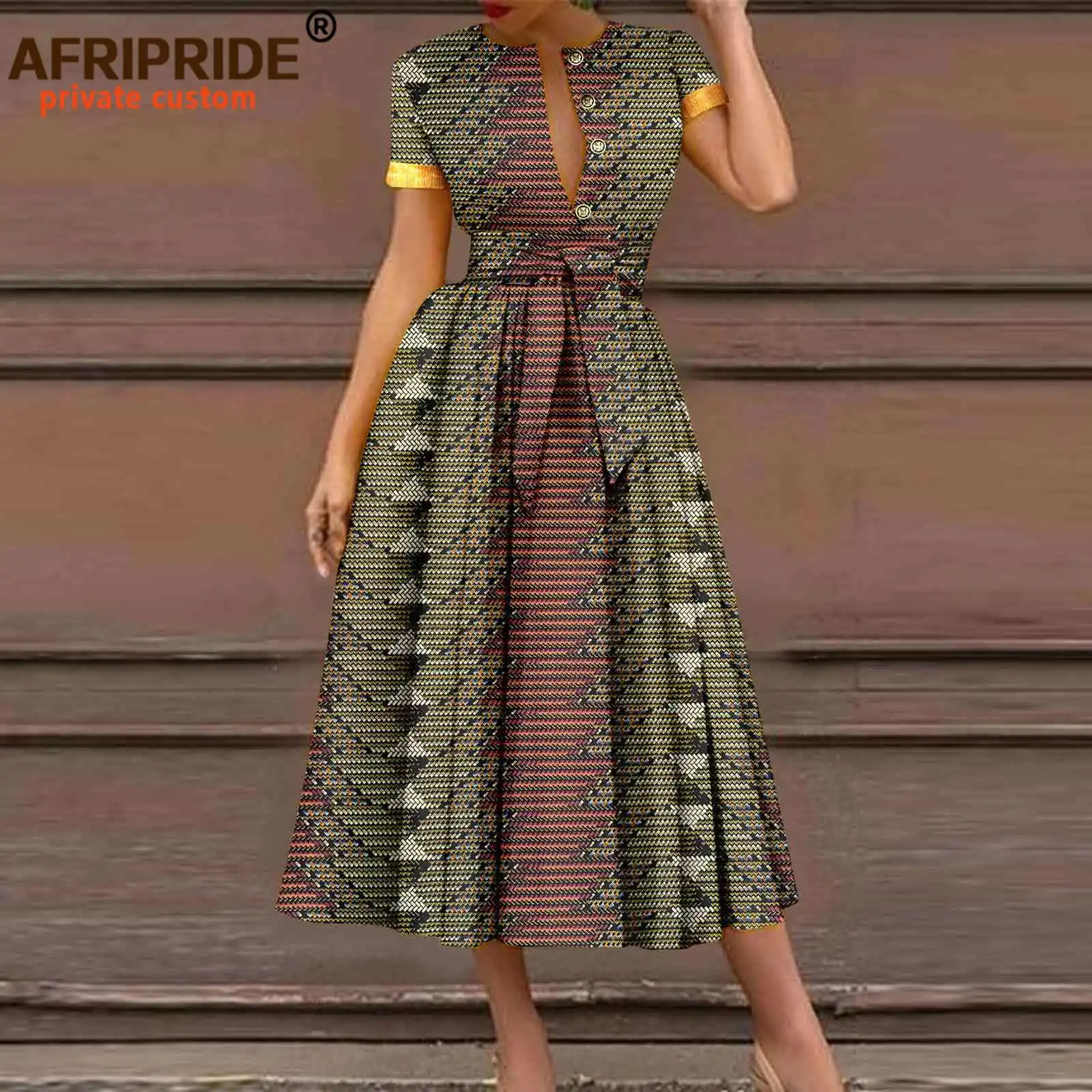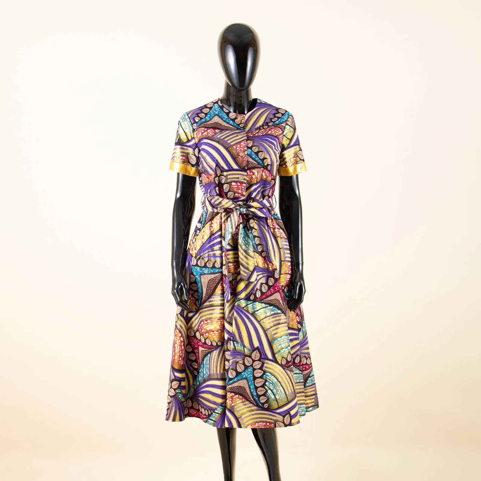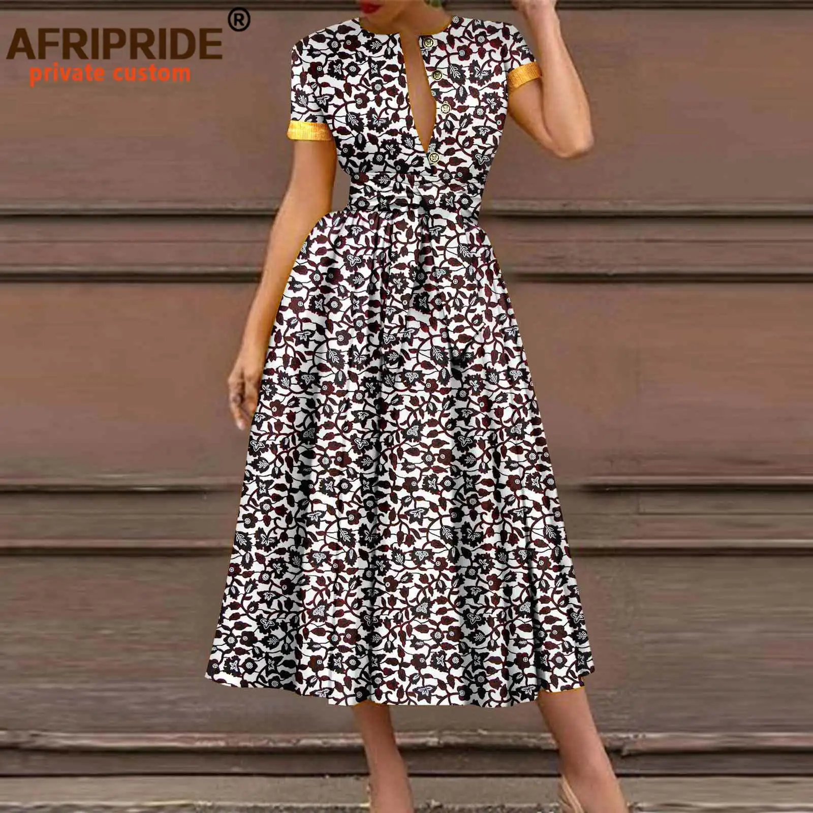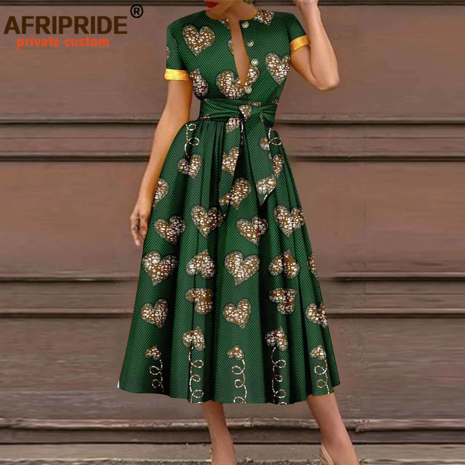 African Dresses for Women Short Sleeve High Waist Elegant Print Casual Outfits Midi Dress Dashiki Attire with Belt A2325003