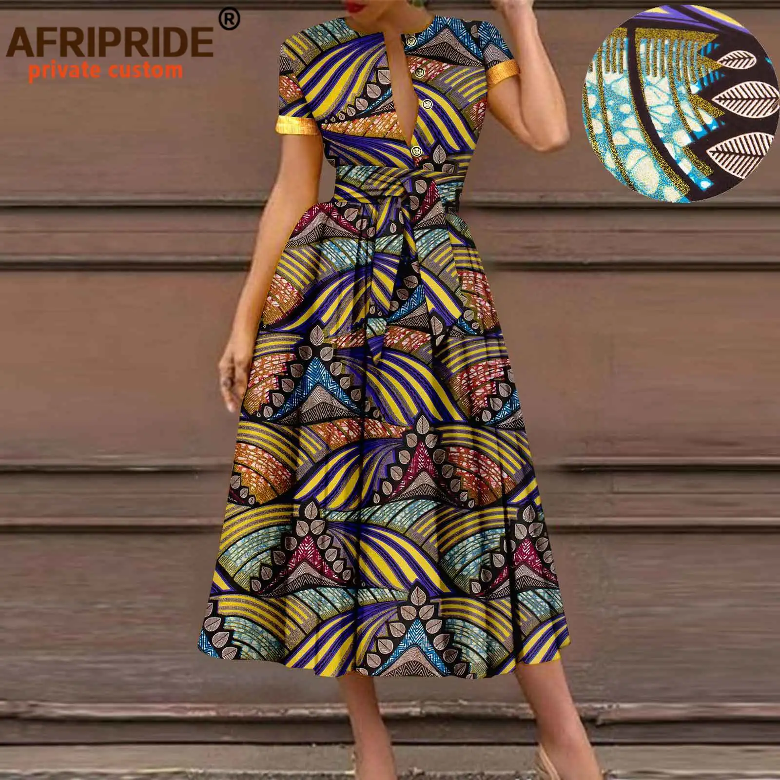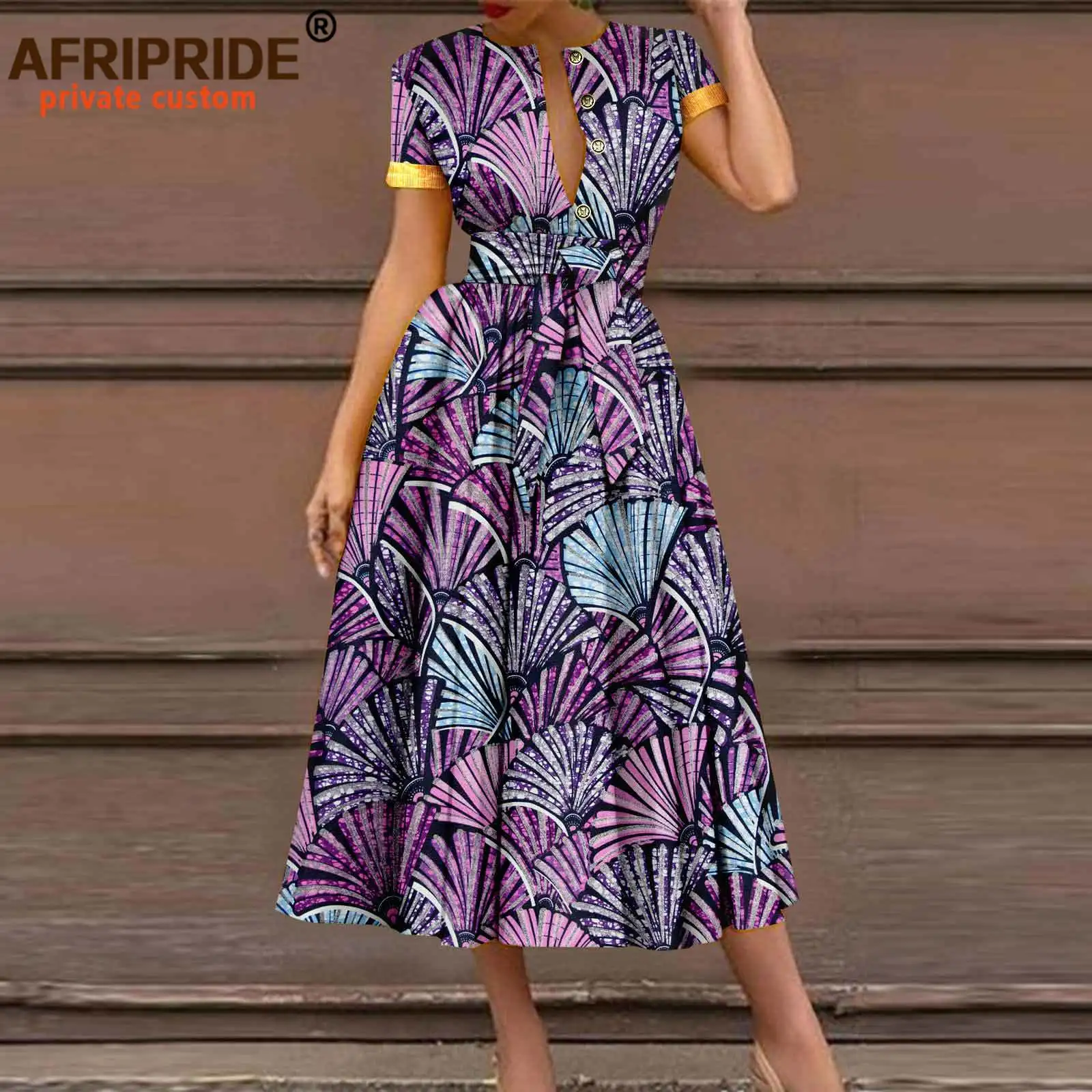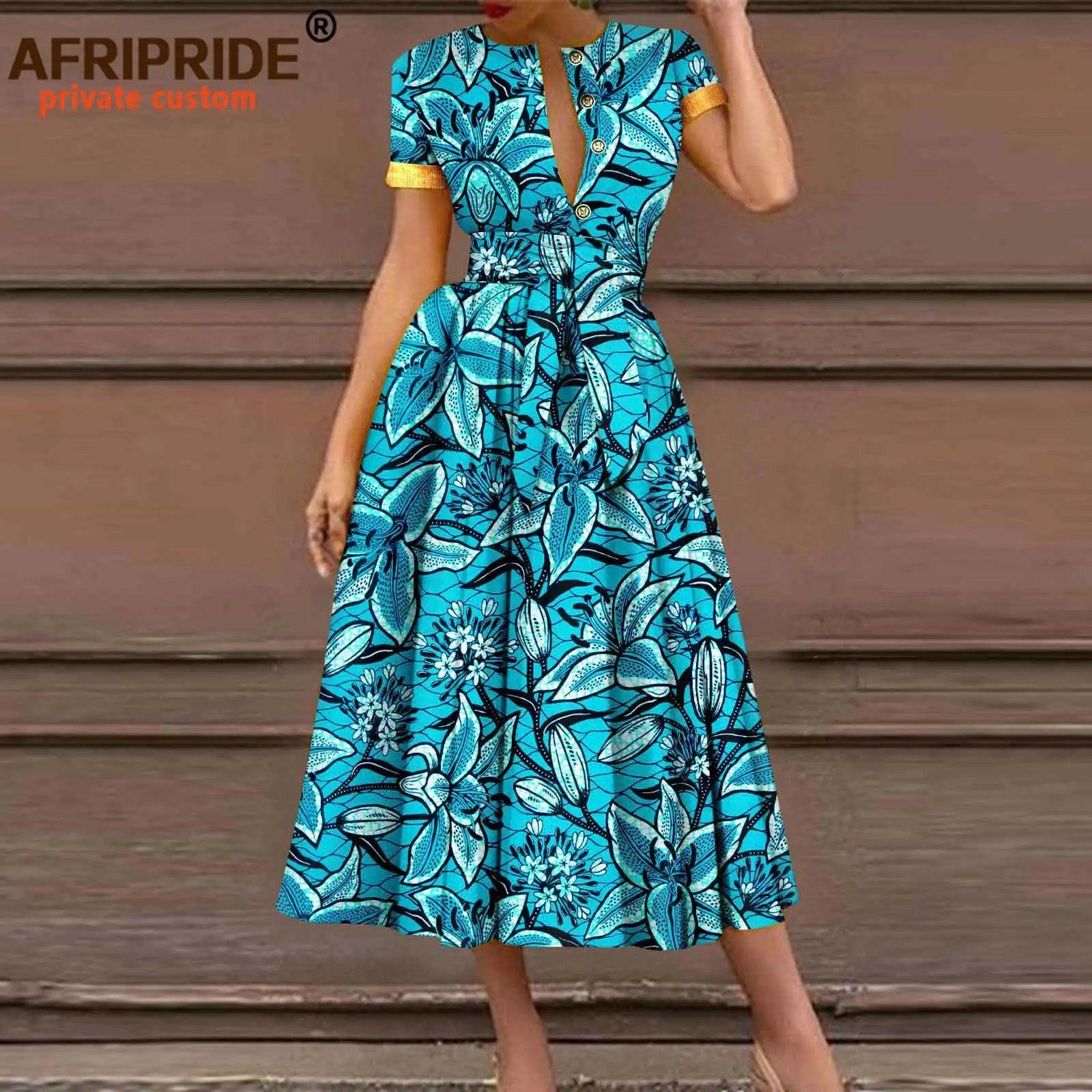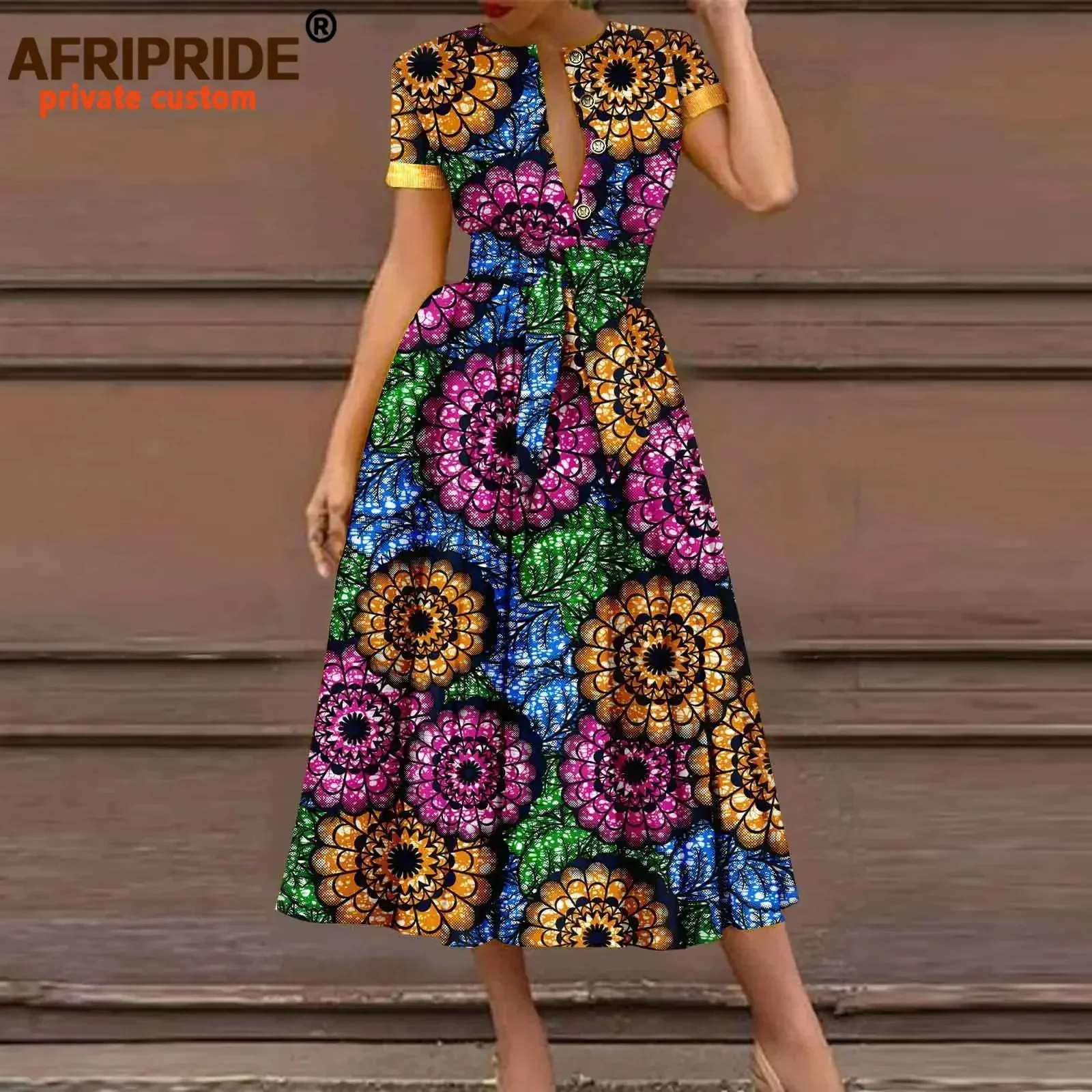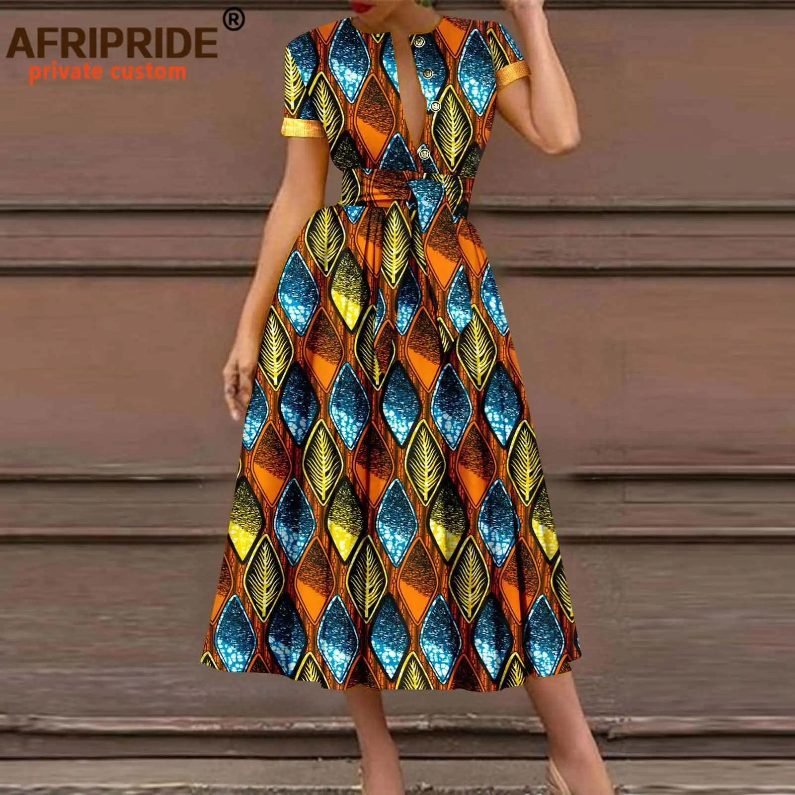 African Dresses for Women Short Sleeve High Waist Elegant Print Casual Outfits Midi Dress Dashiki Attire with Belt A2325003