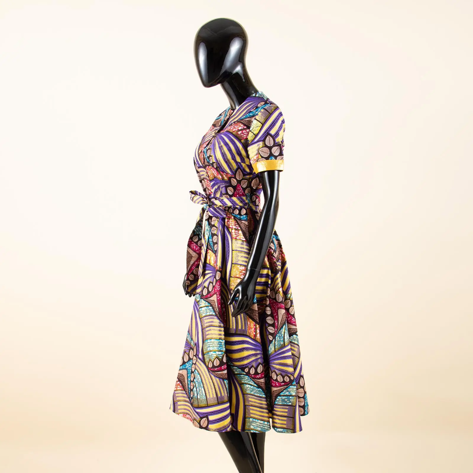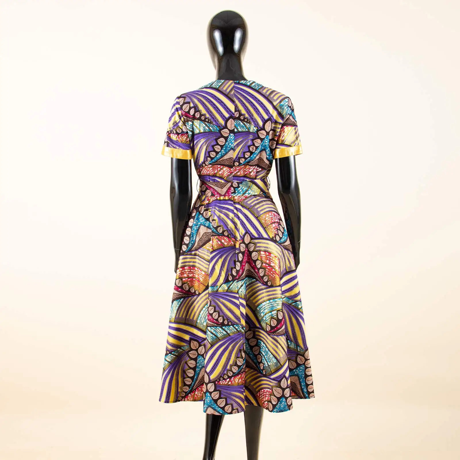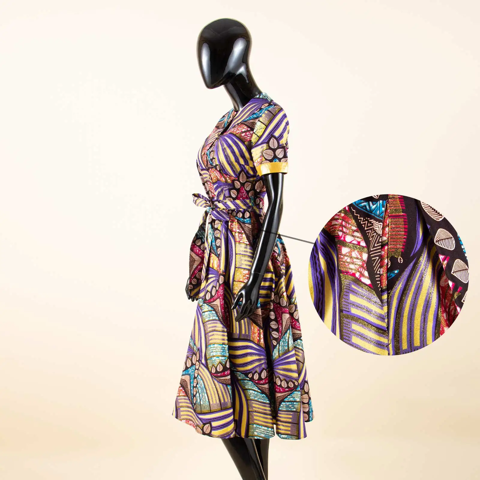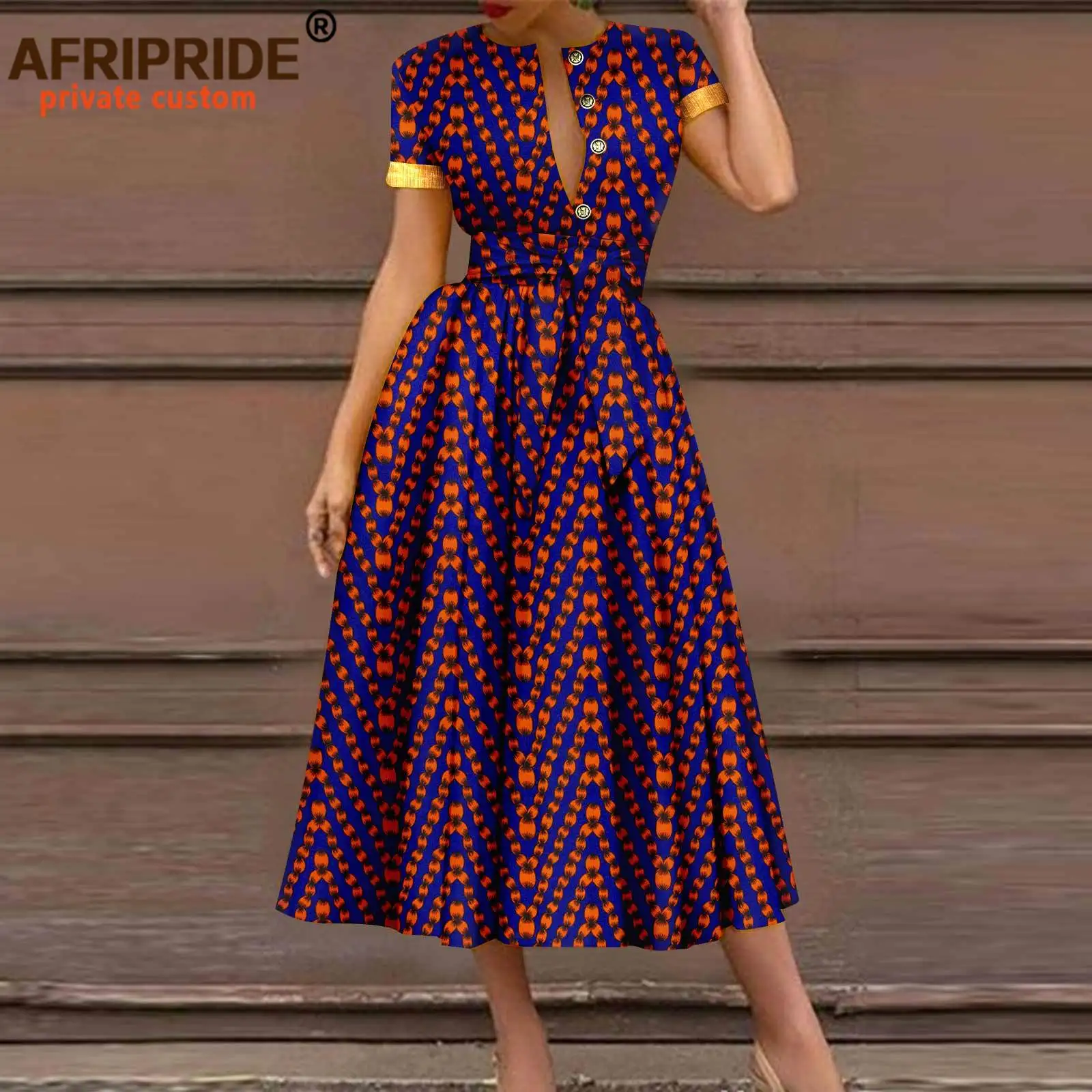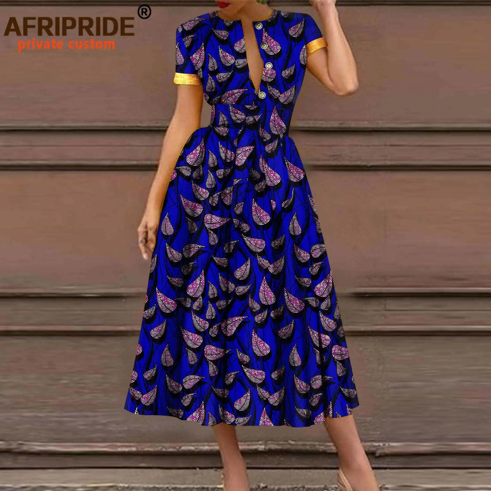 African Dresses for Women Short Sleeve High Waist Elegant Print Casual Outfits Midi Dress Dashiki Attire with Belt A2325003
