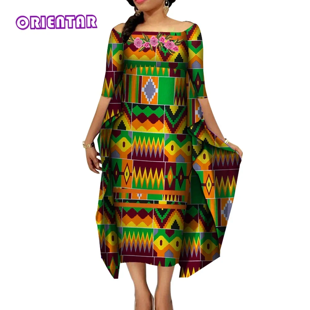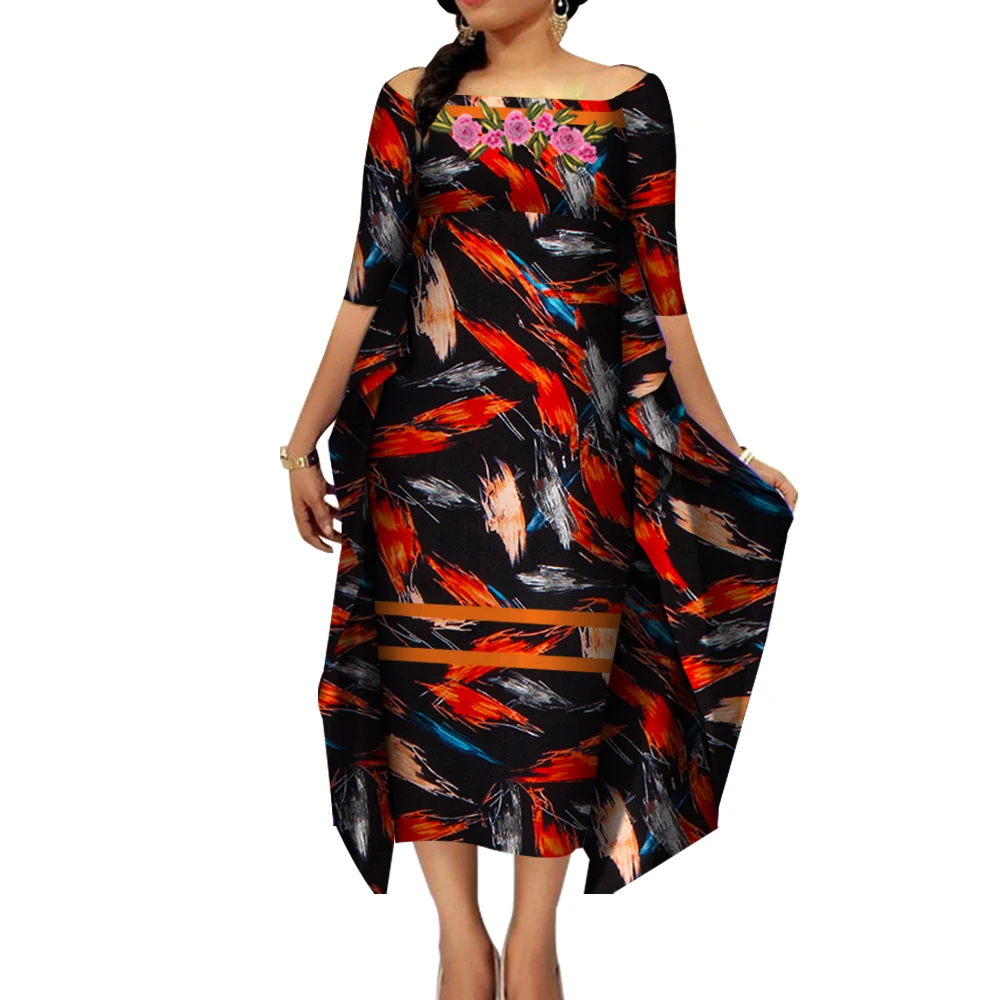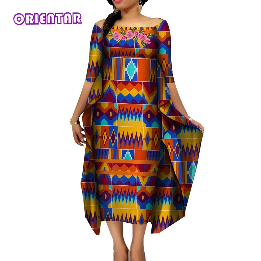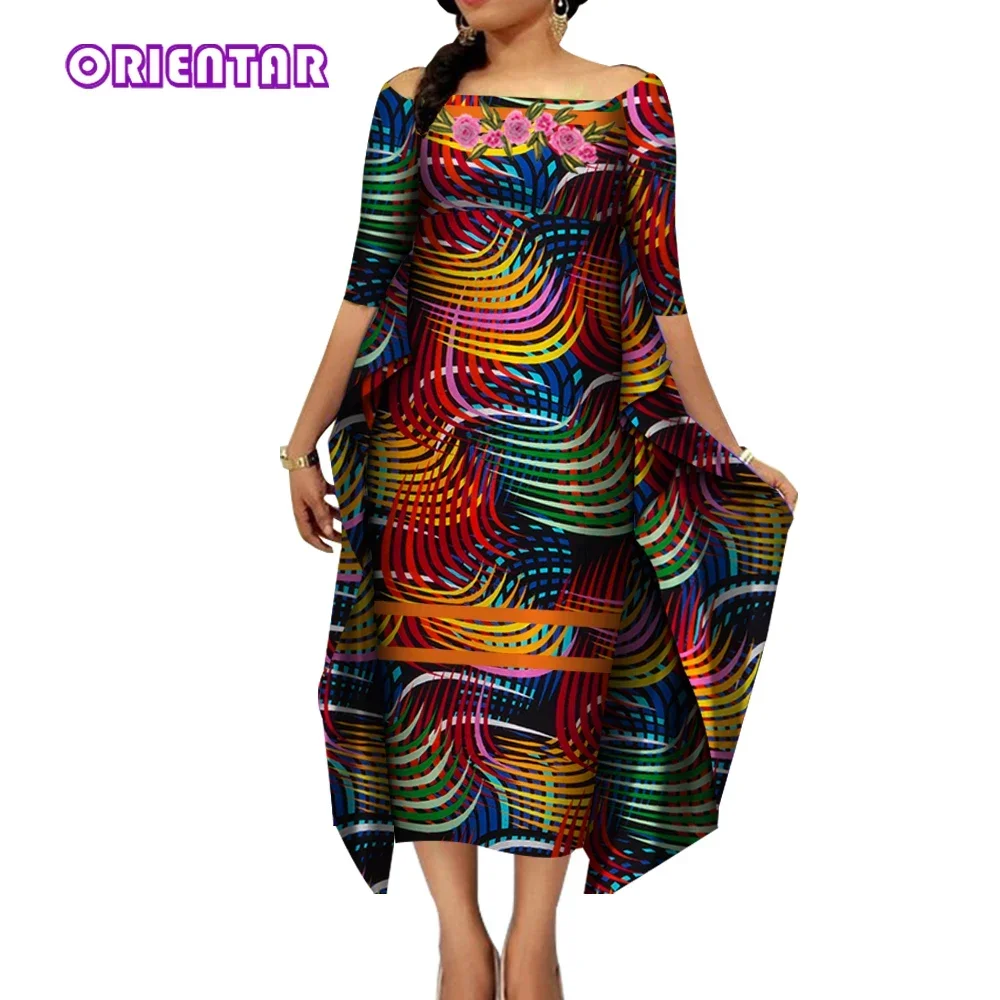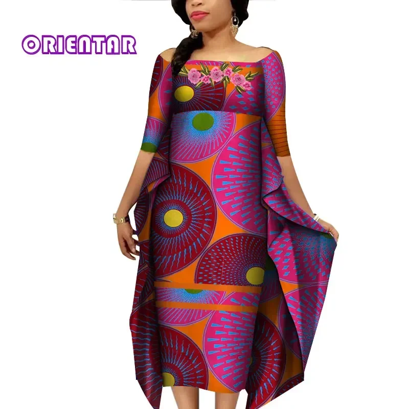 African Dresses for Women Slash Neck Bat Sleeve Swing Ankara Dresses Elegant African Printed Bazin Riche Clothing WY4187
