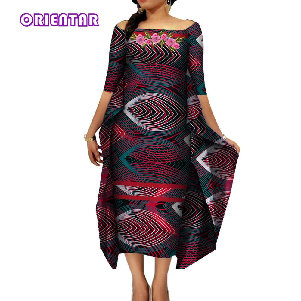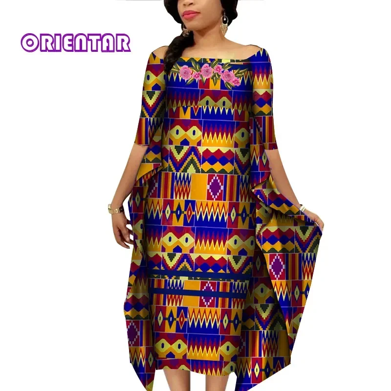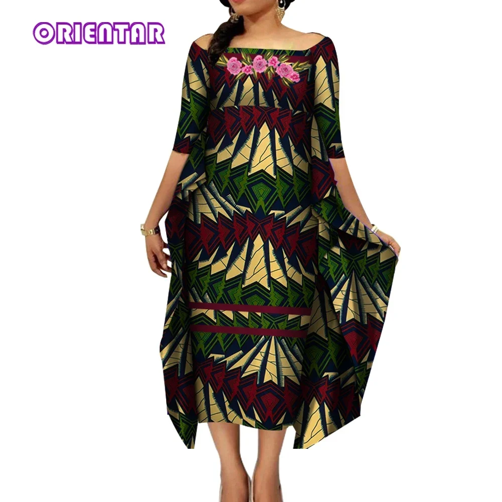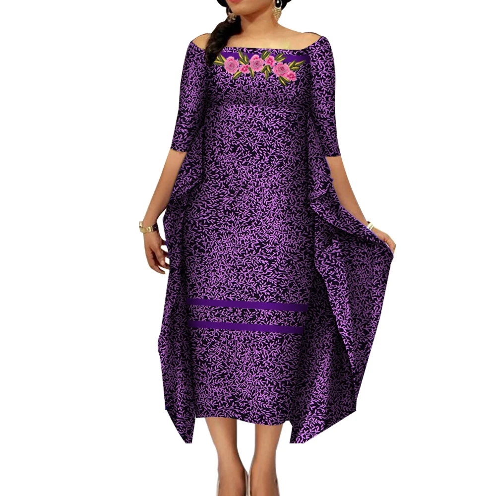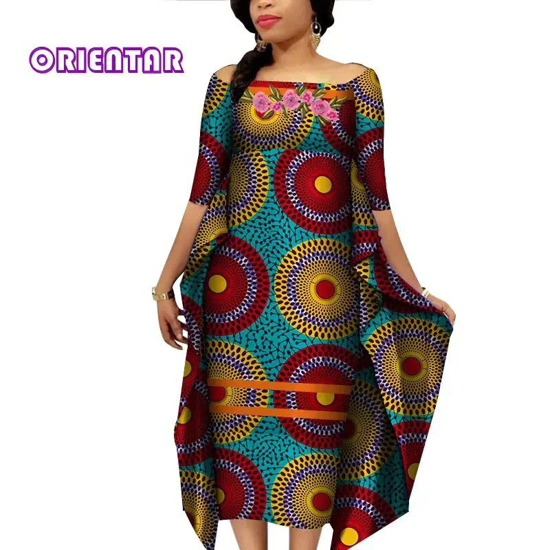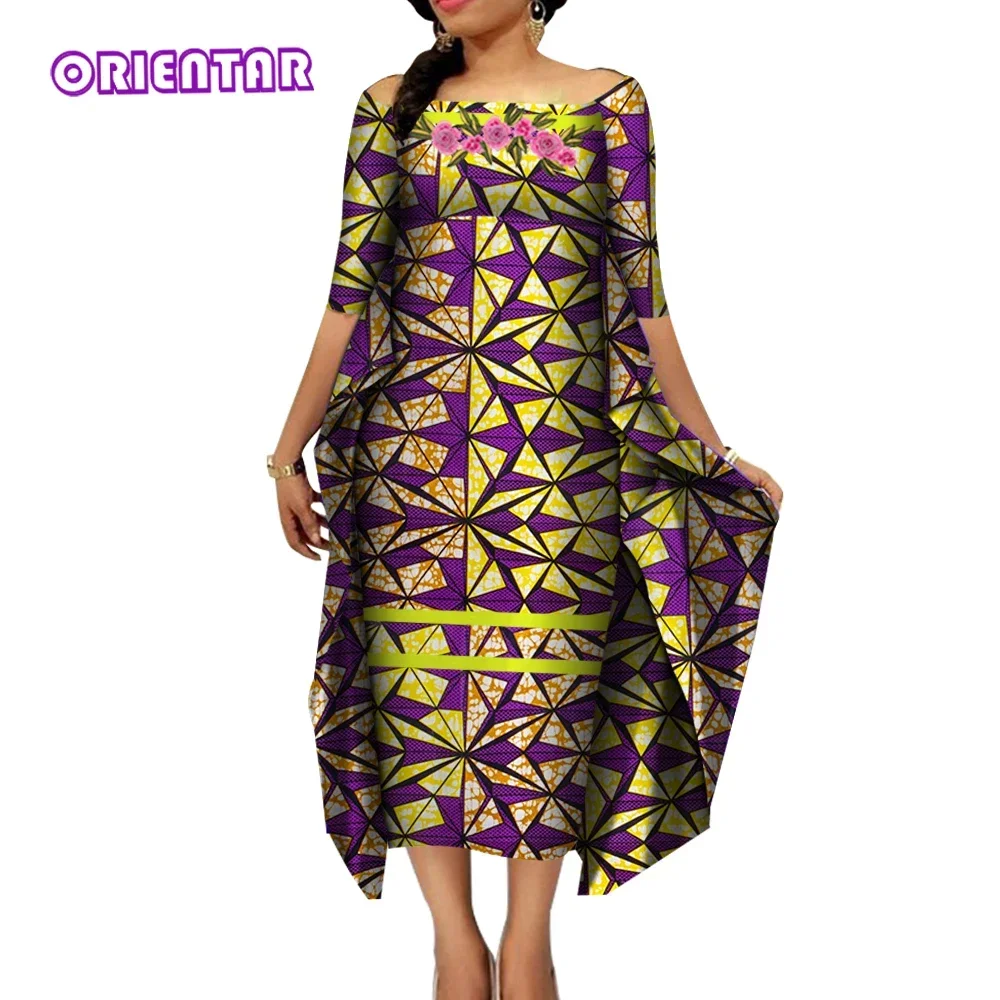African Dresses for Women Slash Neck Bat Sleeve Swing Ankara Dresses Elegant African Printed Bazin Riche Clothing WY4187