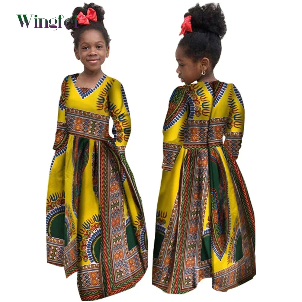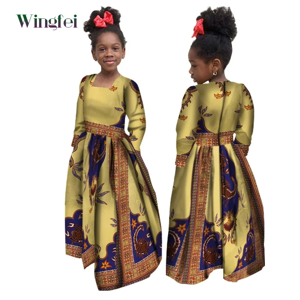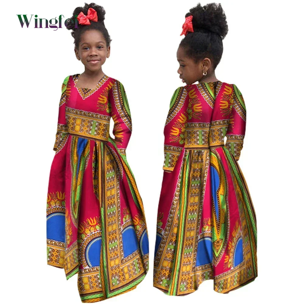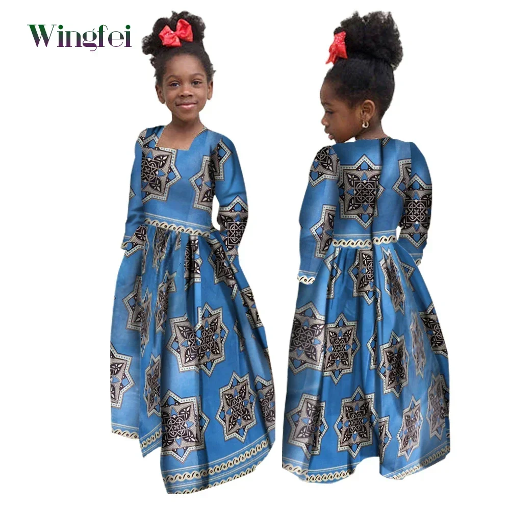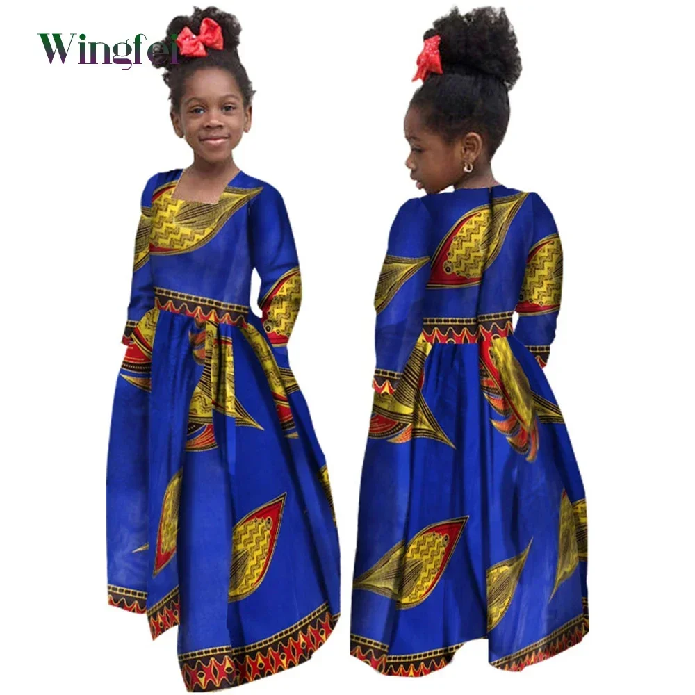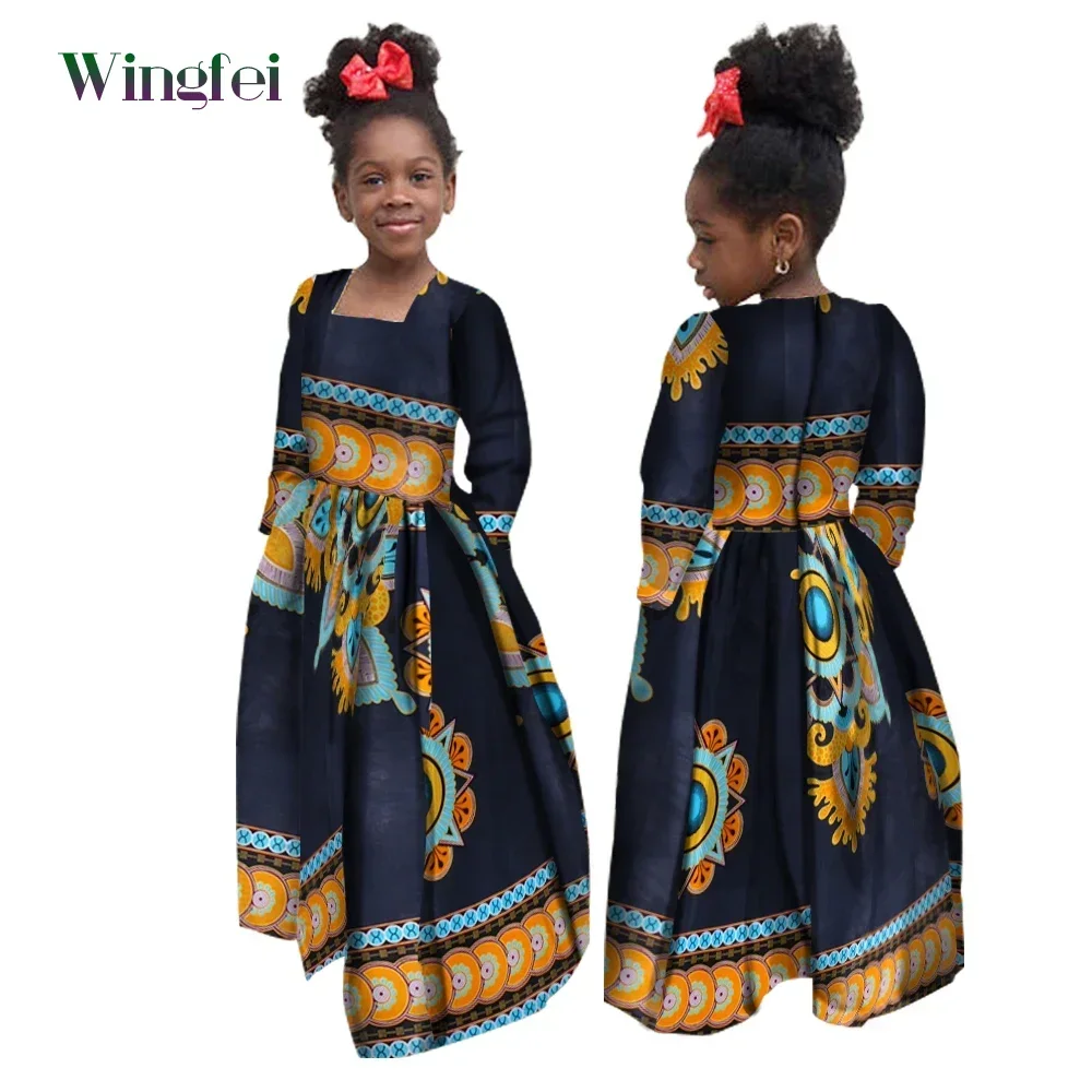 African Girl Dress Kids Dashiki Ankara Floral Print Dress Wax Cotton Long Sleeve Dresses Fashion Africa Clothes for Girl WYT61