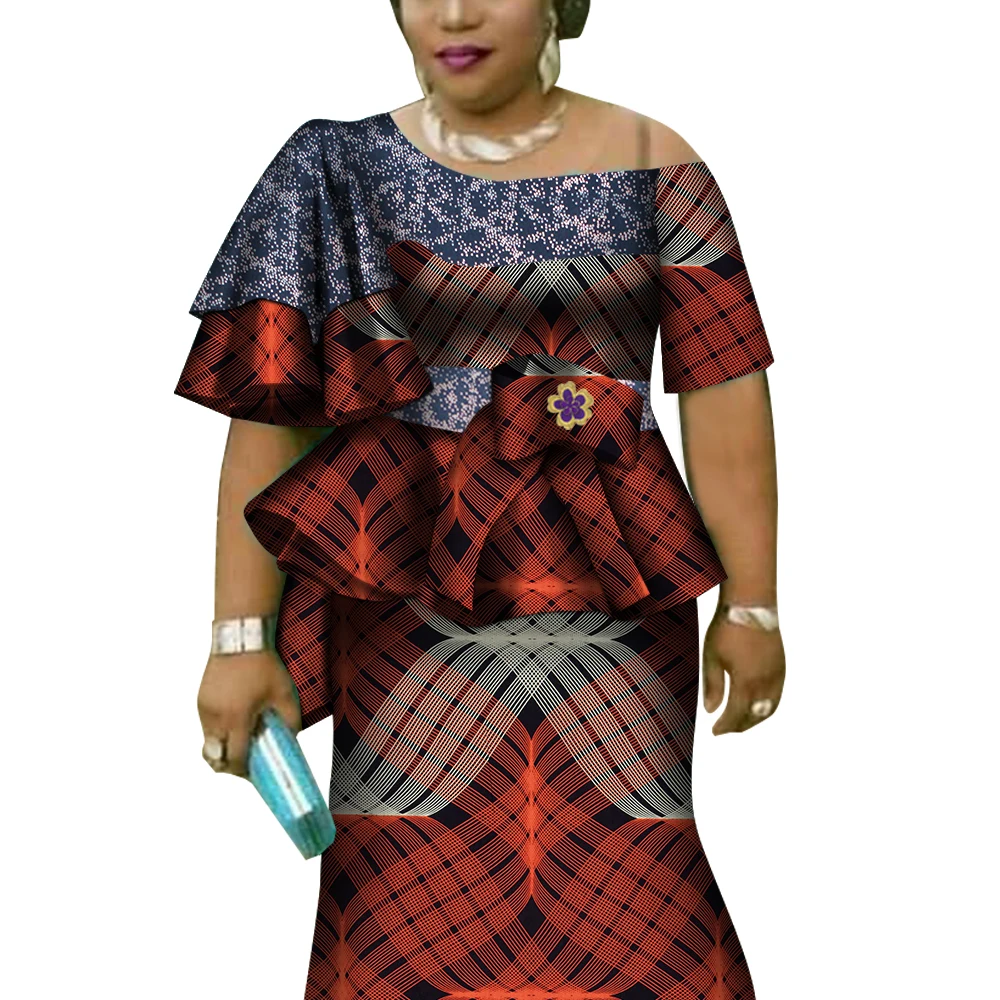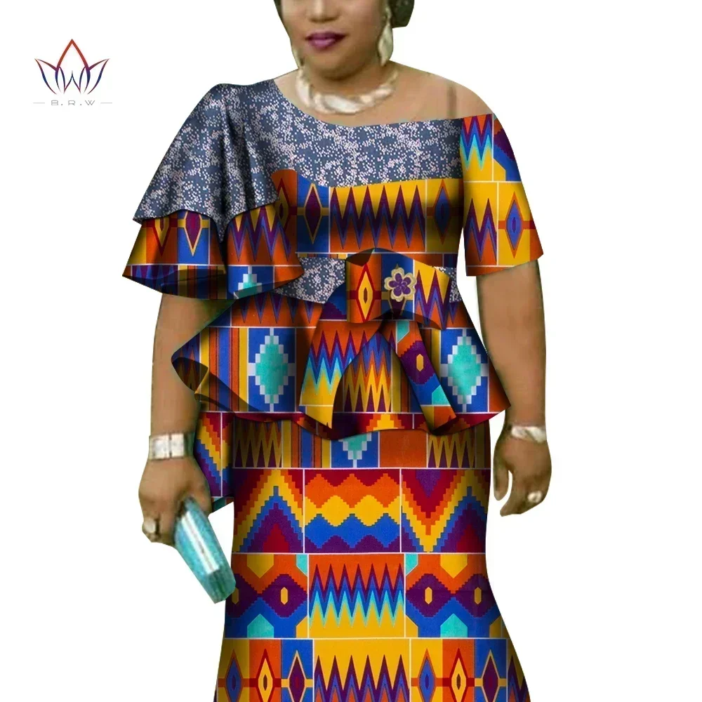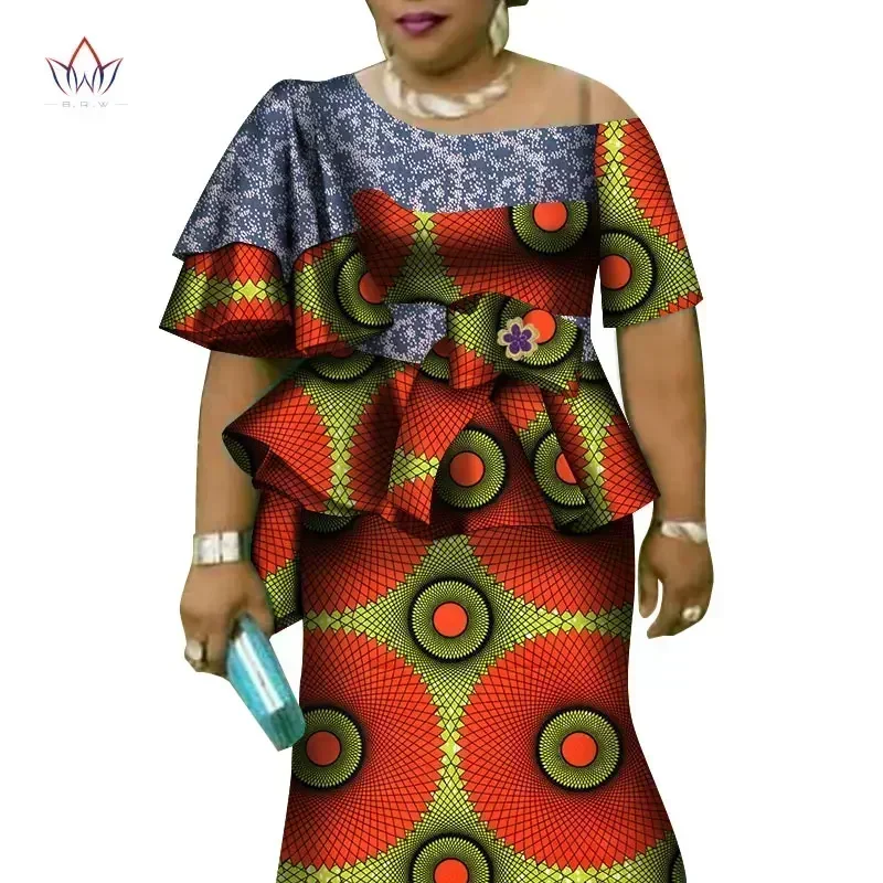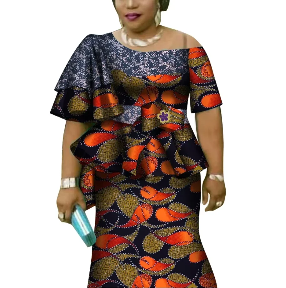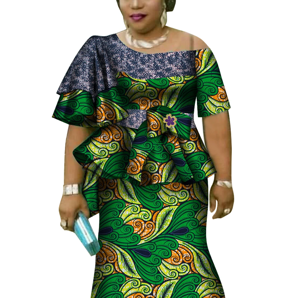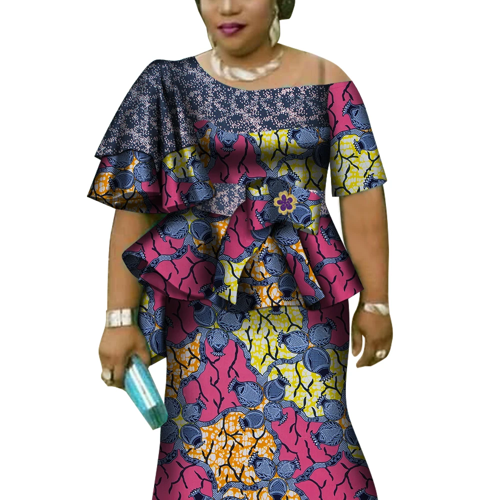 African Ruffles Sleeve Print Tops and Skirt Sets for Women Bazin Riche African Clothing 2 Pieces Customize Skirts Sets WY4392