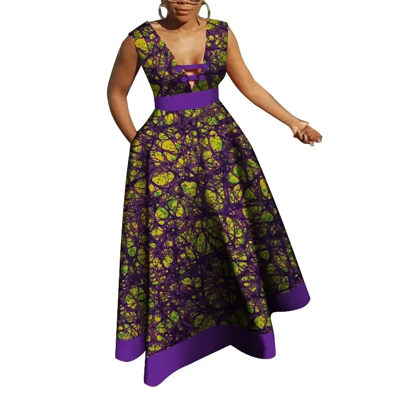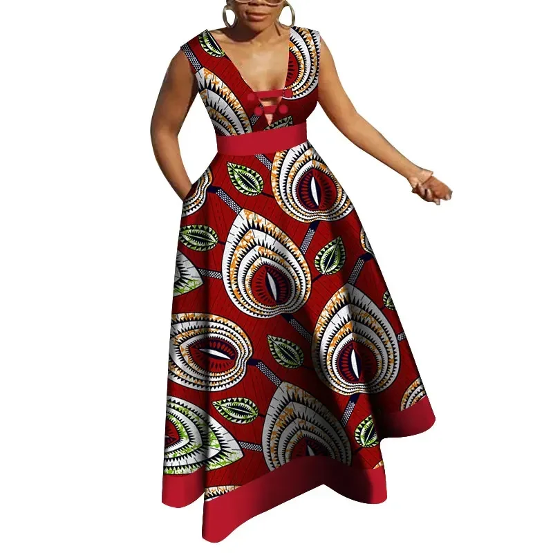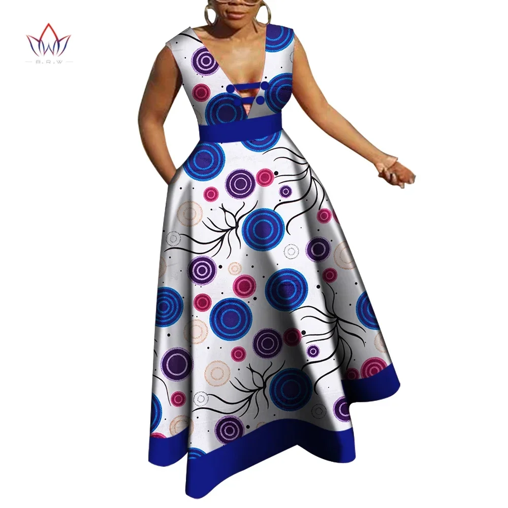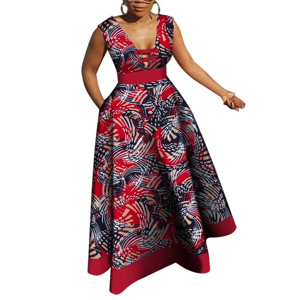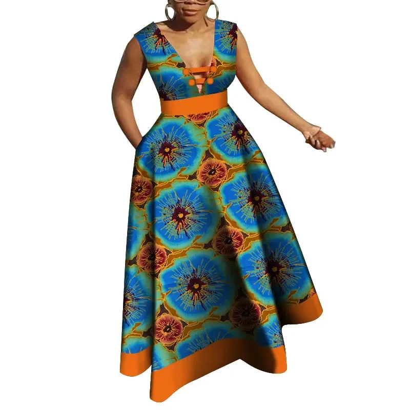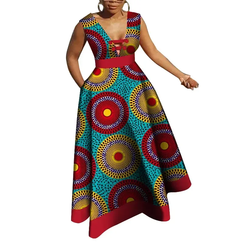 Bazin Riche African Dresses for Women Dashiki Patchwork Wax Print Evening Long V-neck Dresses Women African Clothing WY4176