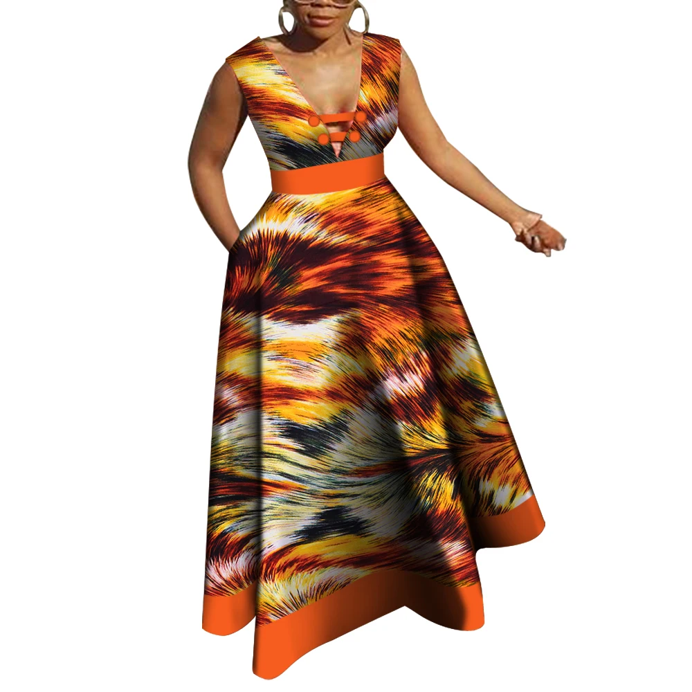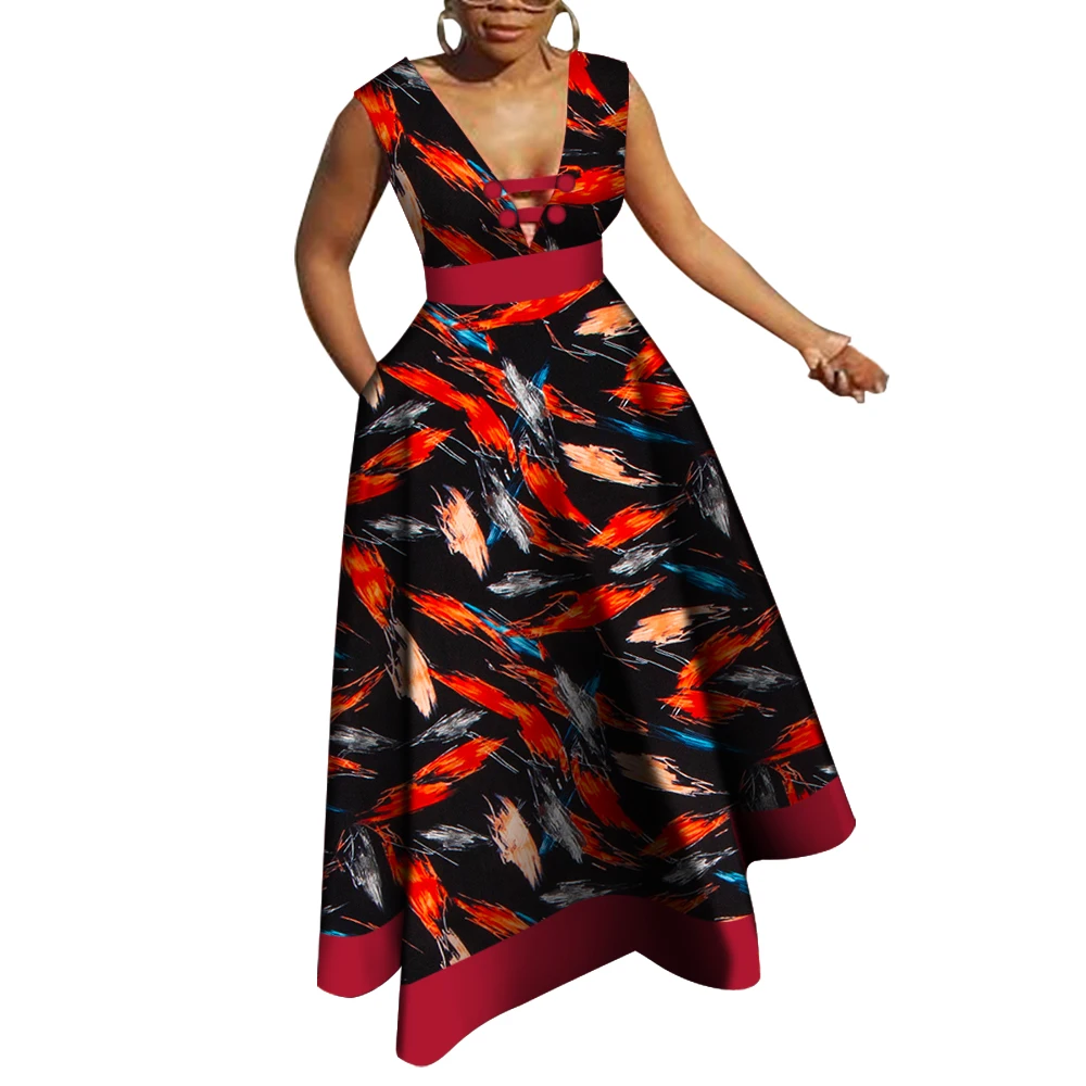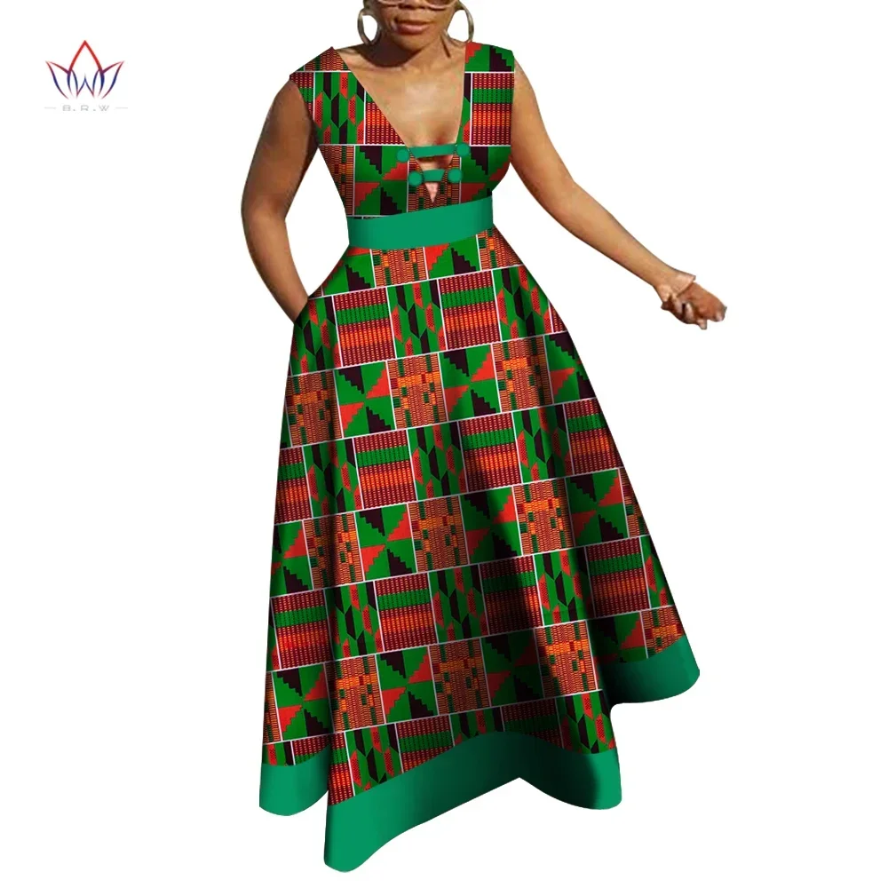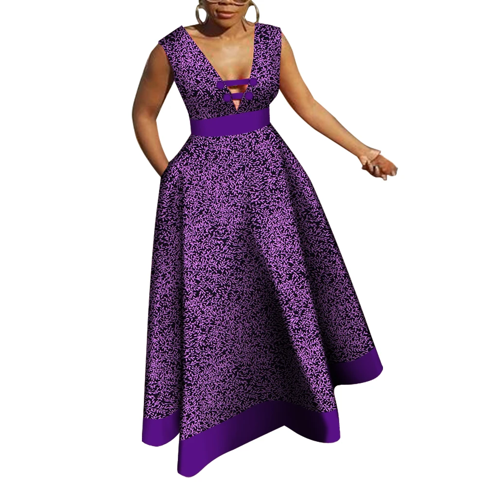 Bazin Riche African Dresses for Women Dashiki Patchwork Wax Print Evening Long V-neck Dresses Women African Clothing WY4176