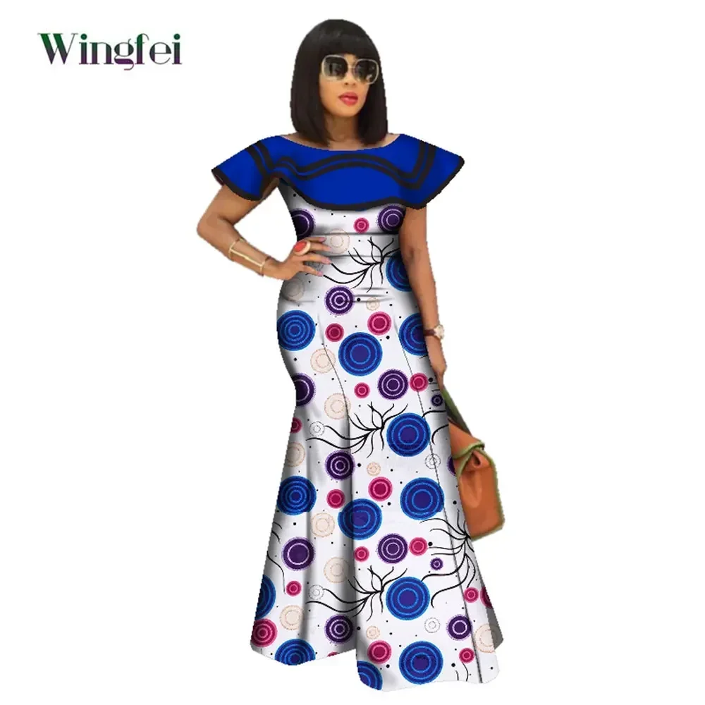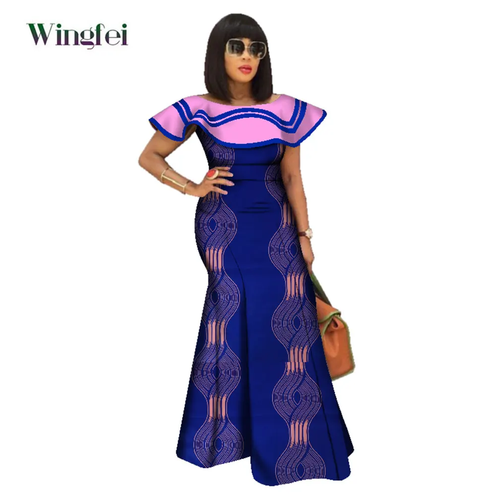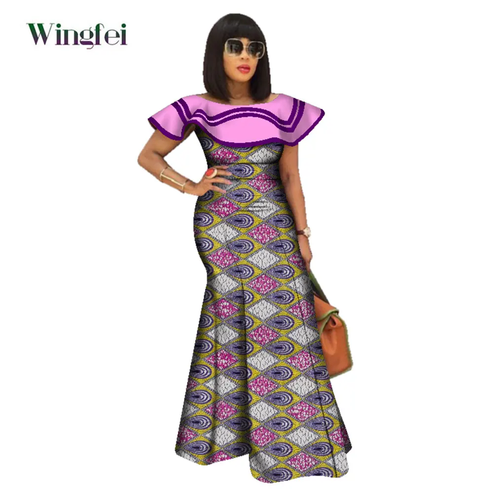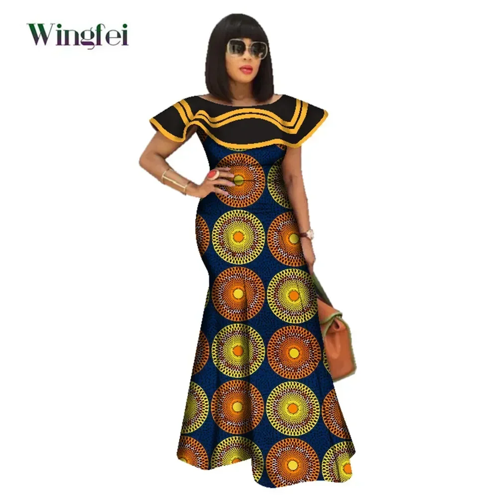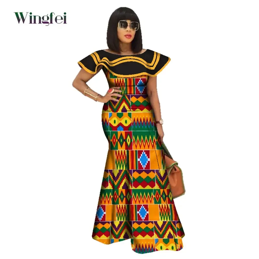 Bazin Riche African Print Dresses for Women Splice Ruffle Neck Long Maxi Dresses Dashiki African Women Clothing WY2550