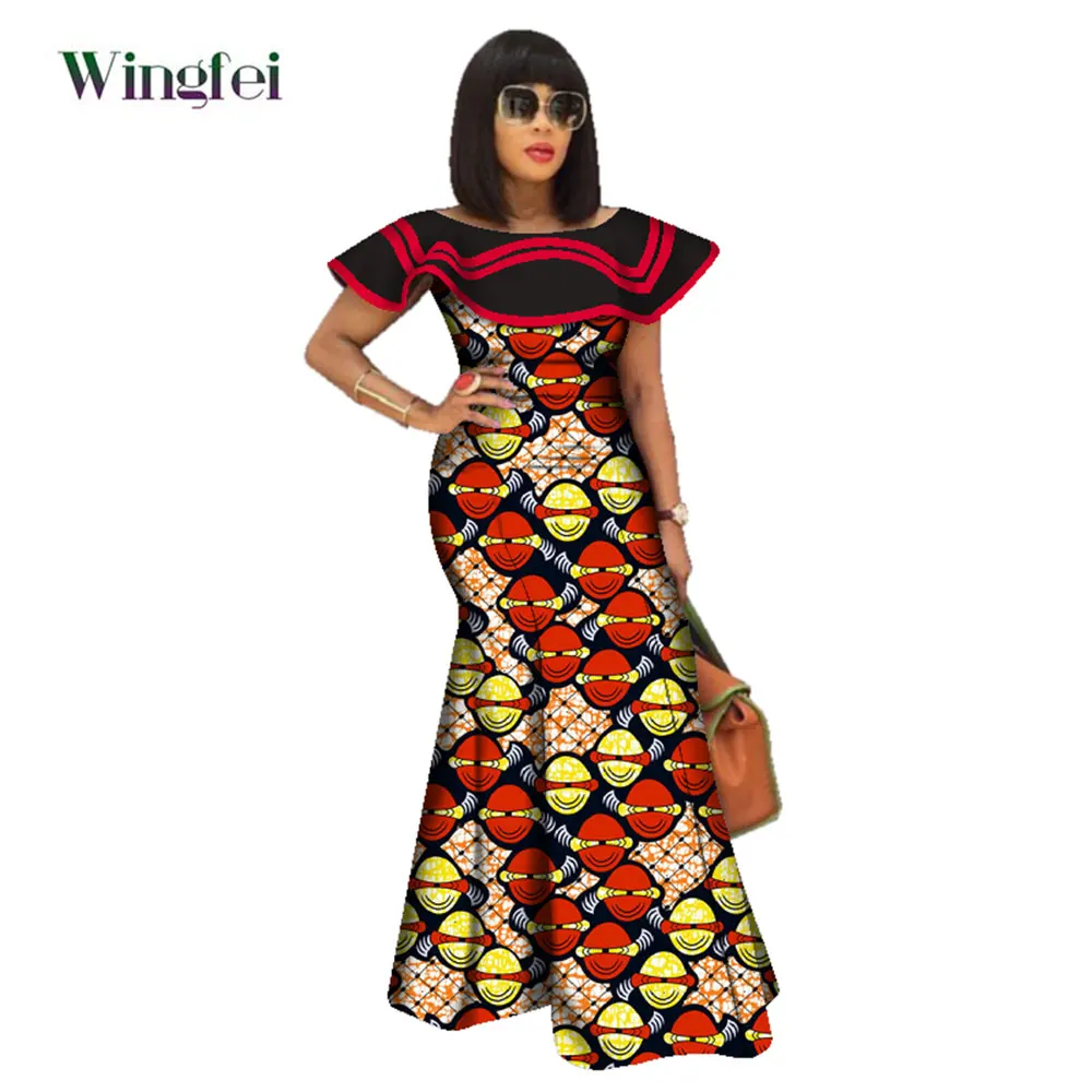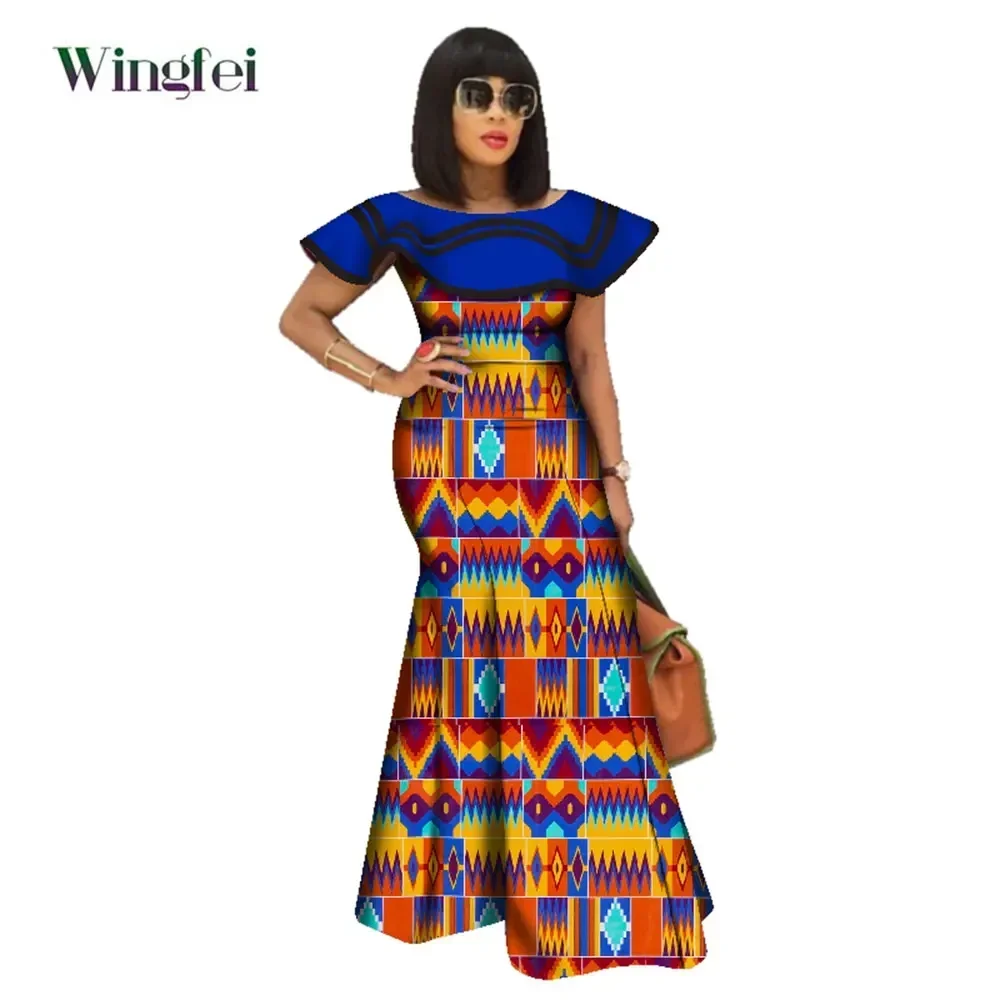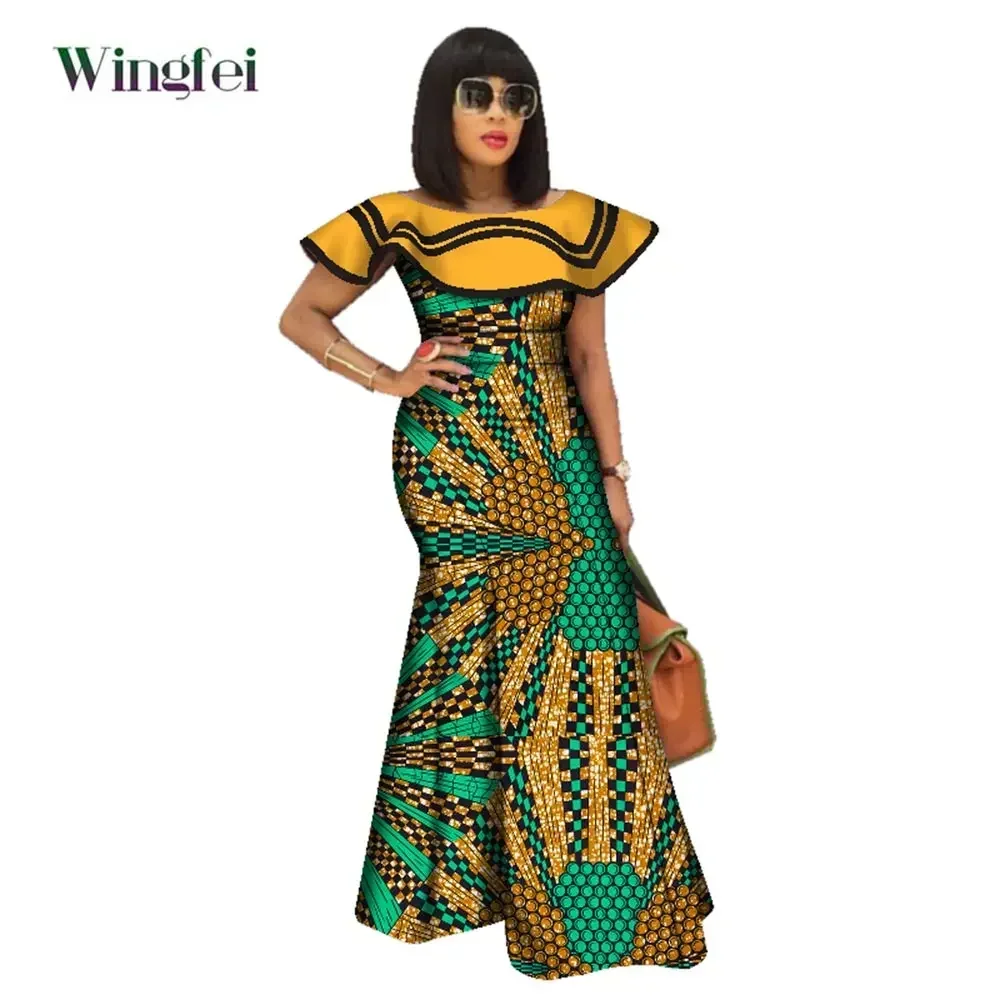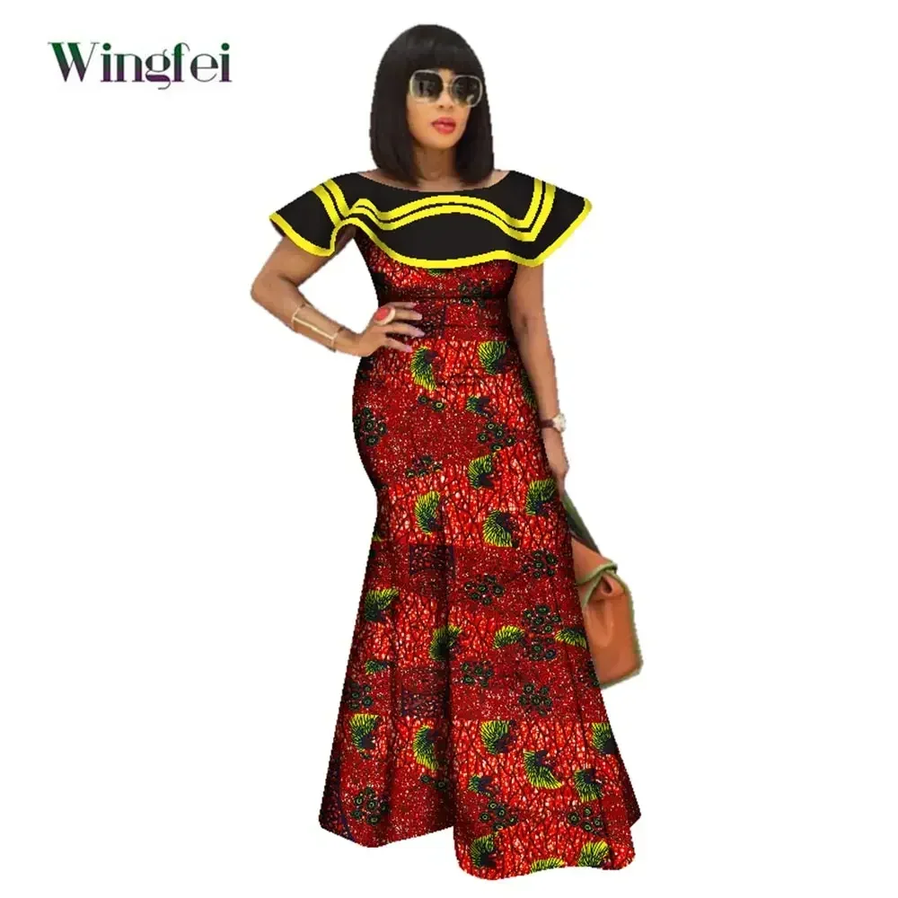 Bazin Riche African Print Dresses for Women Splice Ruffle Neck Long Maxi Dresses Dashiki African Women Clothing WY2550