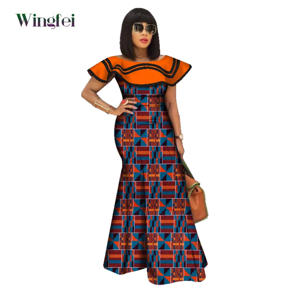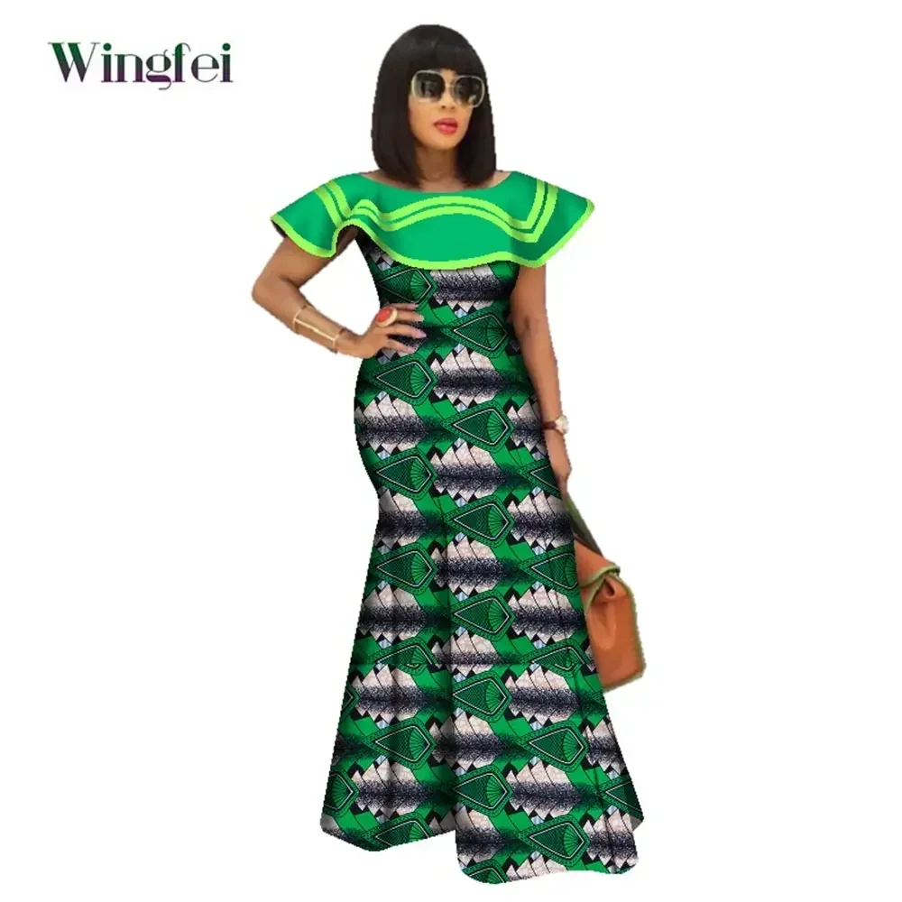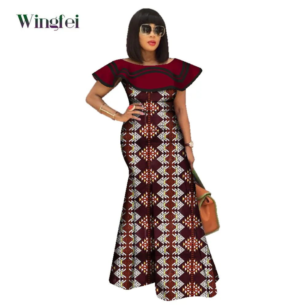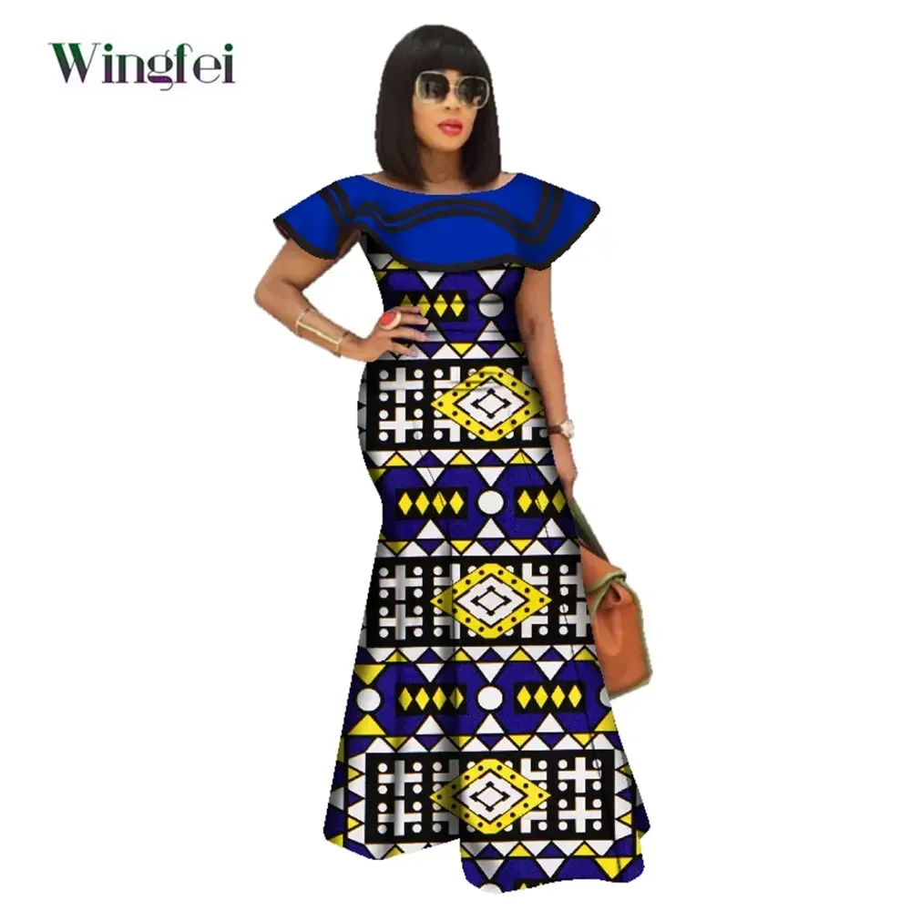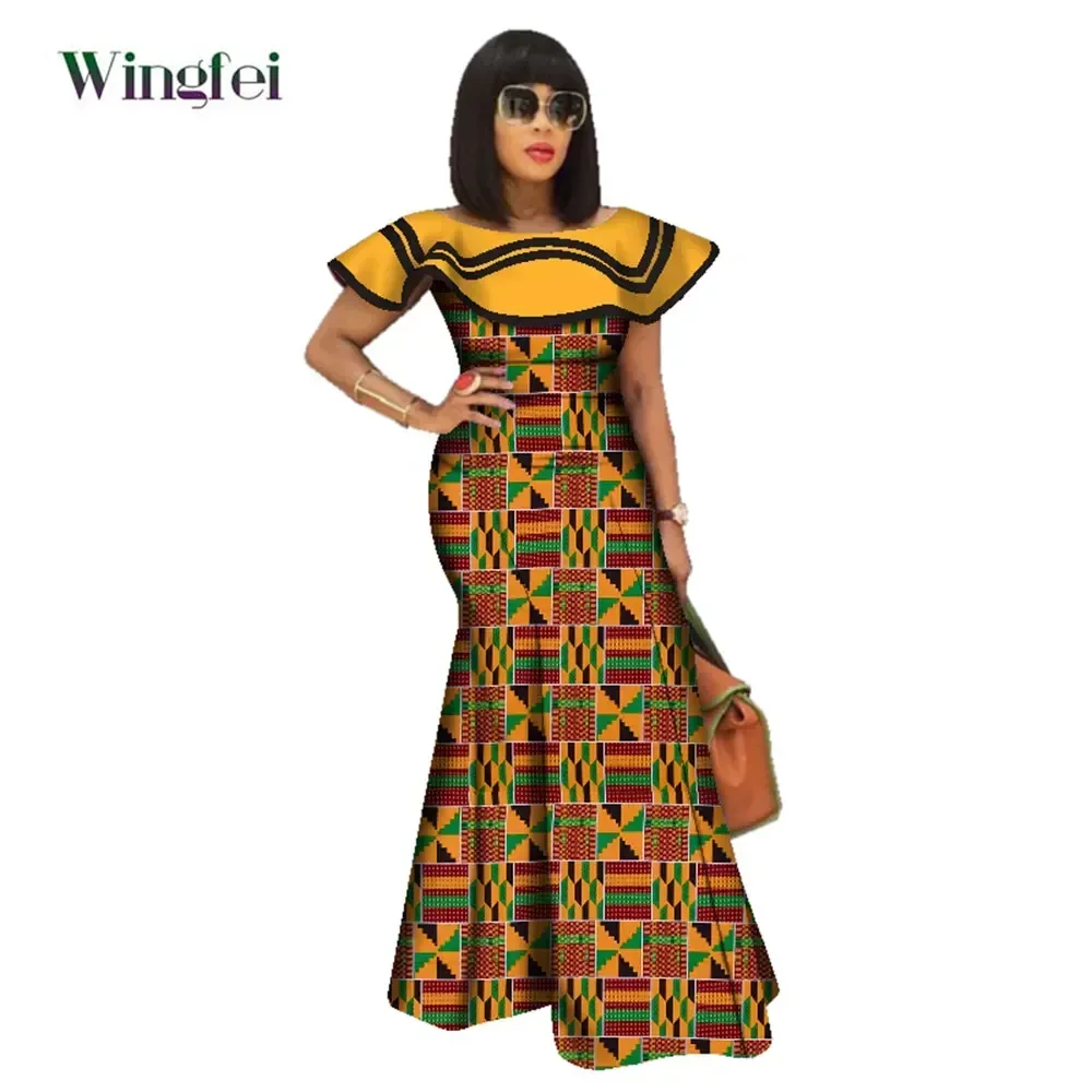 Bazin Riche African Print Dresses for Women Splice Ruffle Neck Long Maxi Dresses Dashiki African Women Clothing WY2550