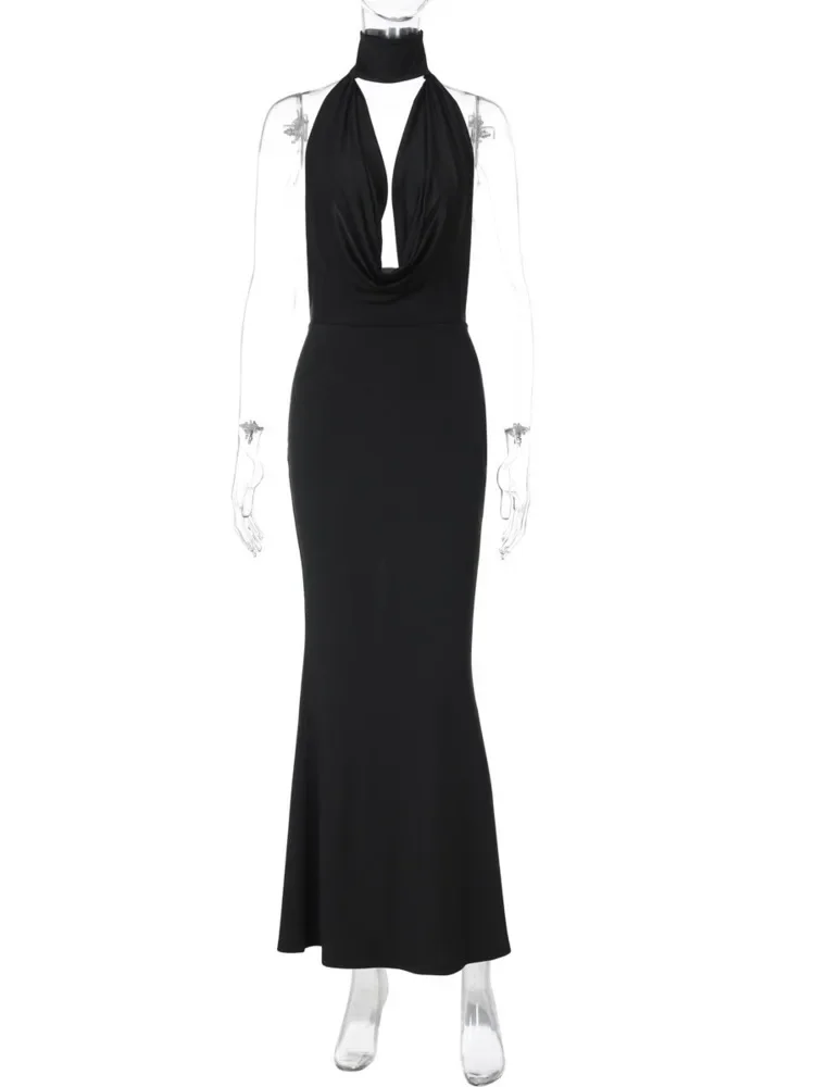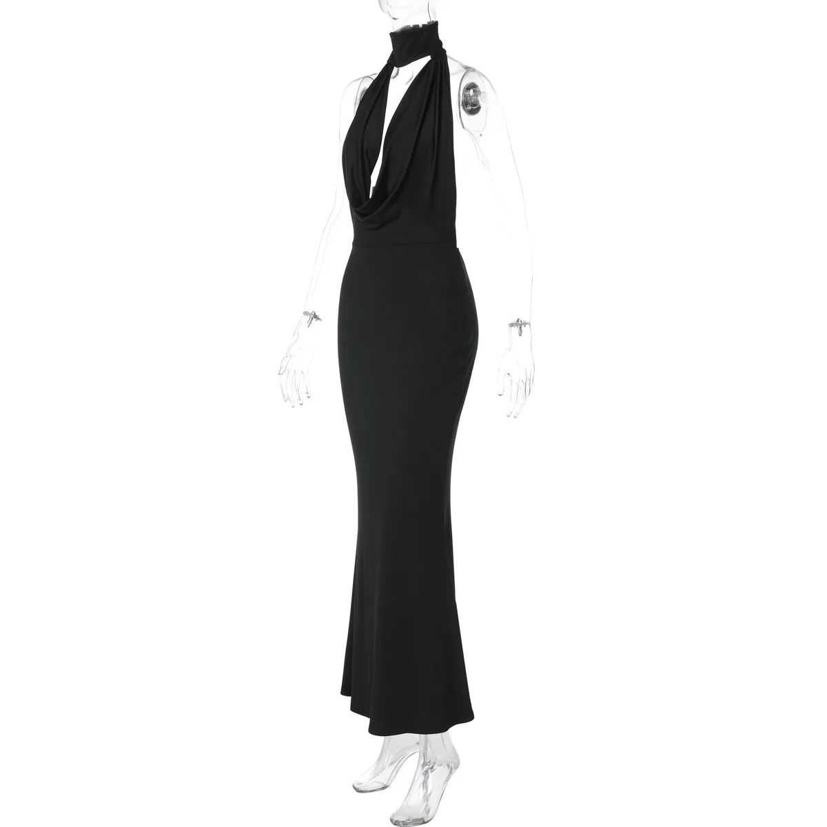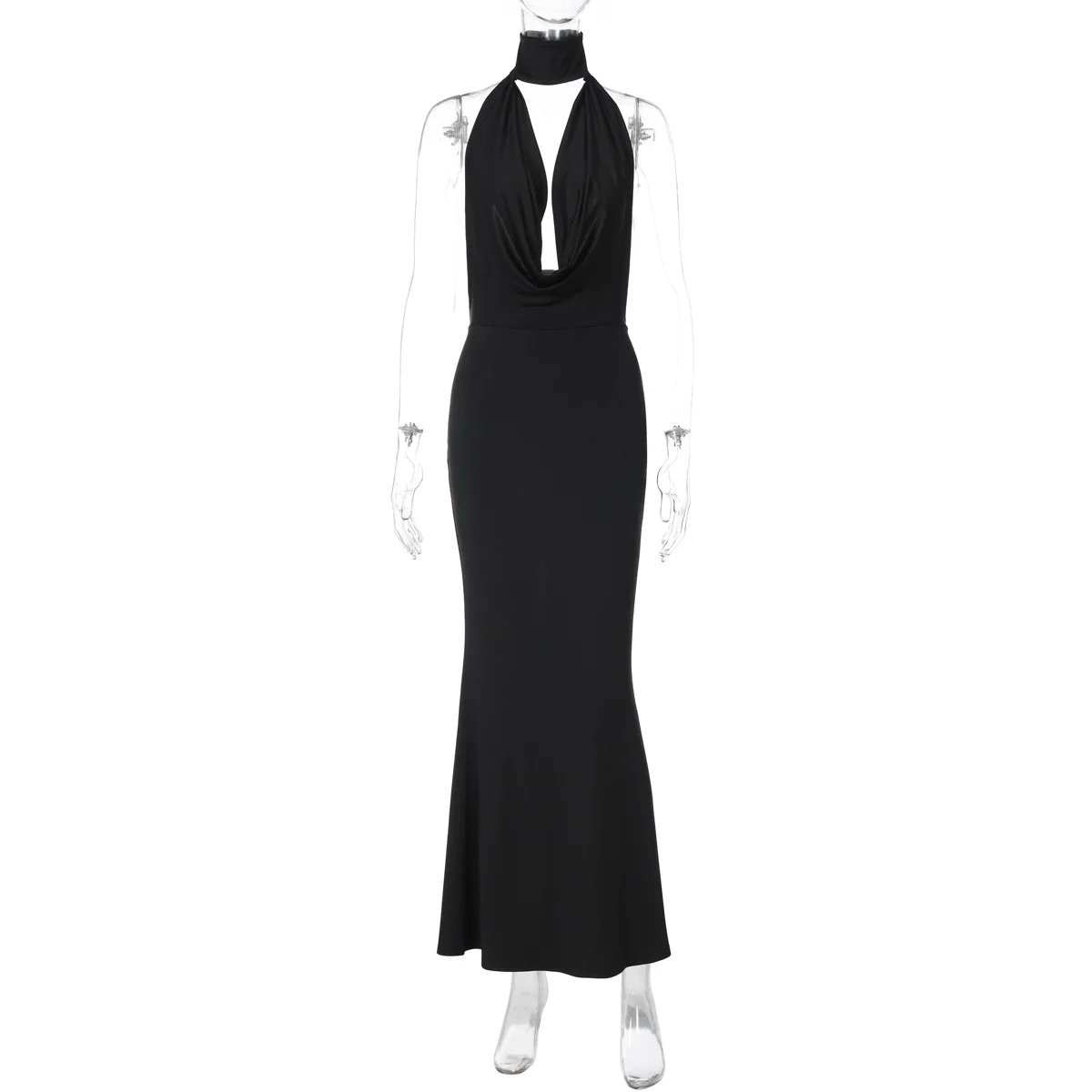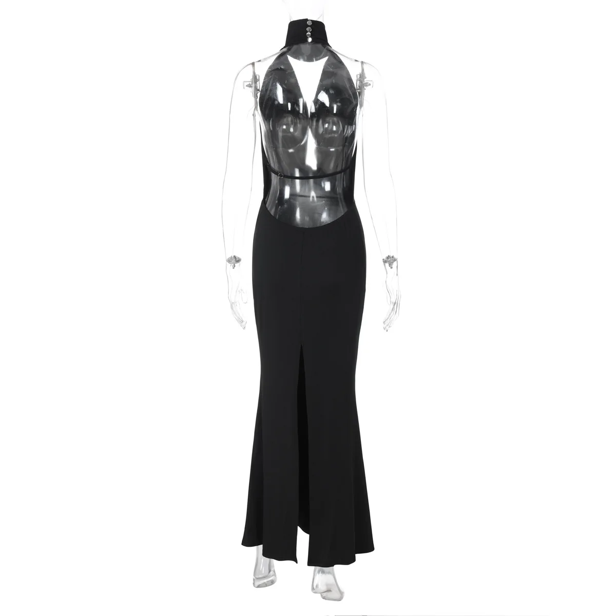 Chaxiaoa Halter Hollow Out Backless Sexy Maxi Dress Women Fashion Off-shoulder Sleeveless Bodycon Split Club Party Long Dress