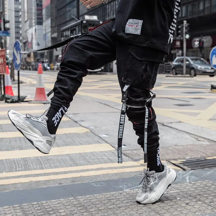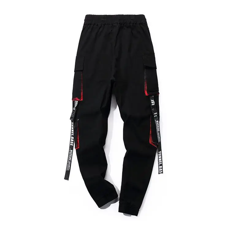 Classic Streetwear Hip Hop Joggers Men Letter Ribbons Cargo Pants Pockets Track Tactical Casual Male Trousers Sweatpant K111