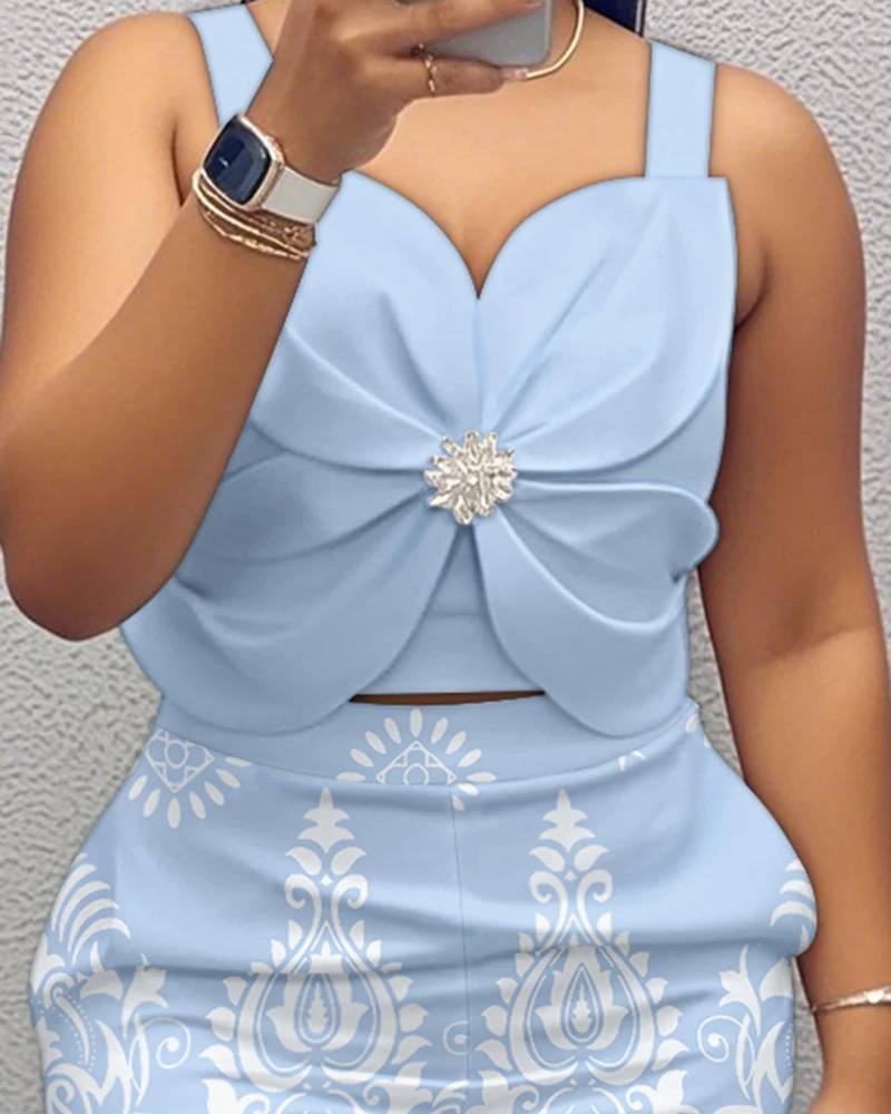 Elegant 2 Piece Sets Woman Outfit Cold Shoulder Thick Strap Bowknot Top Casual Abstract Print Pocket Shorts Set Urban Short Set