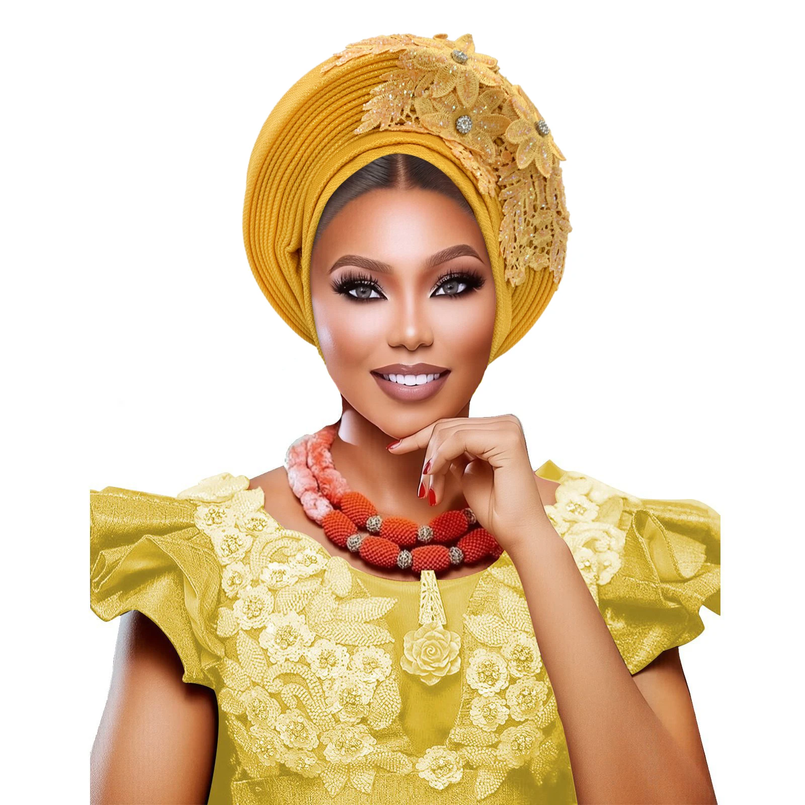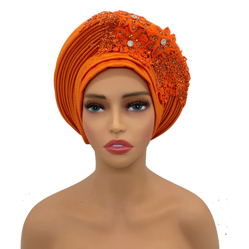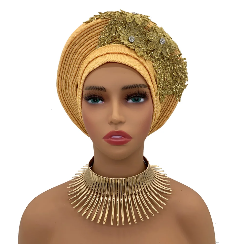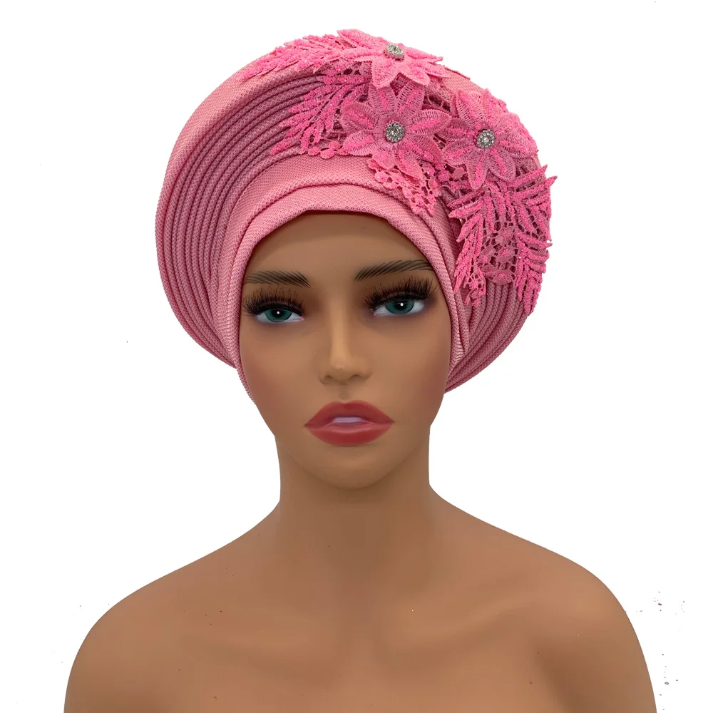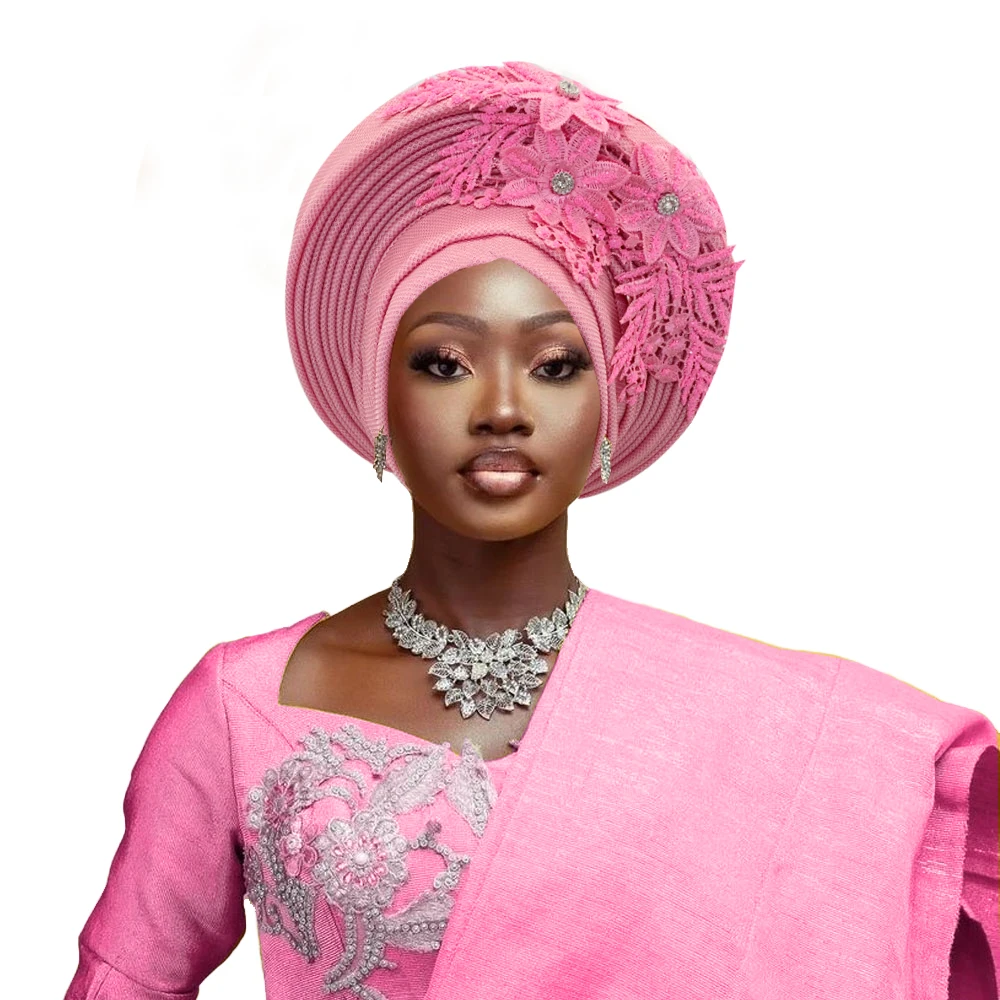 Elegant African Autogele Women's Turban Cap Nigeria Wedding Gele Ready to Wear Headtie with Embroidery Lace Party Headwear
