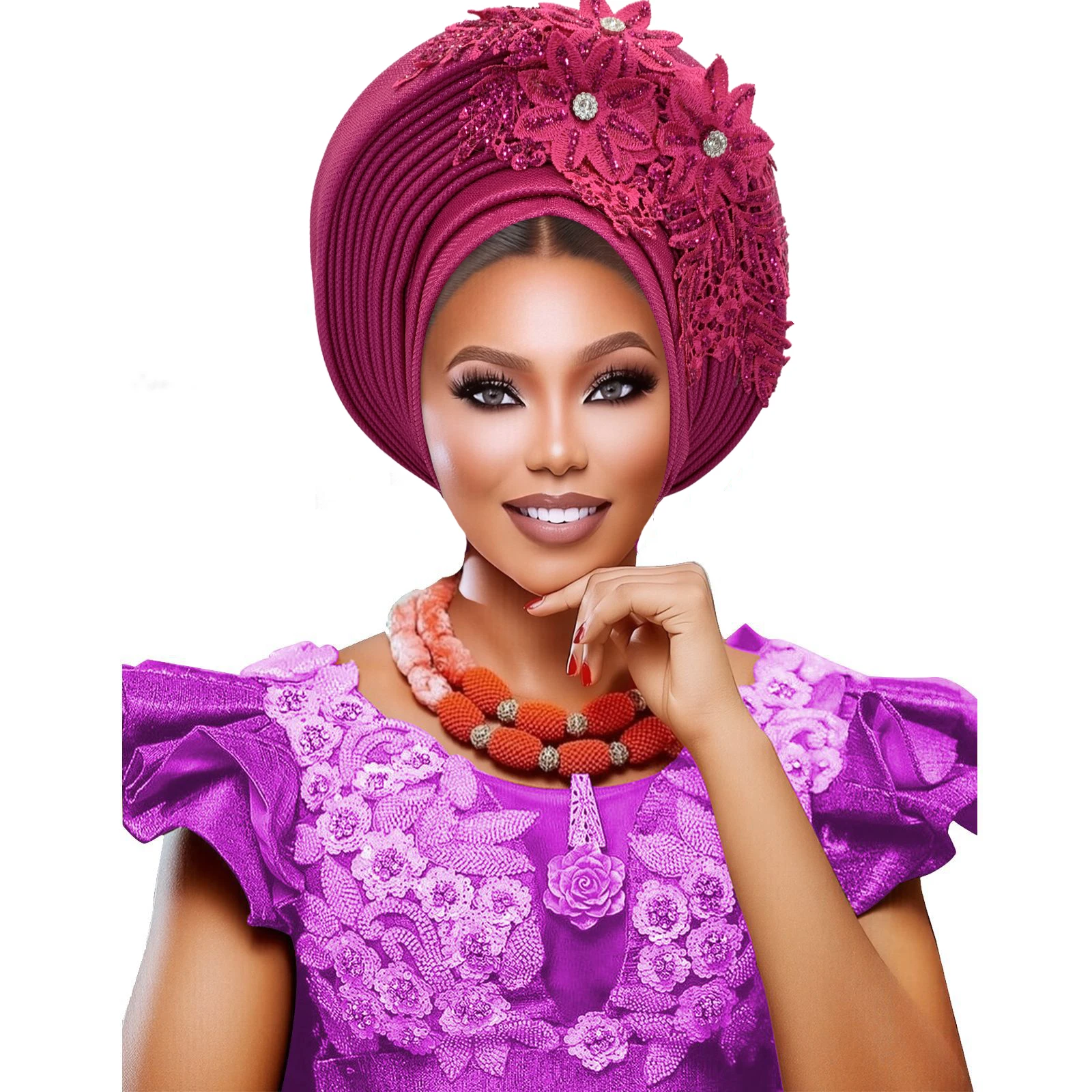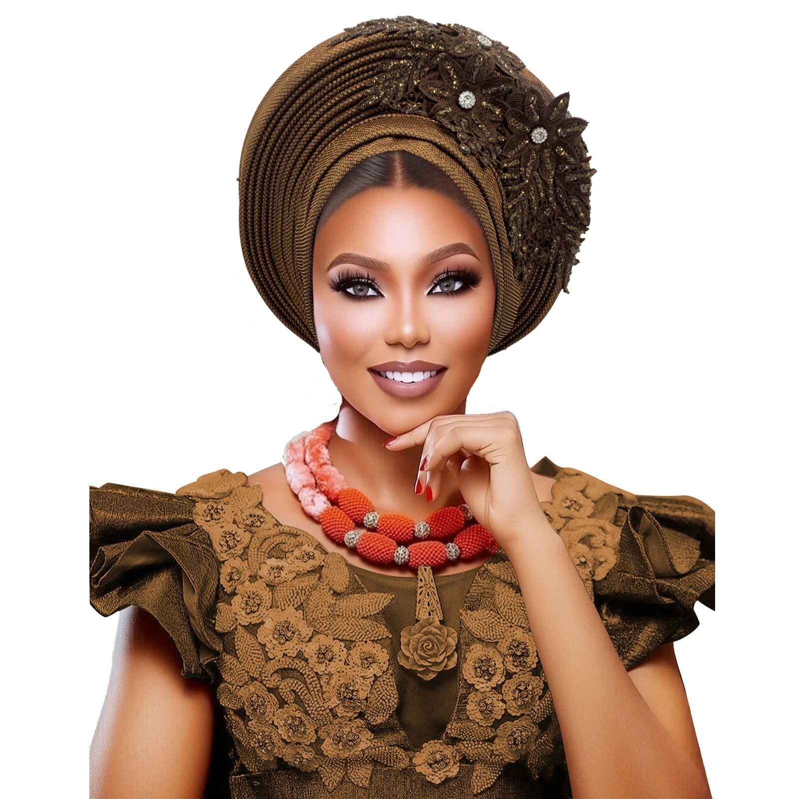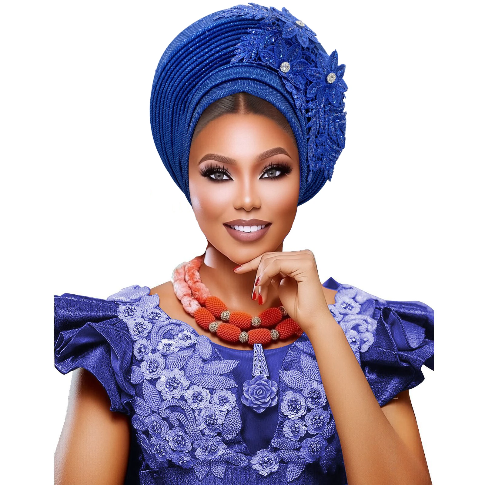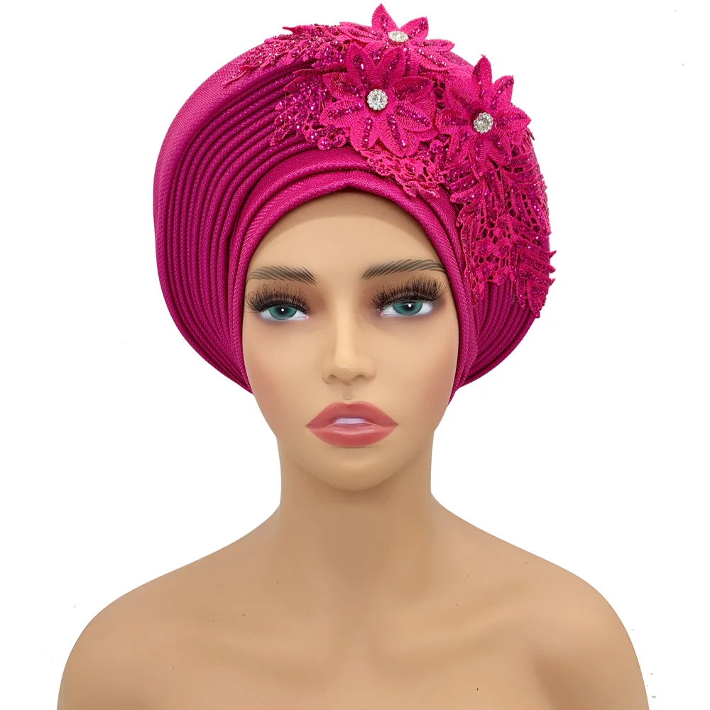 Elegant African Autogele Women's Turban Cap Nigeria Wedding Gele Ready to Wear Headtie with Embroidery Lace Party Headwear