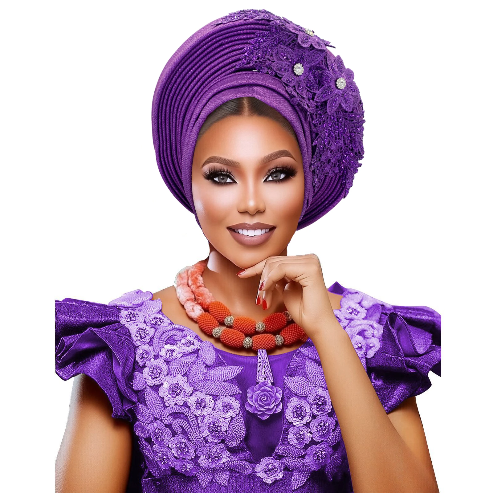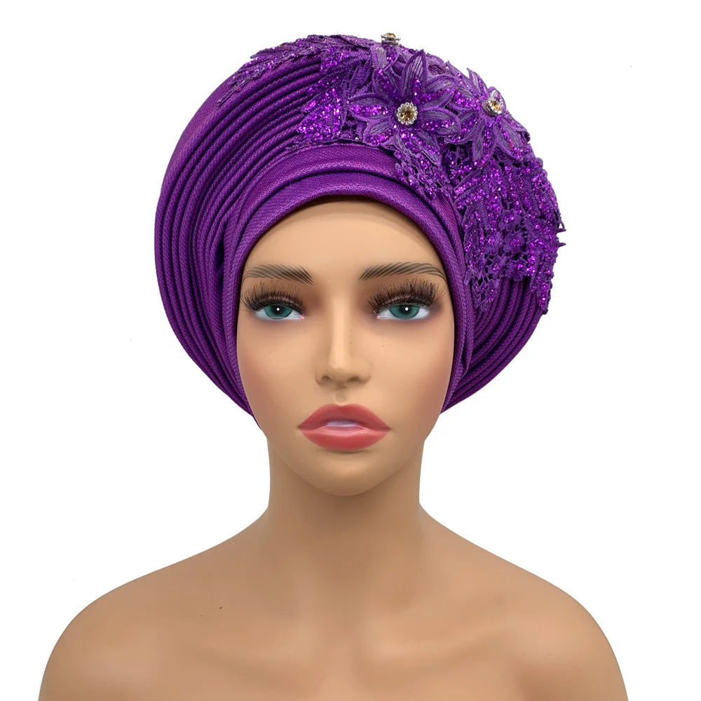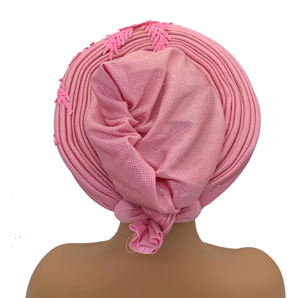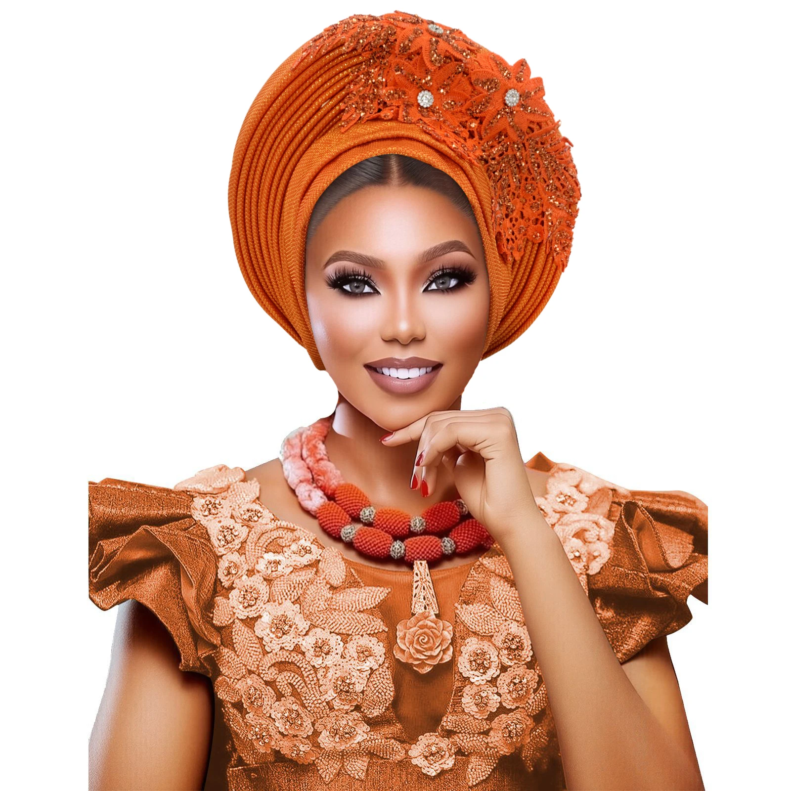 Elegant African Autogele Women's Turban Cap Nigeria Wedding Gele Ready to Wear Headtie with Embroidery Lace Party Headwear