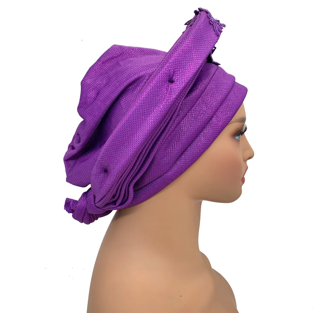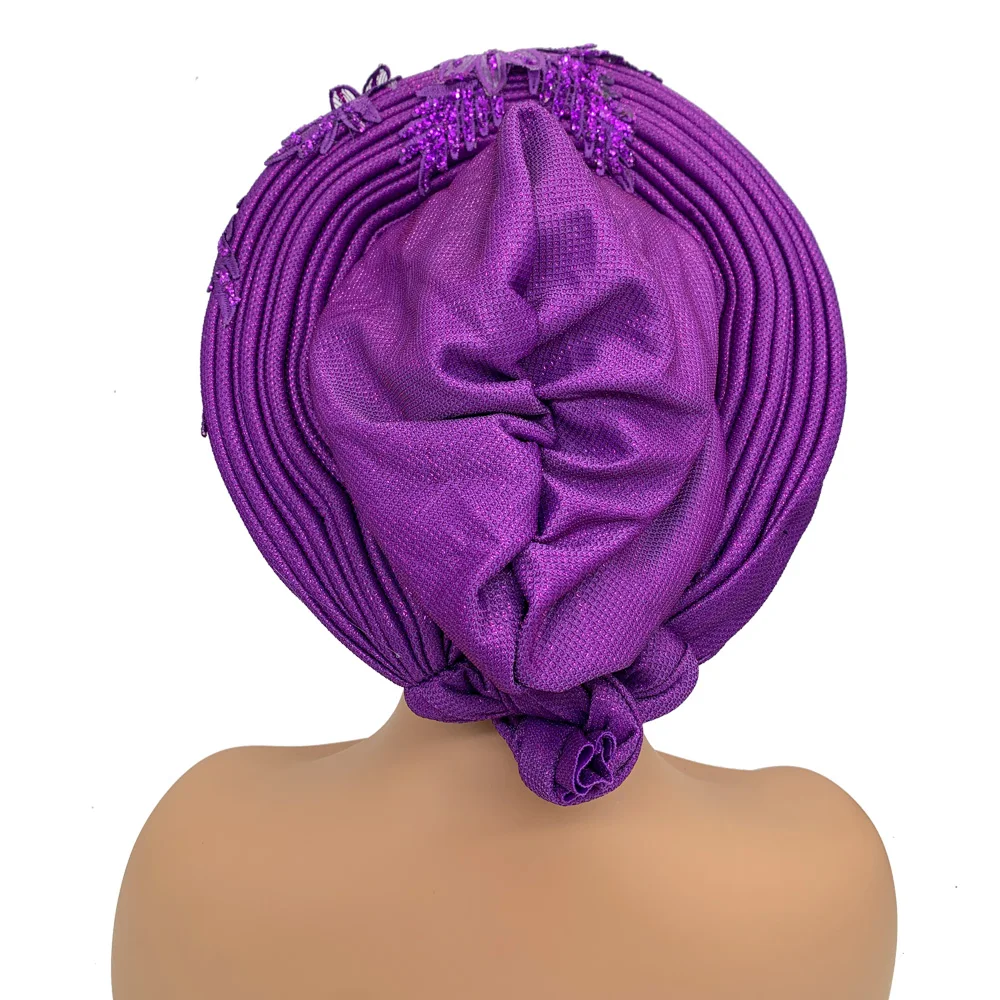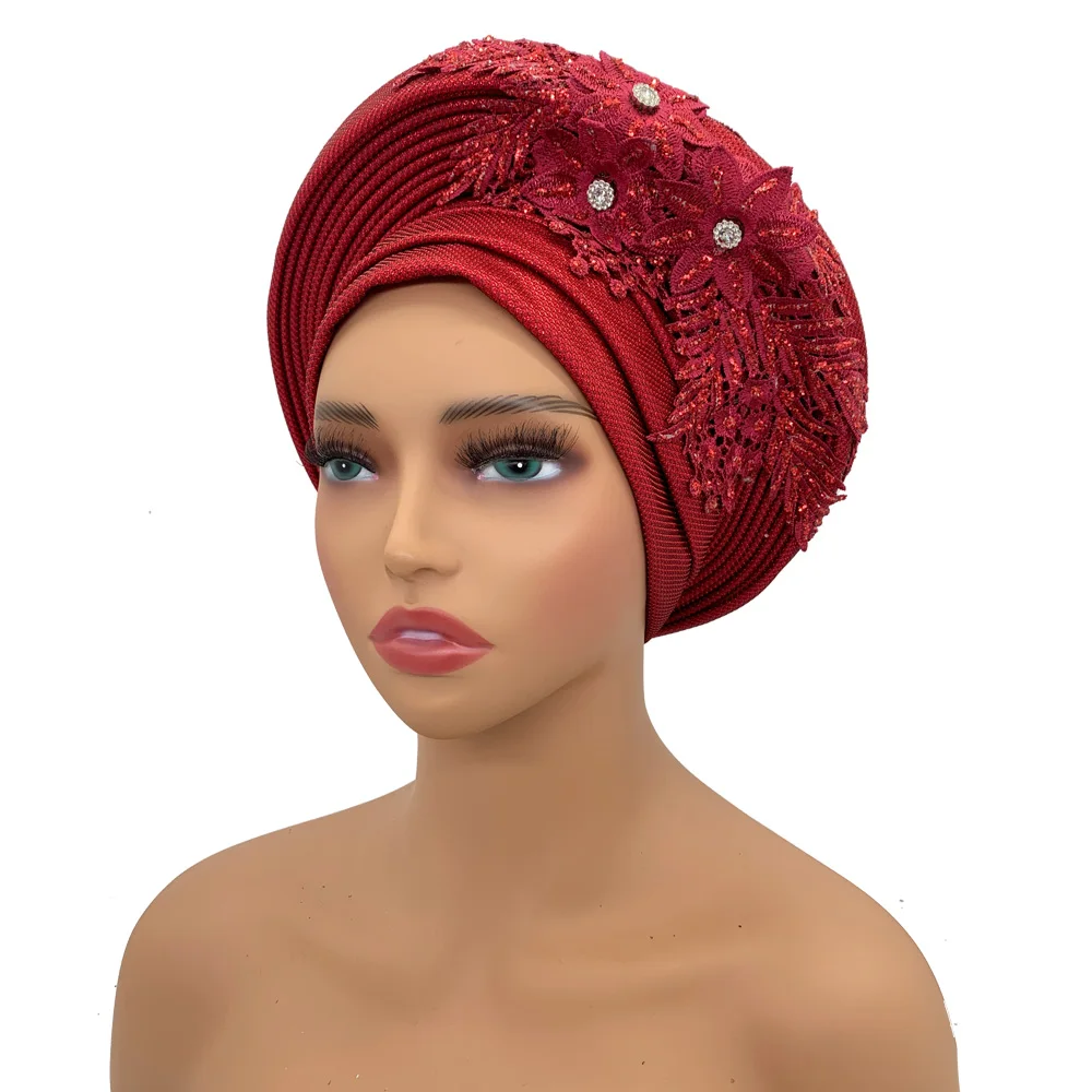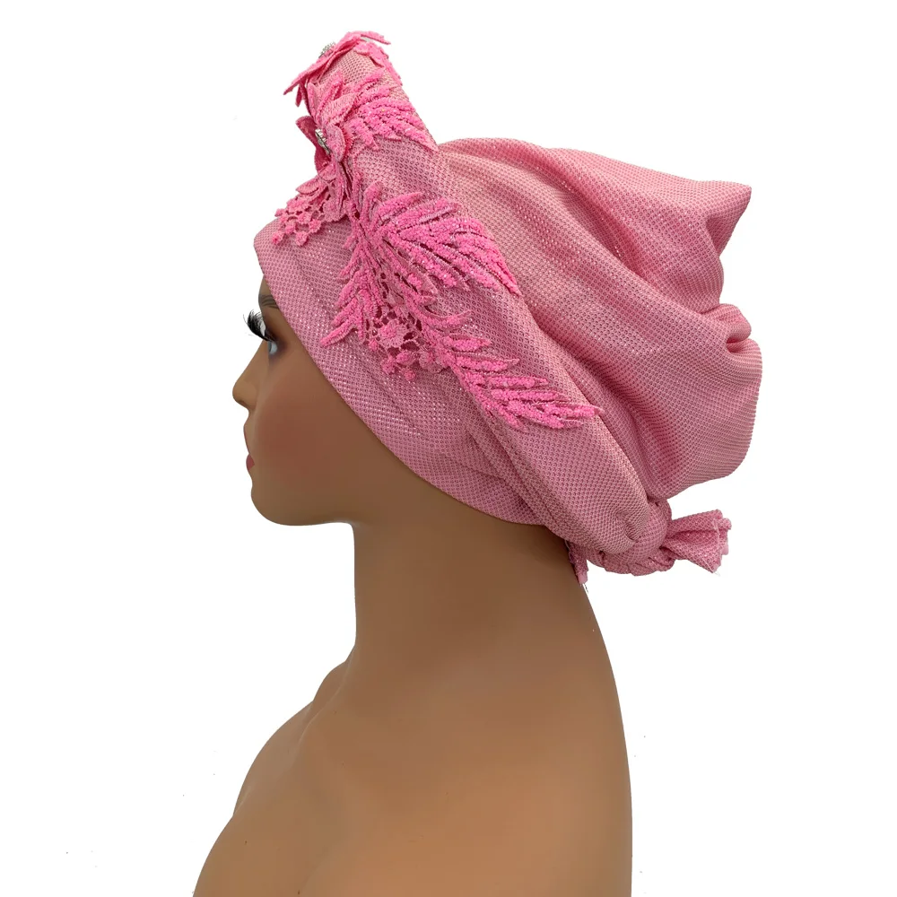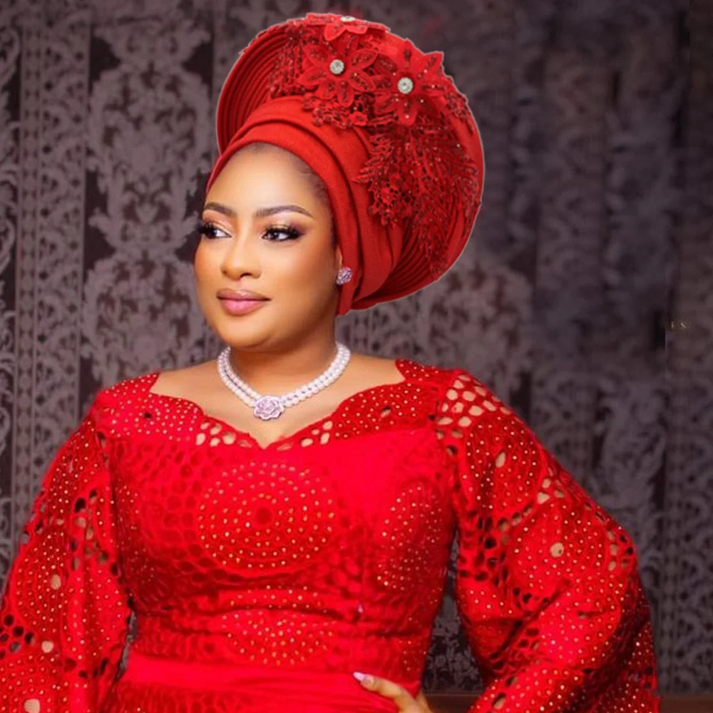 Elegant African Autogele Women's Turban Cap Nigeria Wedding Gele Ready to Wear Headtie with Embroidery Lace Party Headwear