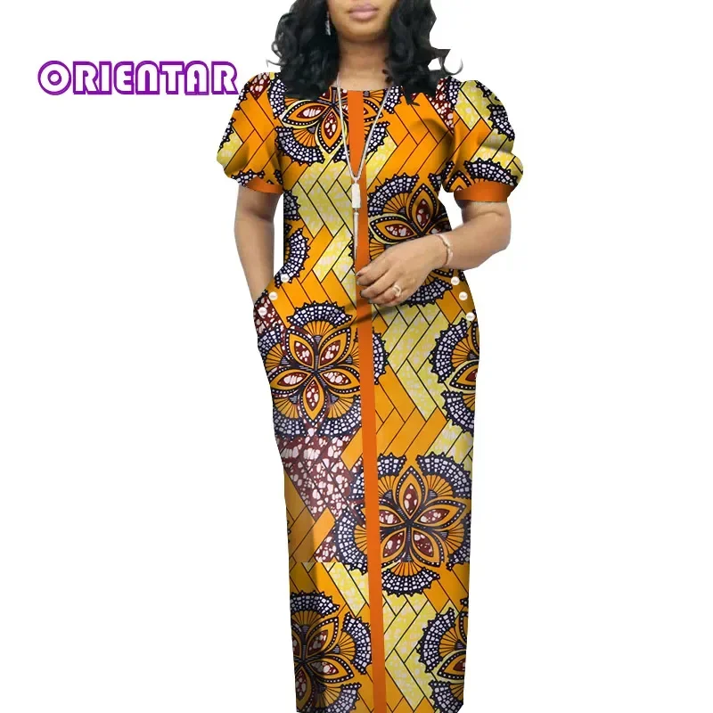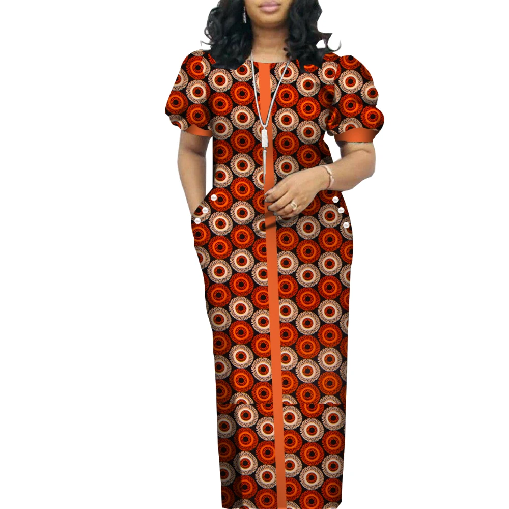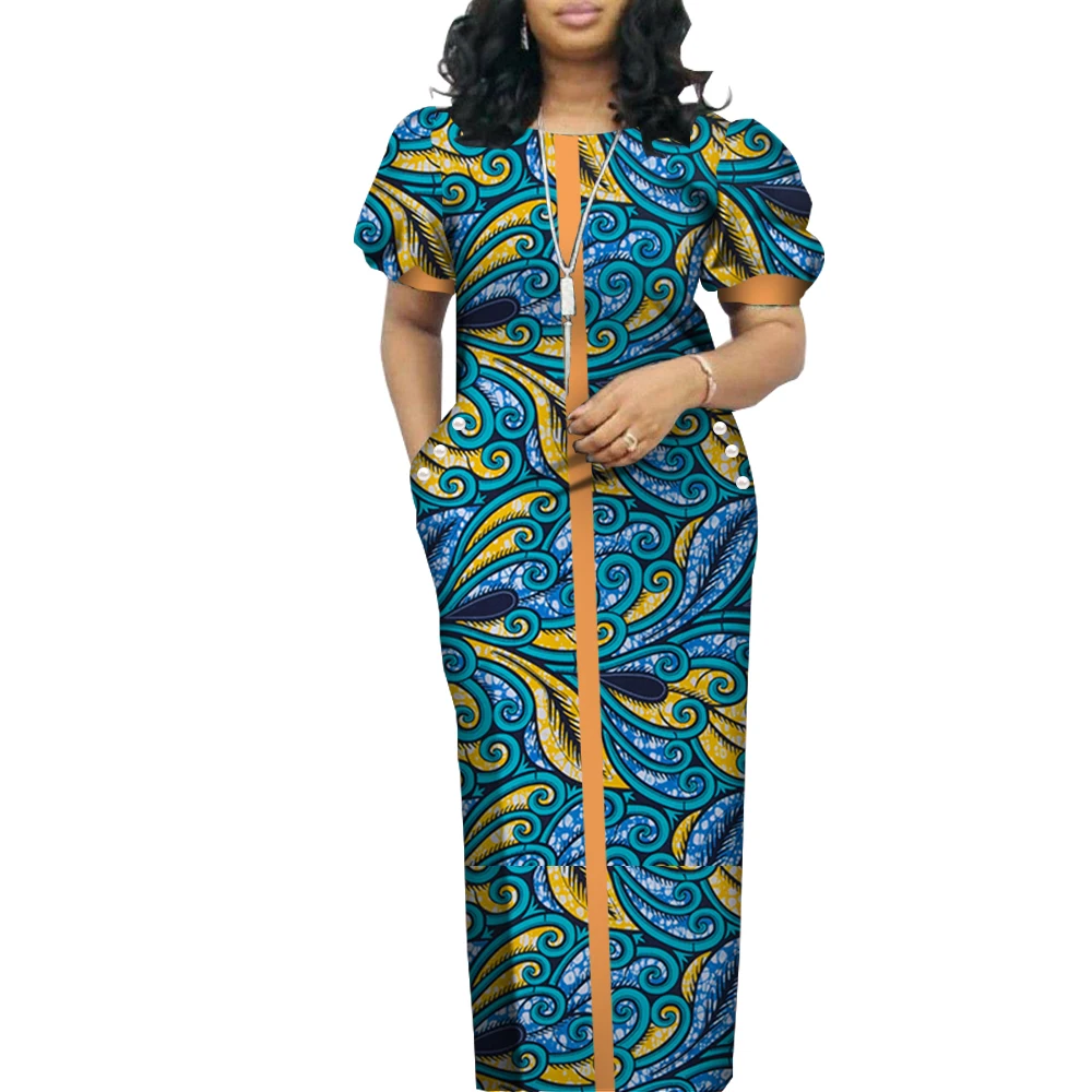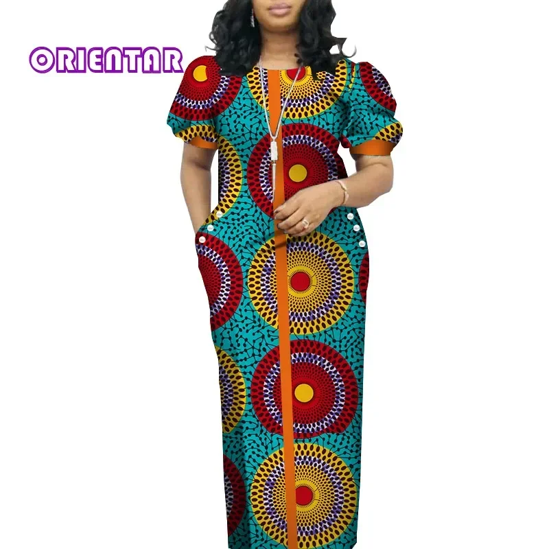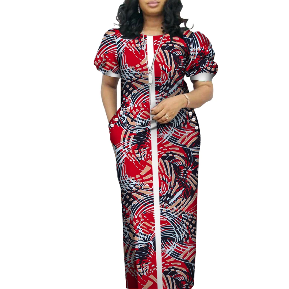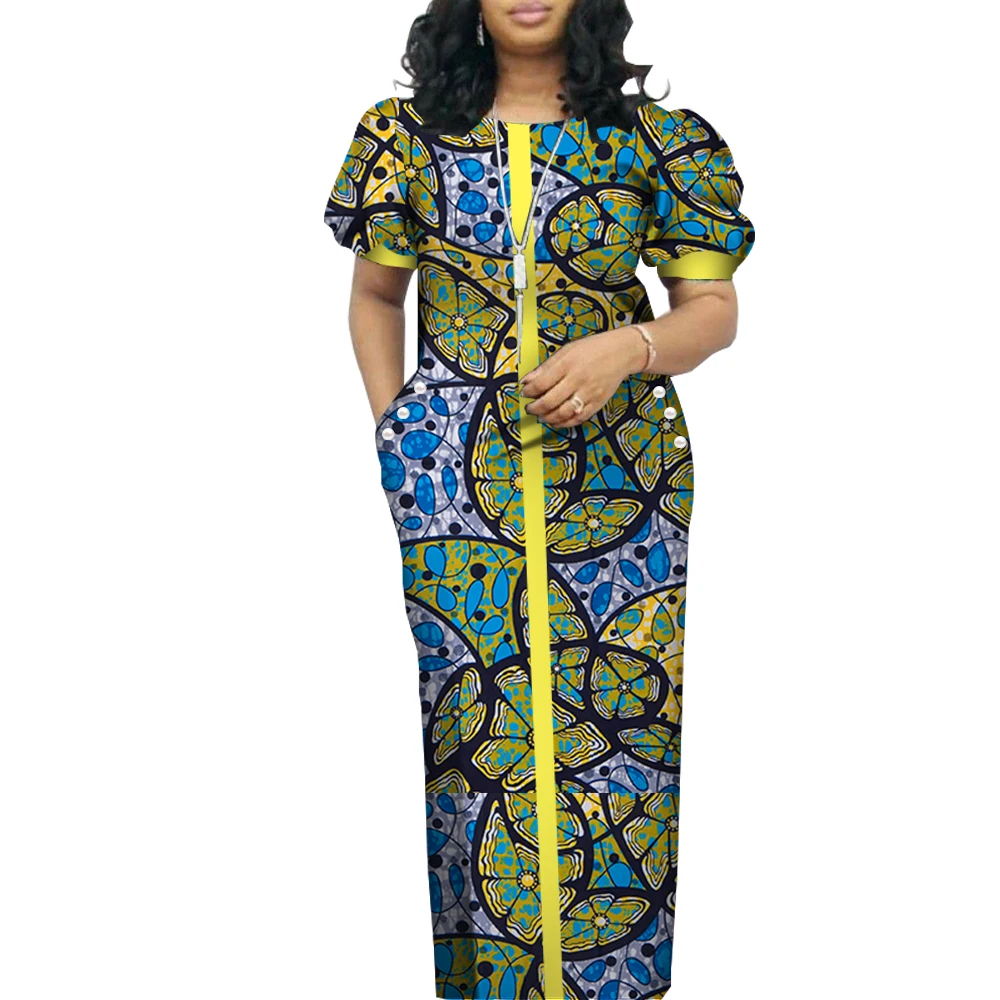 Elegant Women African Dress O-neck Short Puff Sleeve Long Maxi Dresses African Print Clothing Bazin Riche Plus Size Dress WY4542