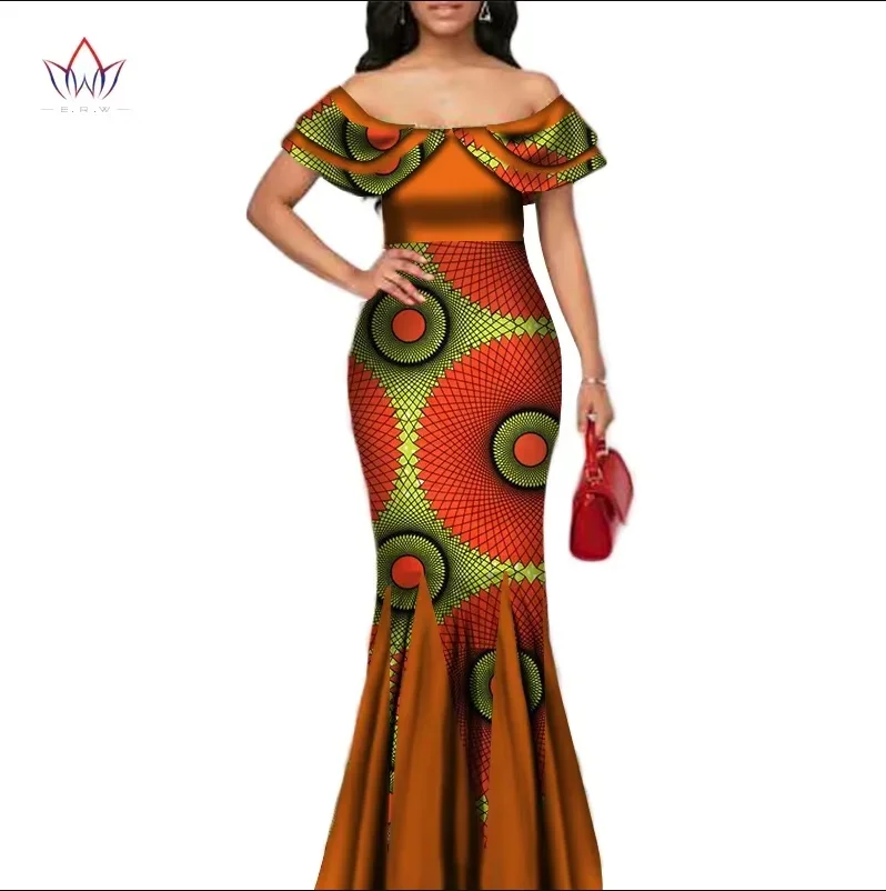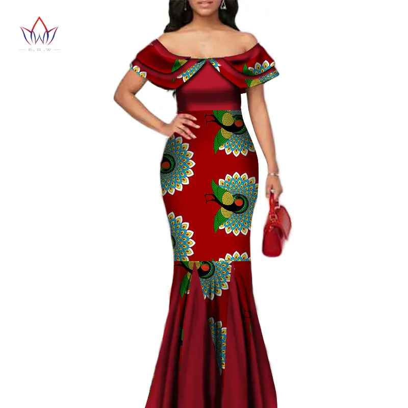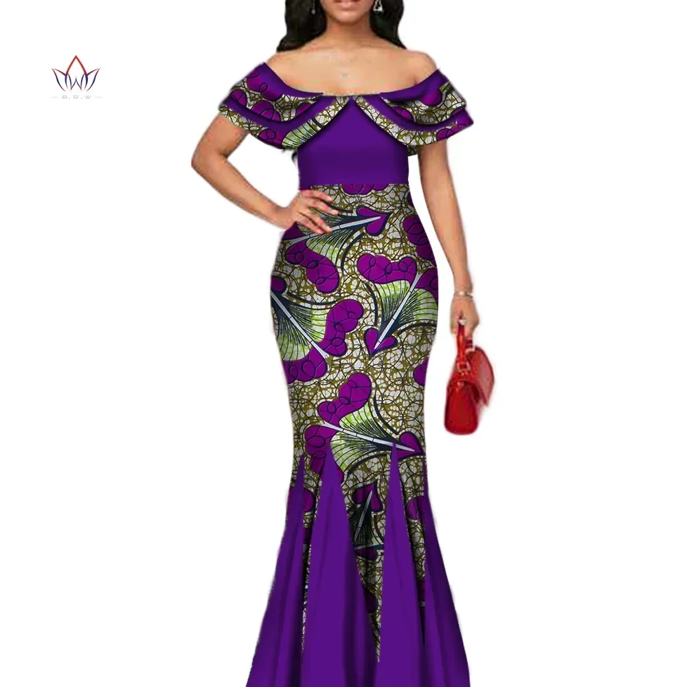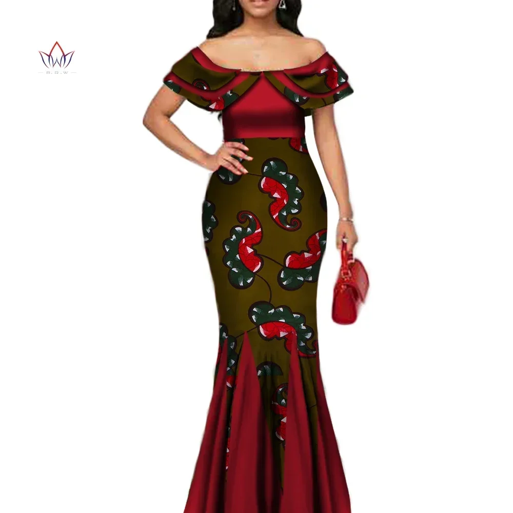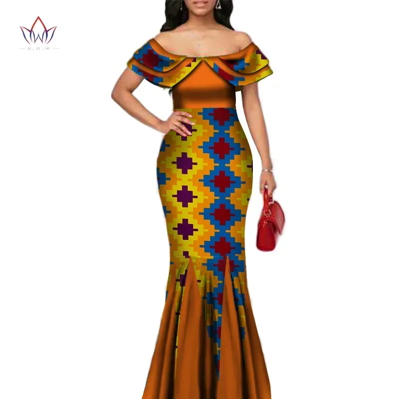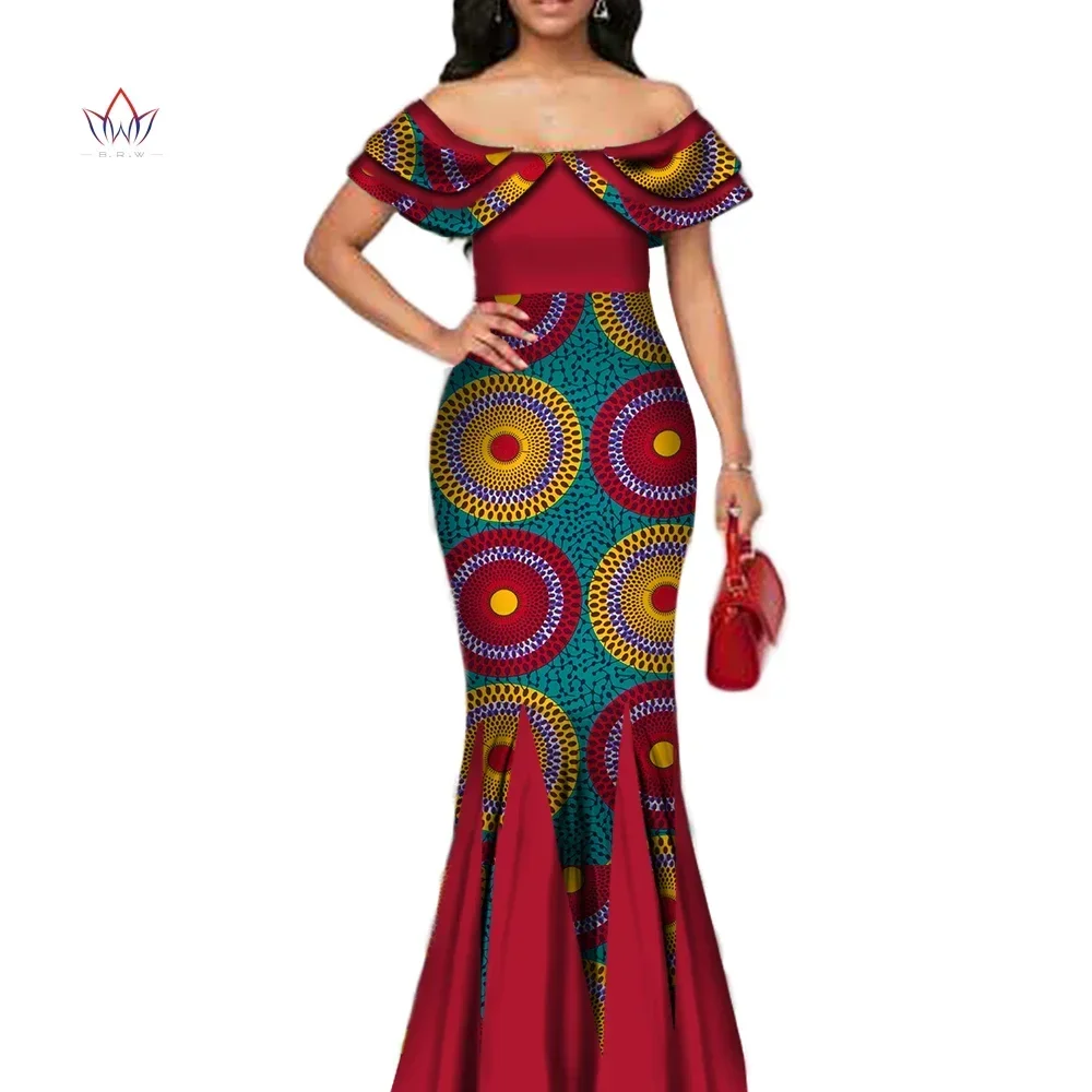 Fashion African Print Long Mermaid Dress for Women Bazin Rich Patchwork Peter Pan Colla Dresses African Design Clothing WY3272