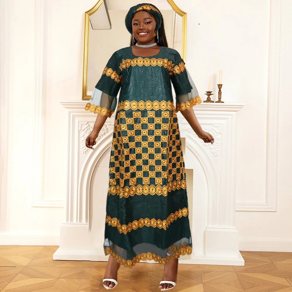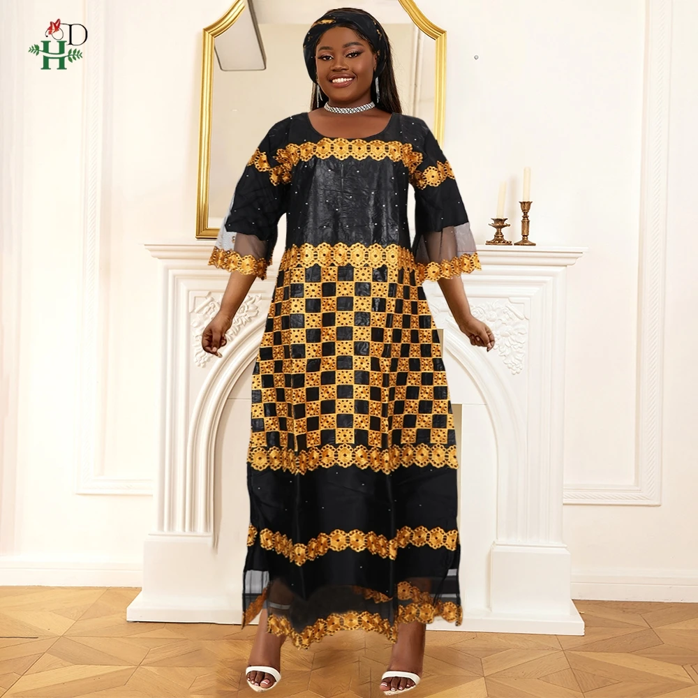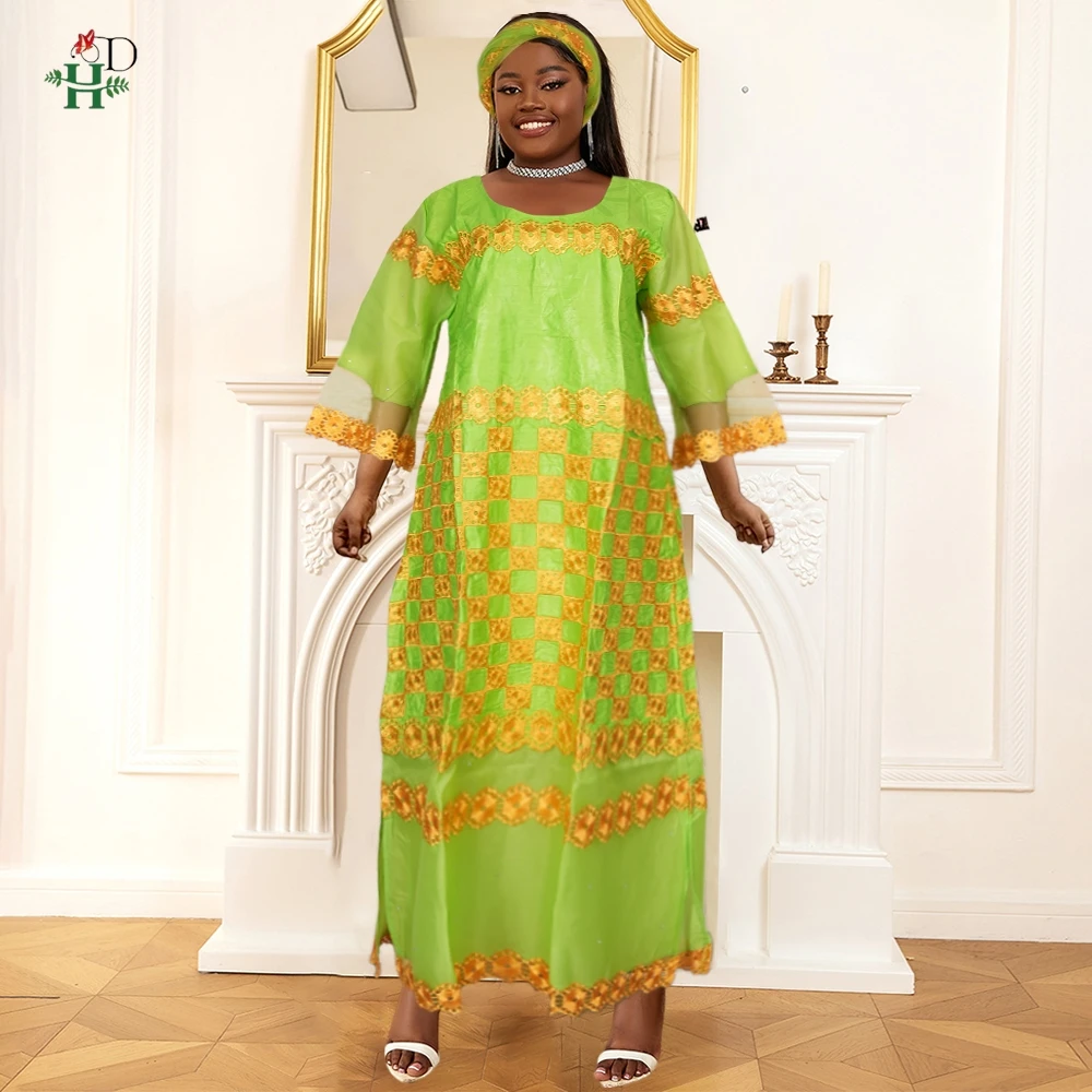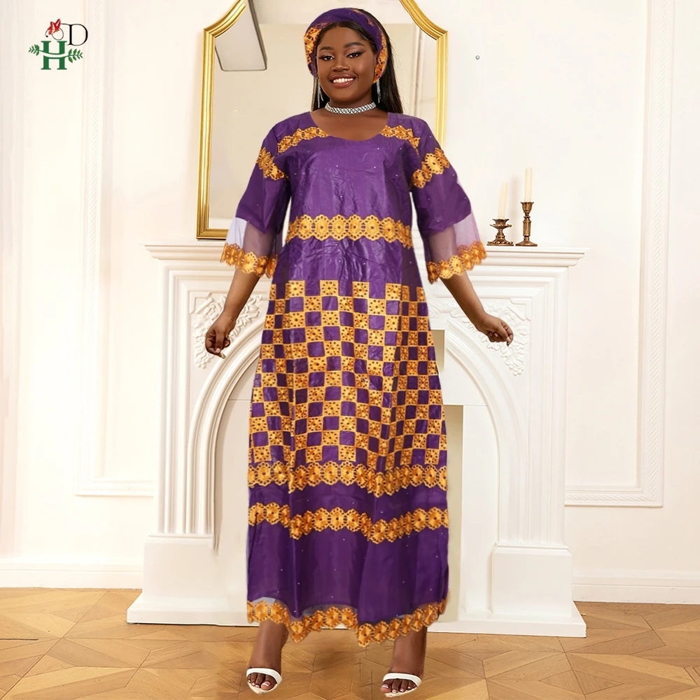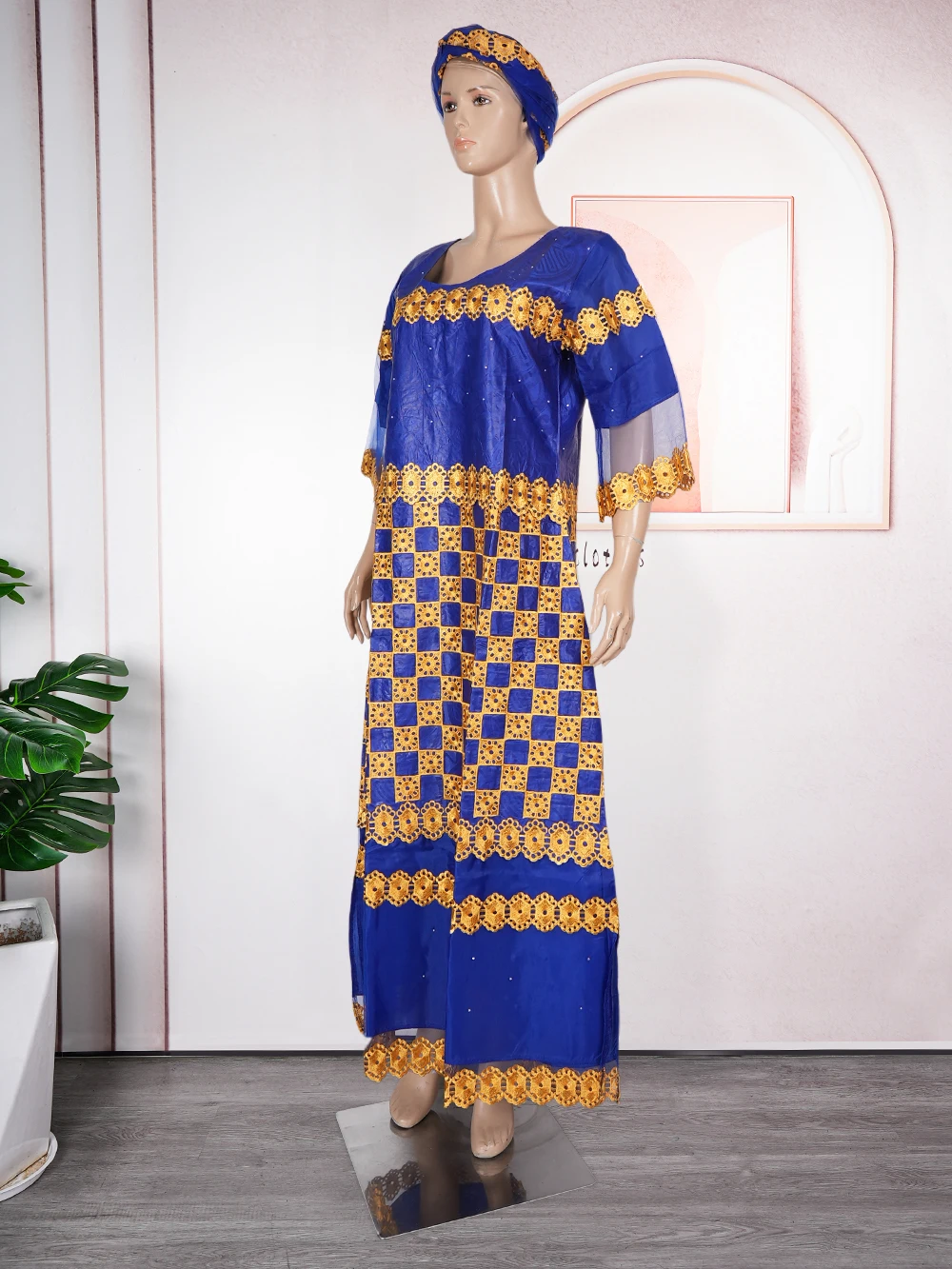 H&D Women Traditional African Dresses Bazin High Quality Embroidery Dresses Blue Traditional Dress for Wedding Party Occasions