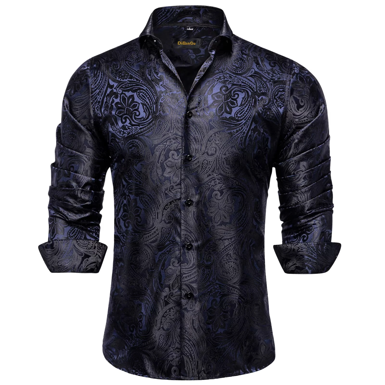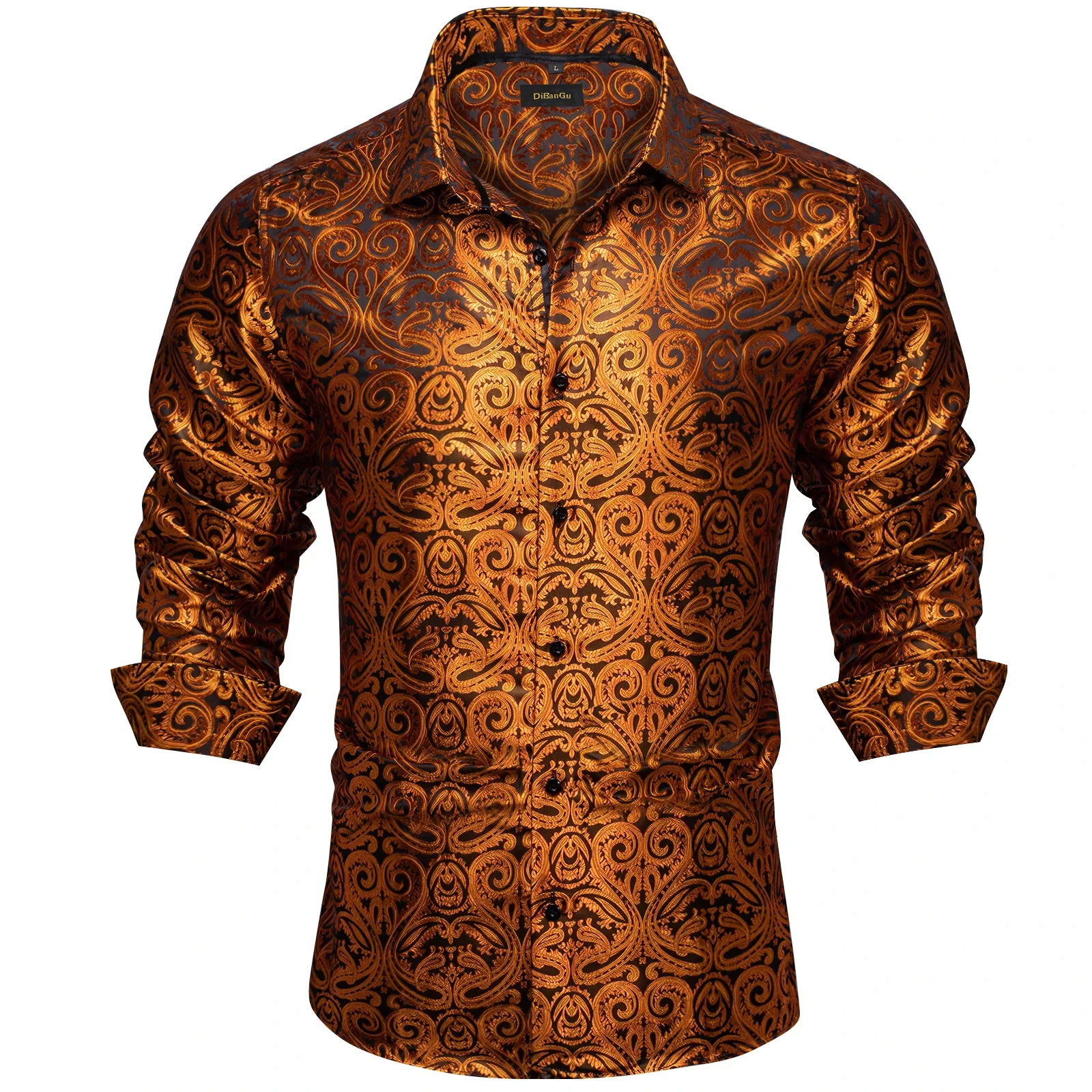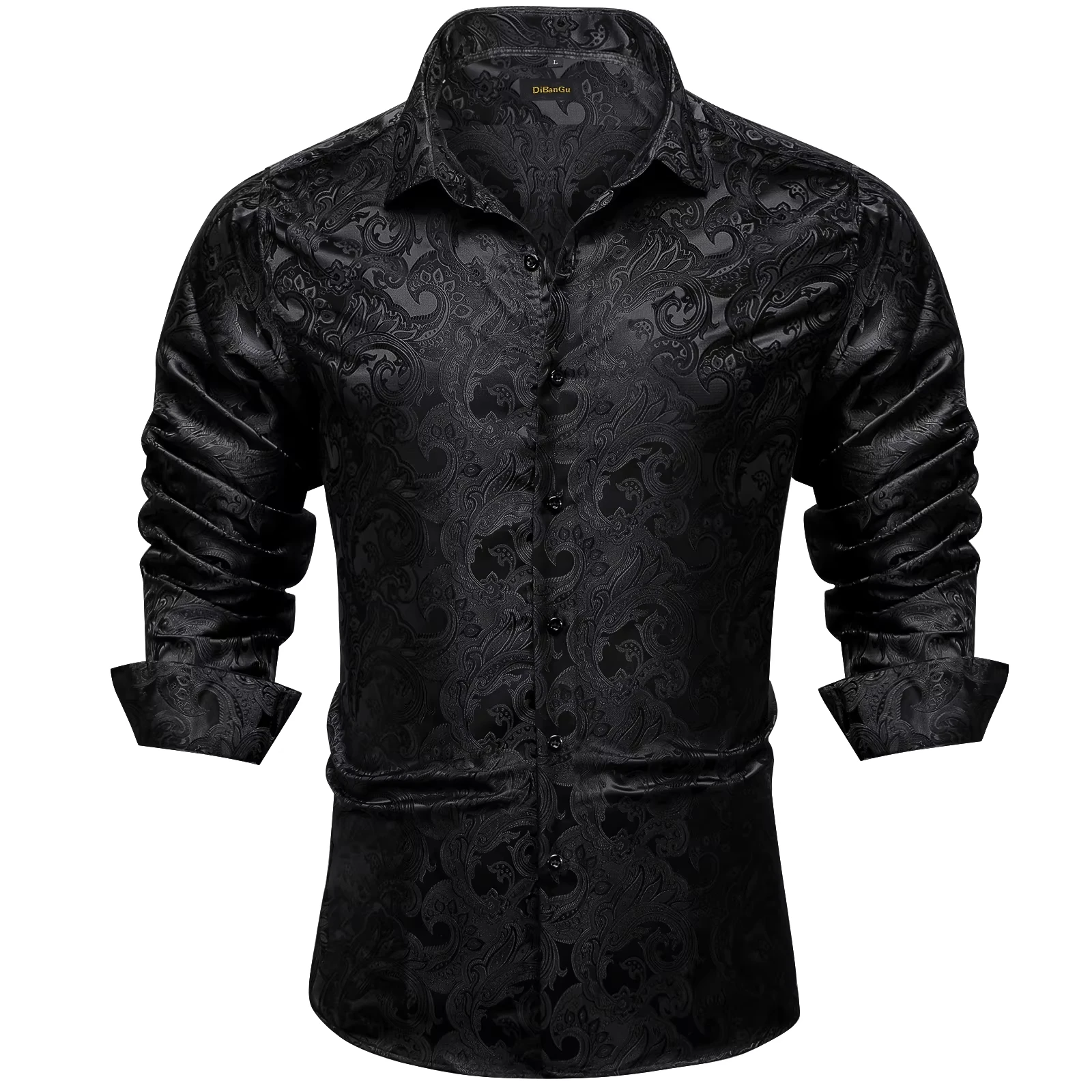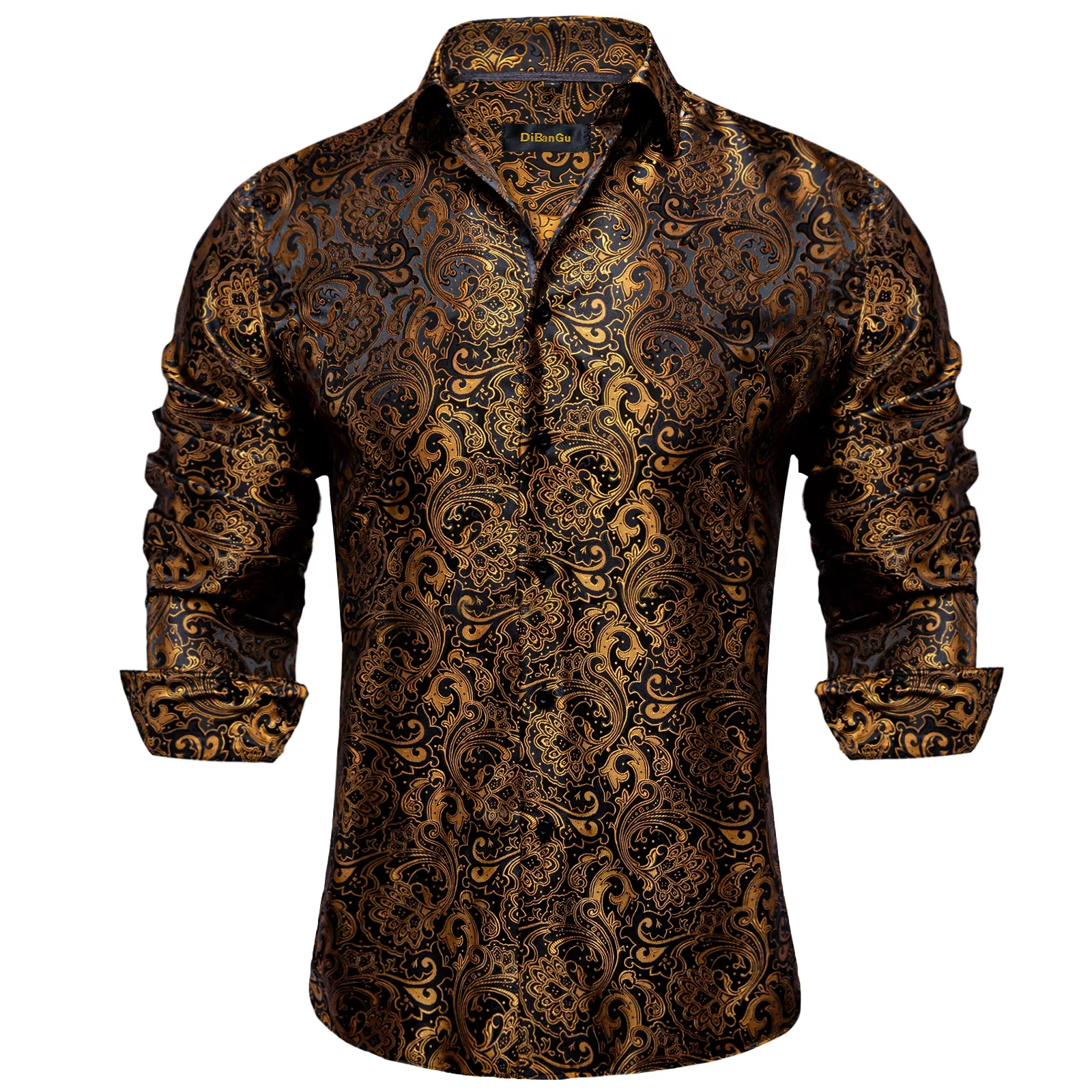 Luxury Men's Formal Dress Shirt Prom Tuxedo Long Sleeve Golden Paisley Print Black Polyester Evening Wear Top