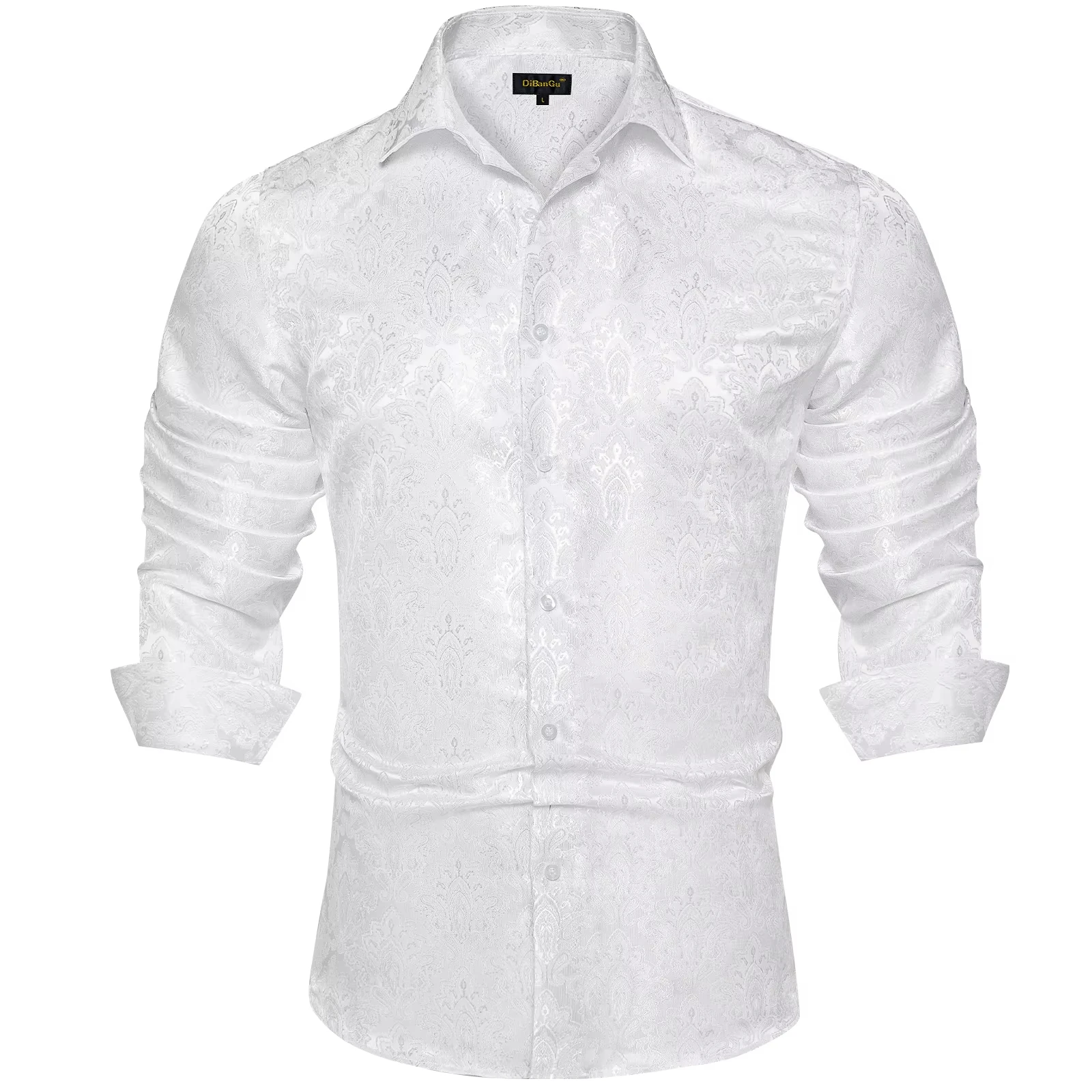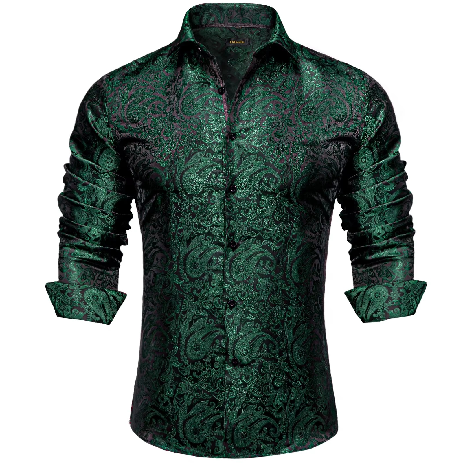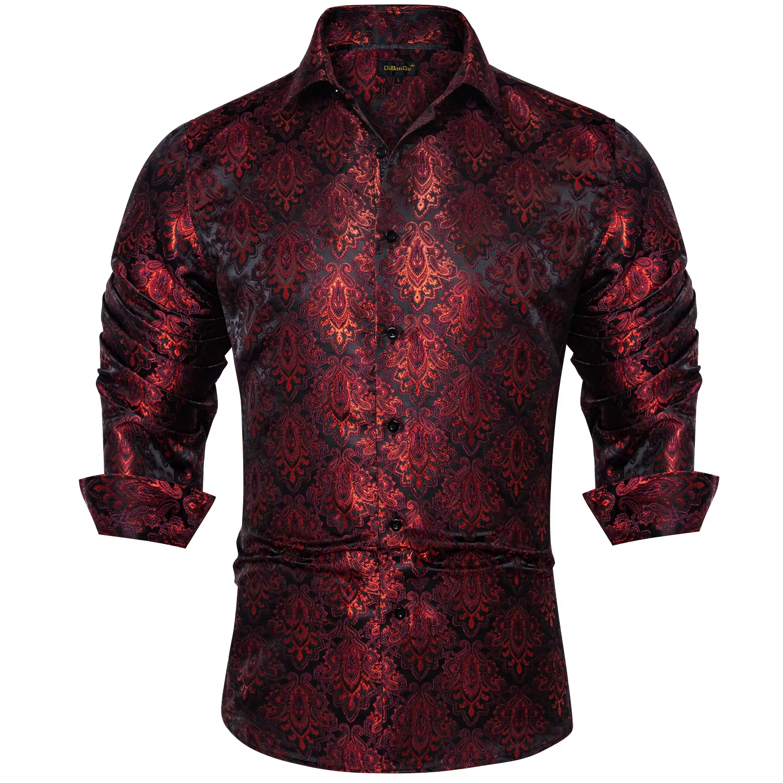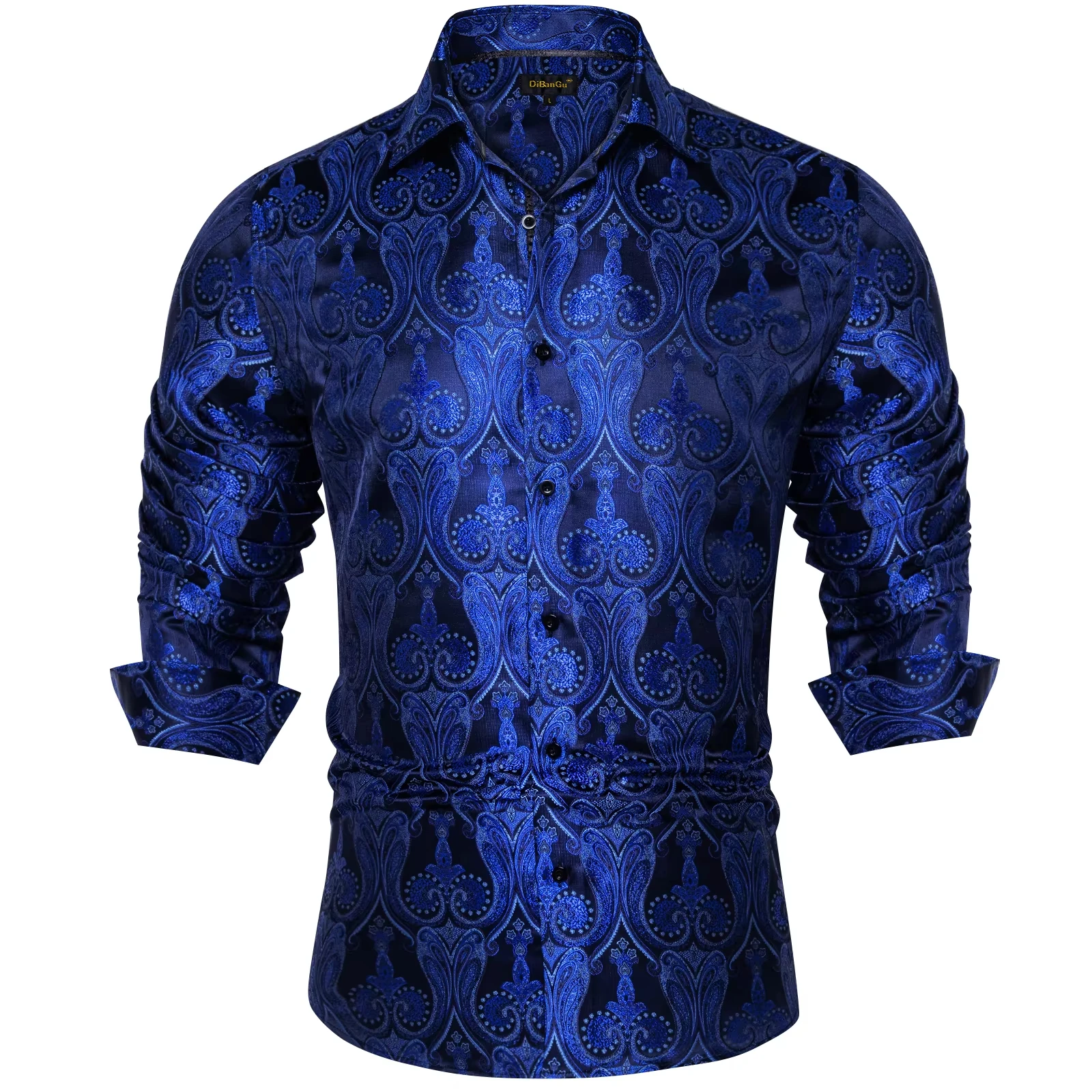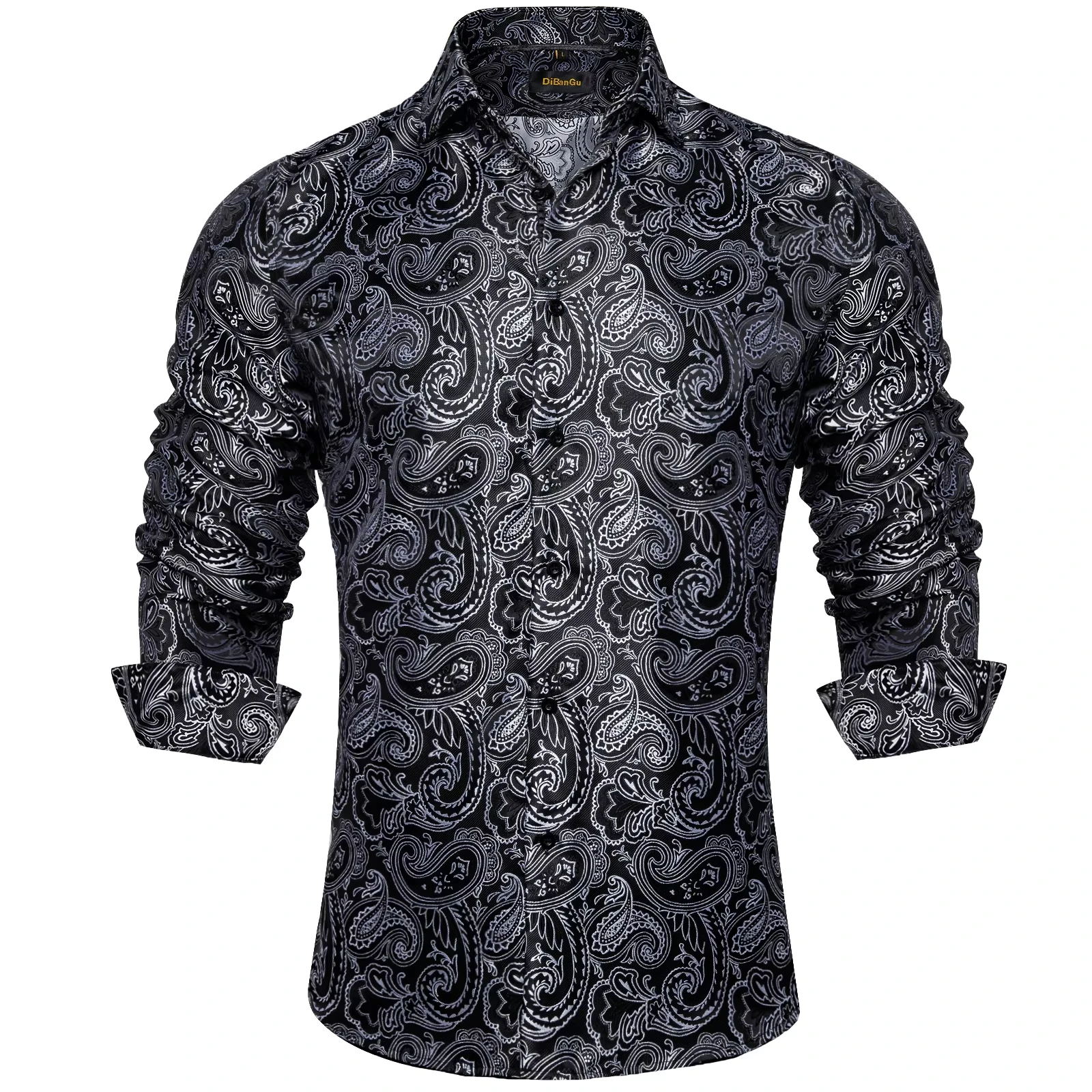 Luxury Men's Formal Dress Shirt Prom Tuxedo Long Sleeve Golden Paisley Print Black Polyester Evening Wear Top