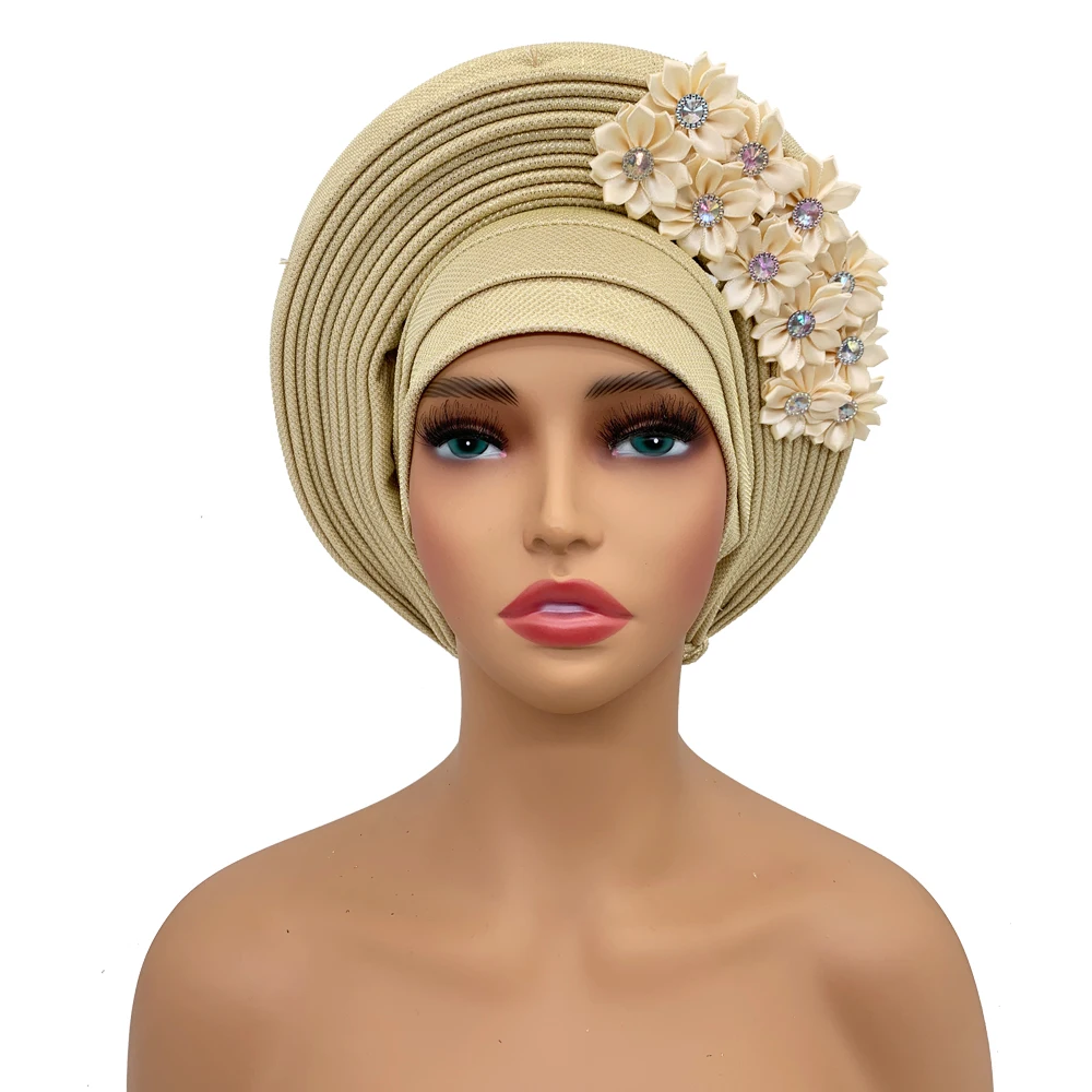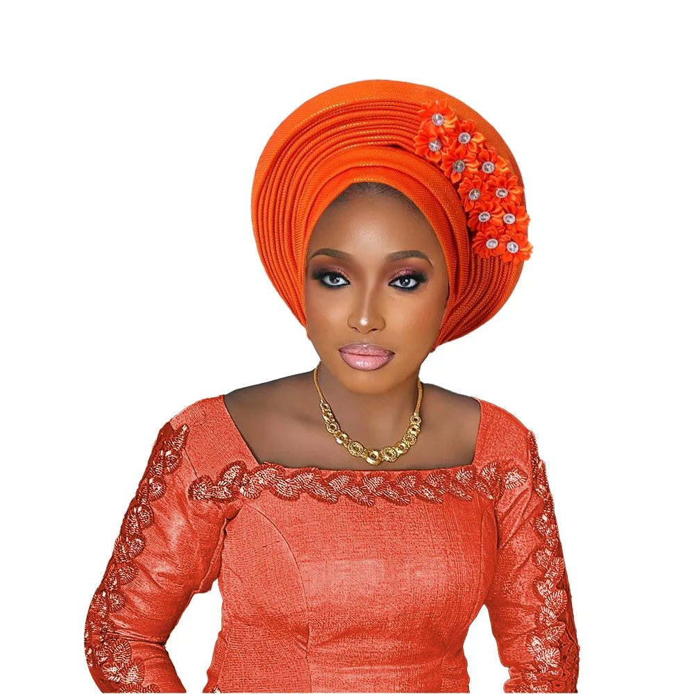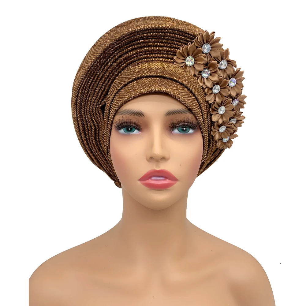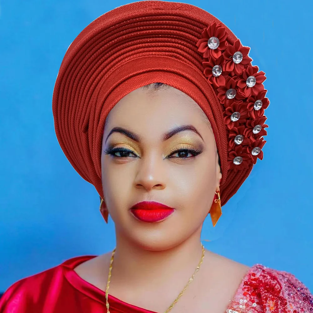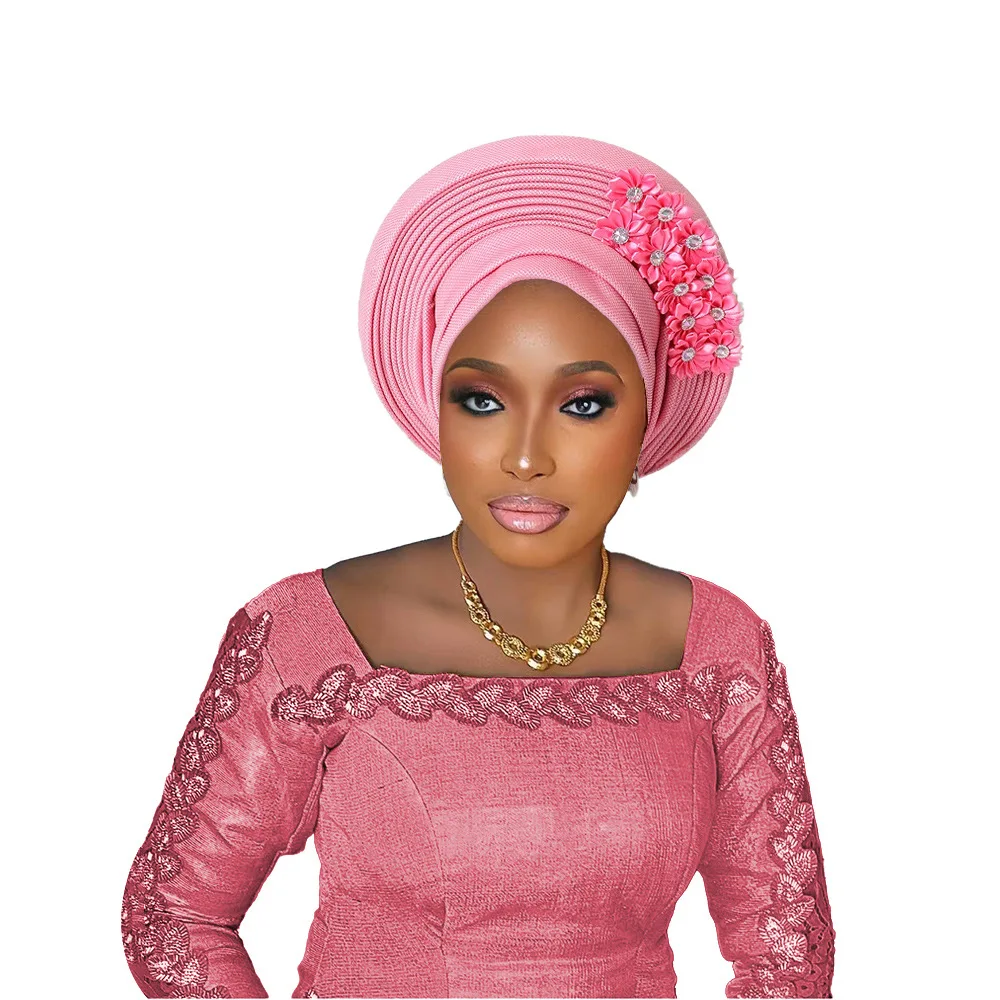New African Headtie Turban Nigeria Head Ties with Flowers Already Made Auto Gele Women Head Wraps for Wedding Party