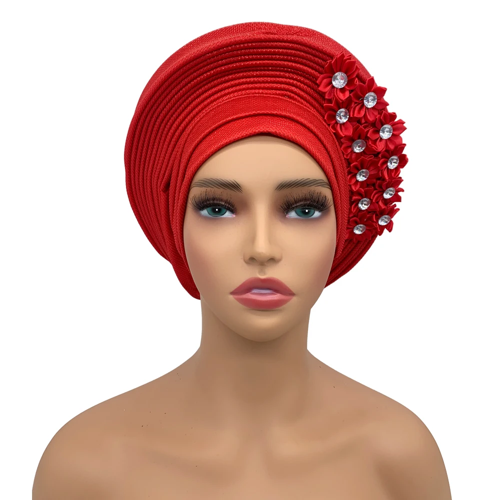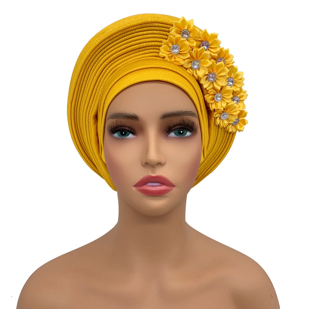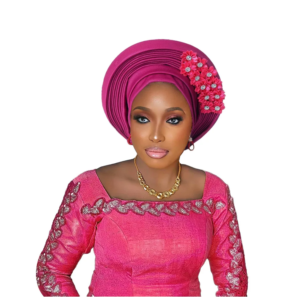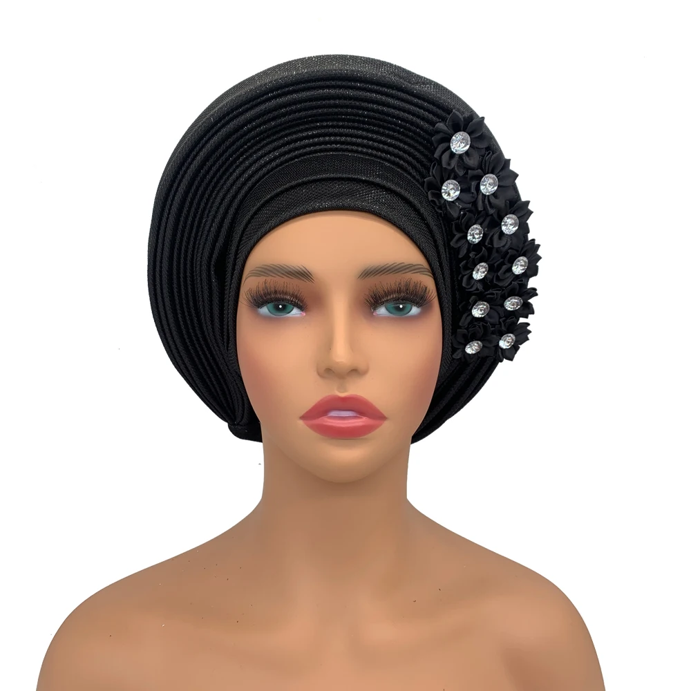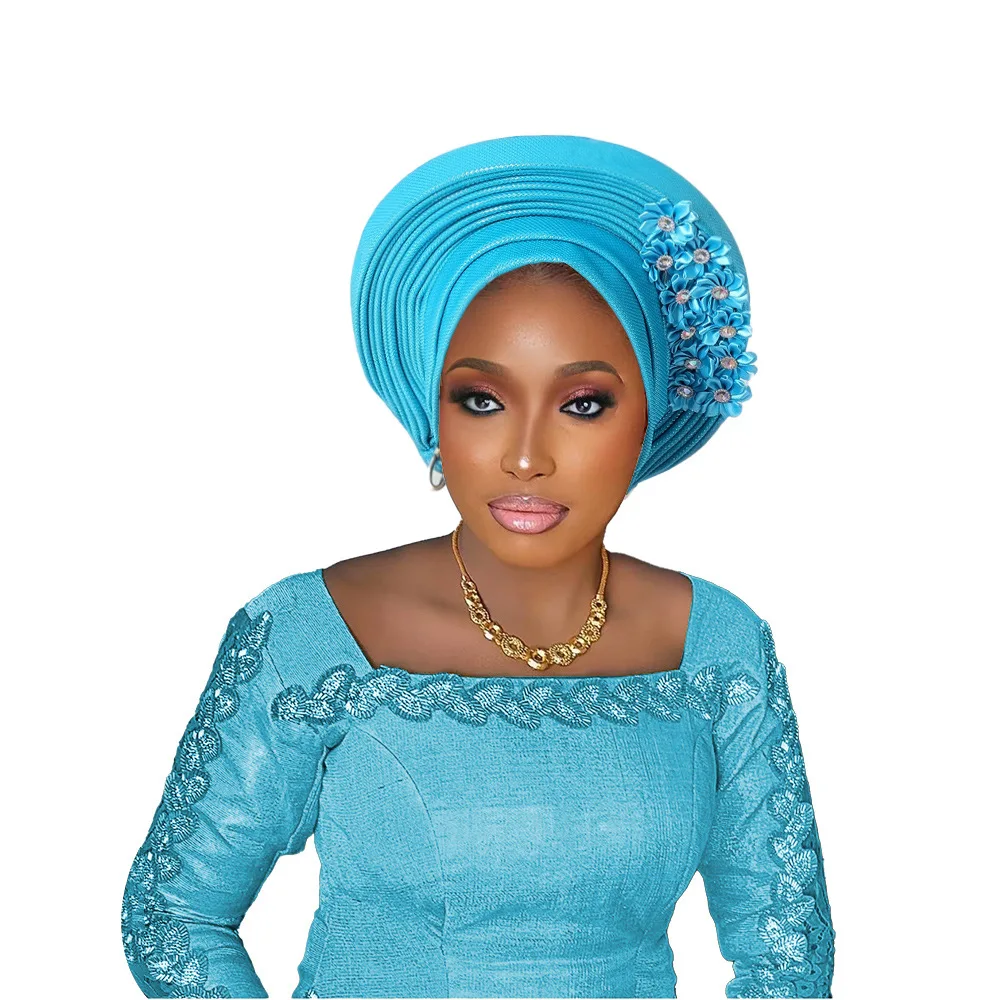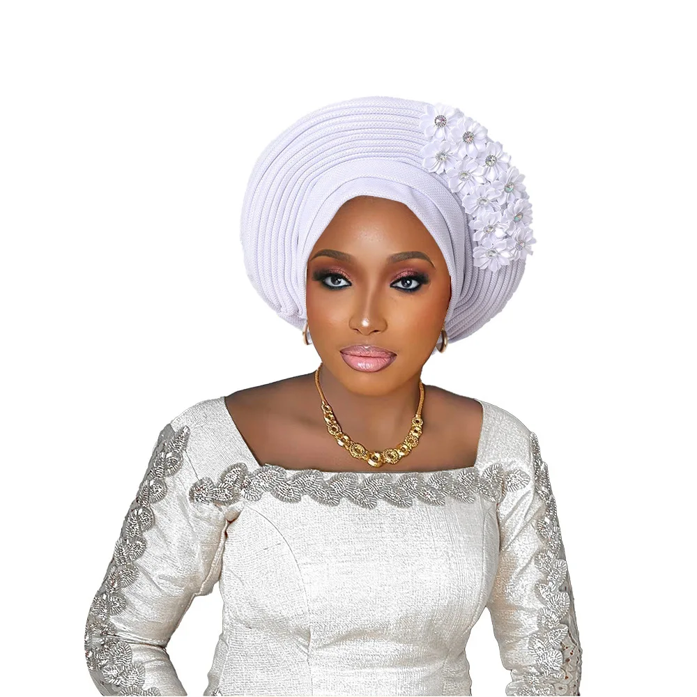 New African Headtie Turban Nigeria Head Ties with Flowers Already Made Auto Gele Women Head Wraps for Wedding Party