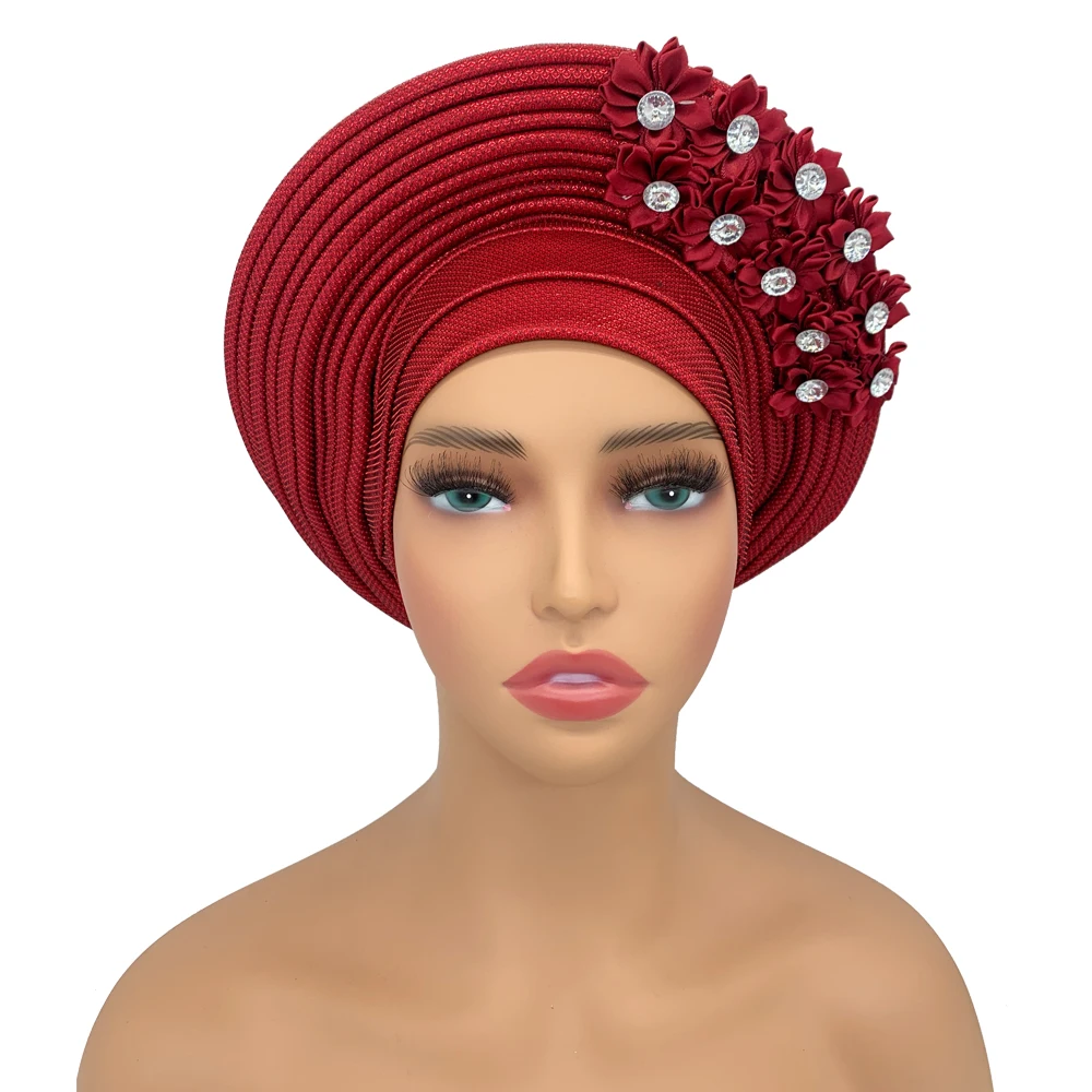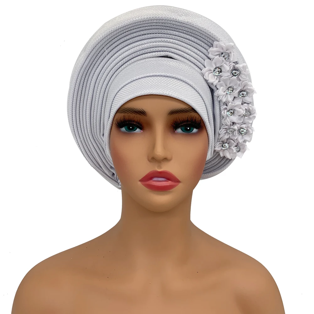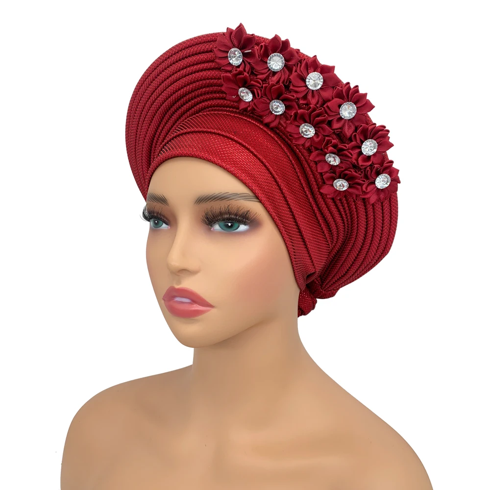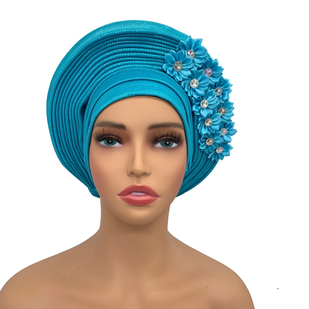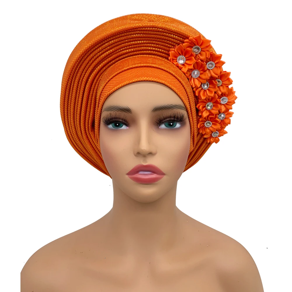 New African Headtie Turban Nigeria Head Ties with Flowers Already Made Auto Gele Women Head Wraps for Wedding Party