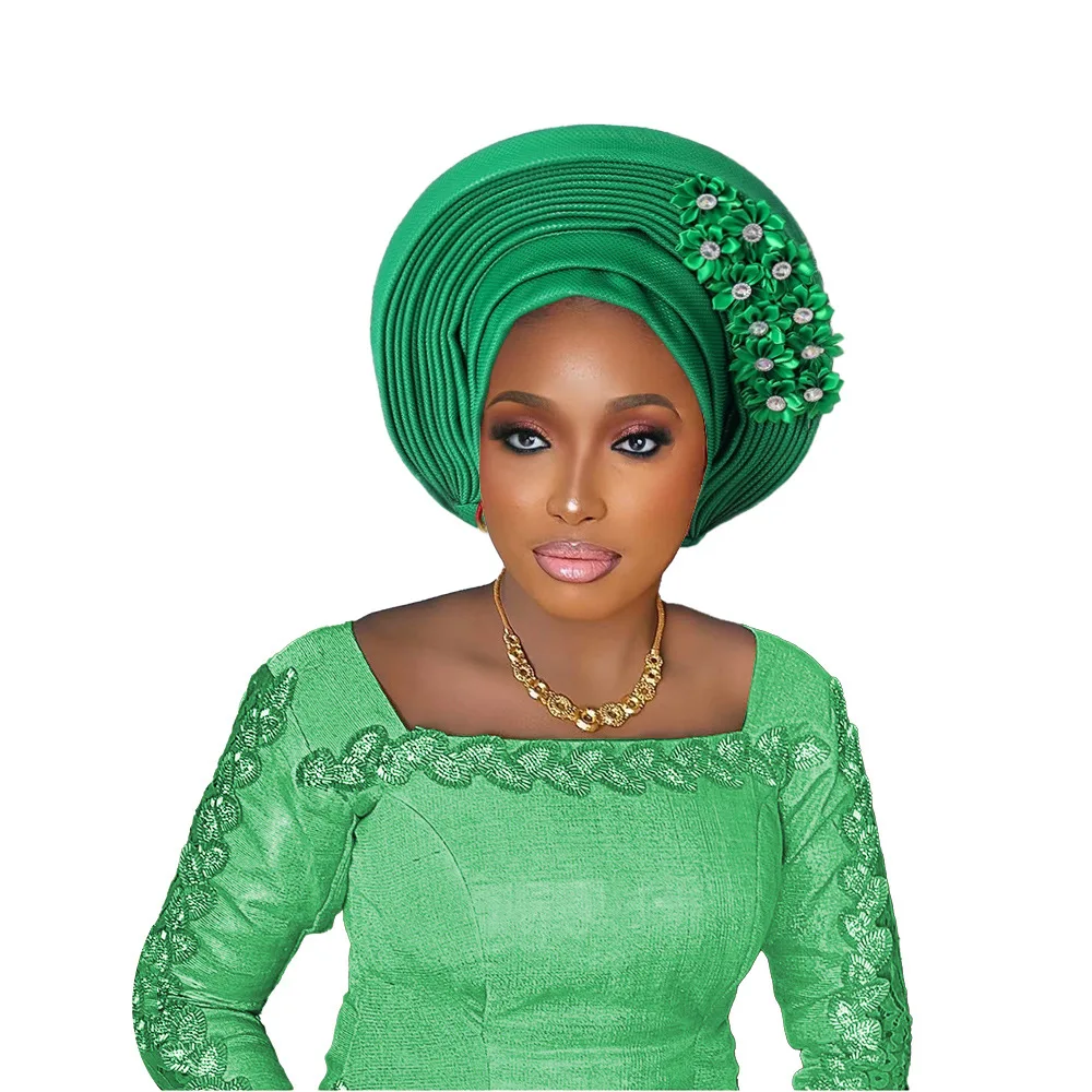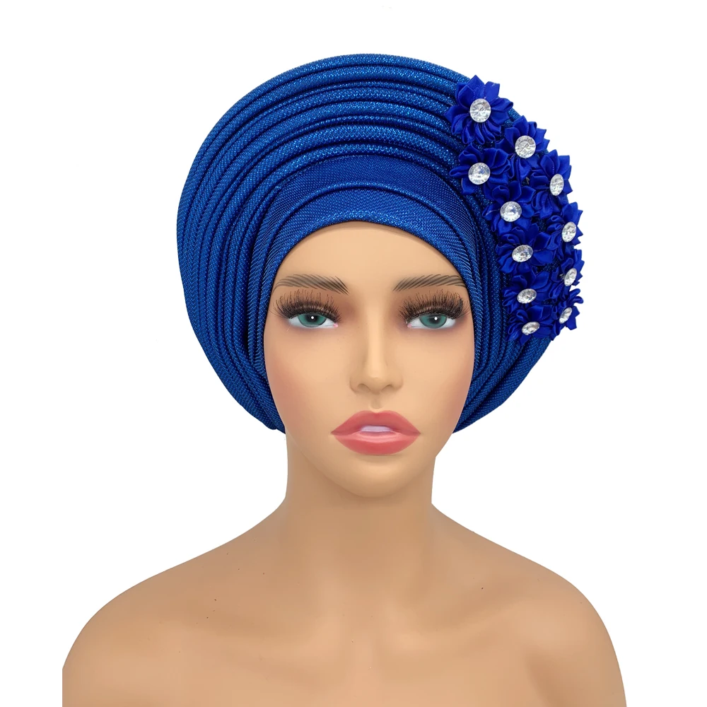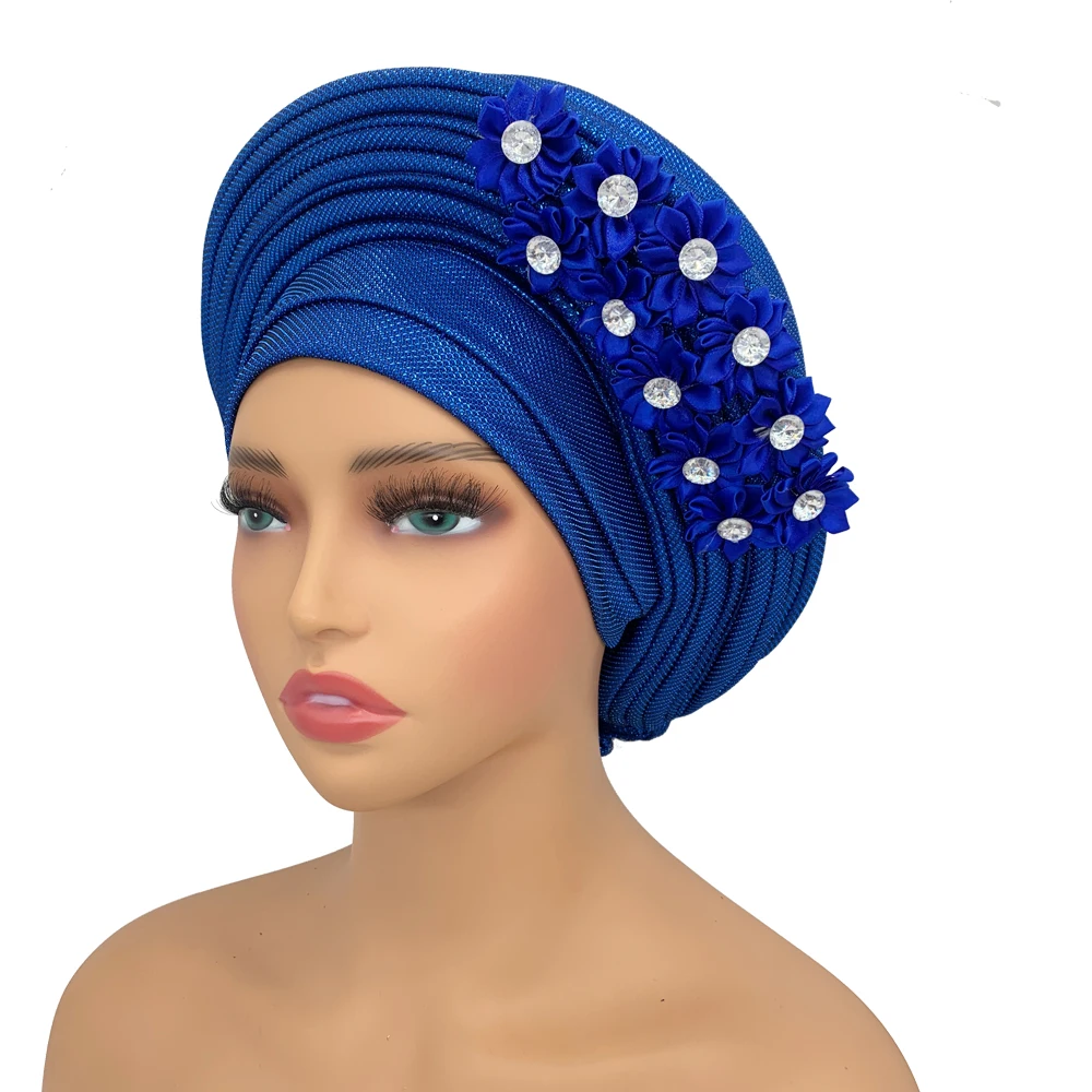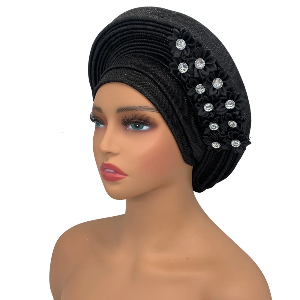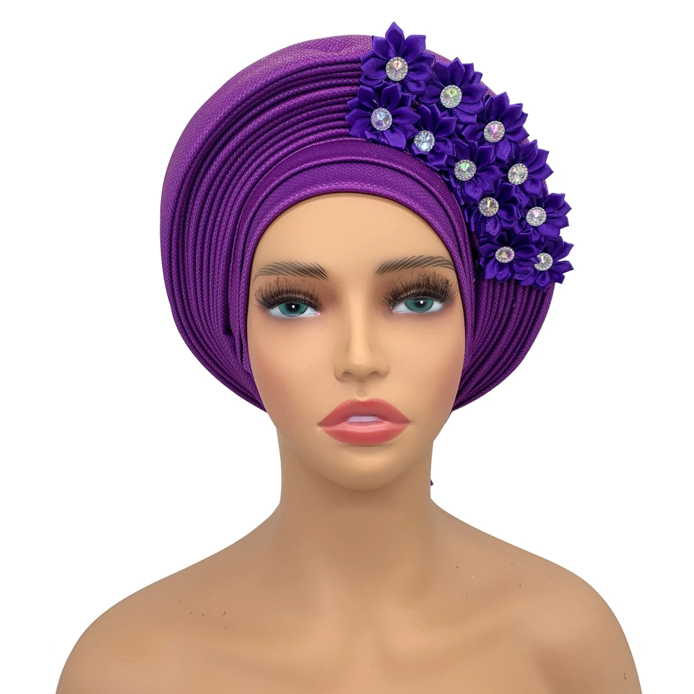 New African Headtie Turban Nigeria Head Ties with Flowers Already Made Auto Gele Women Head Wraps for Wedding Party