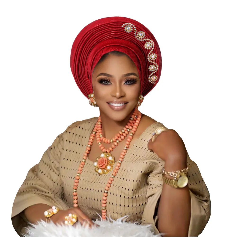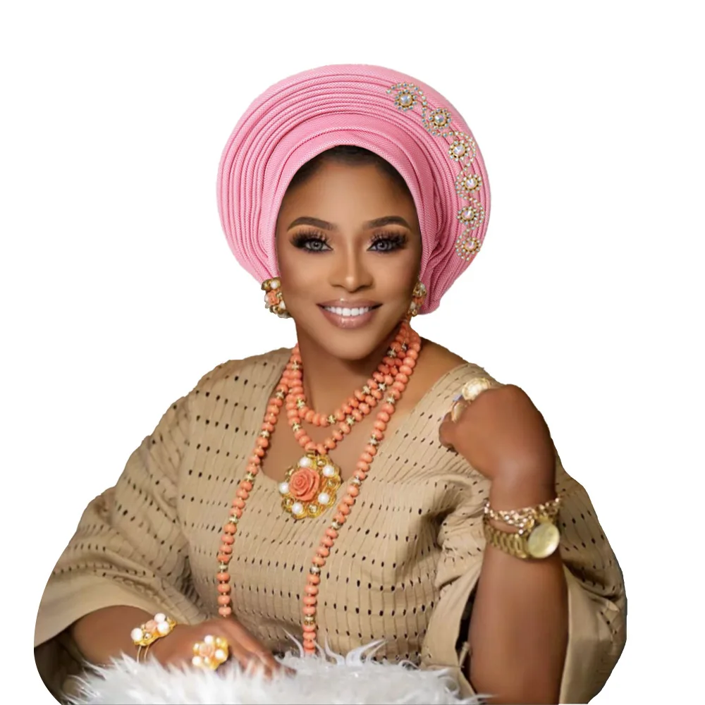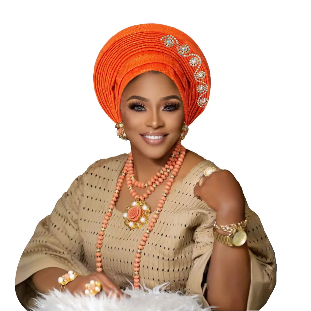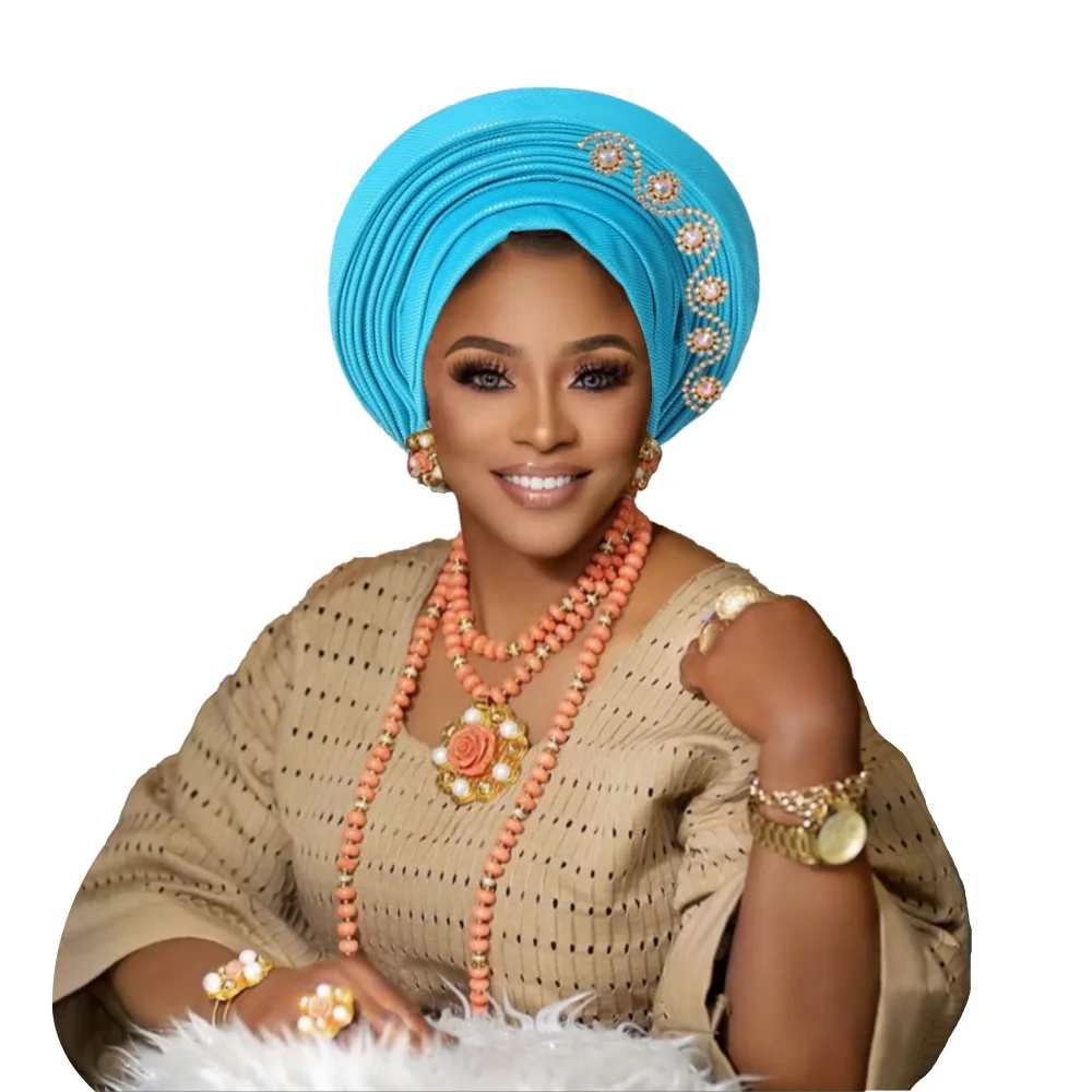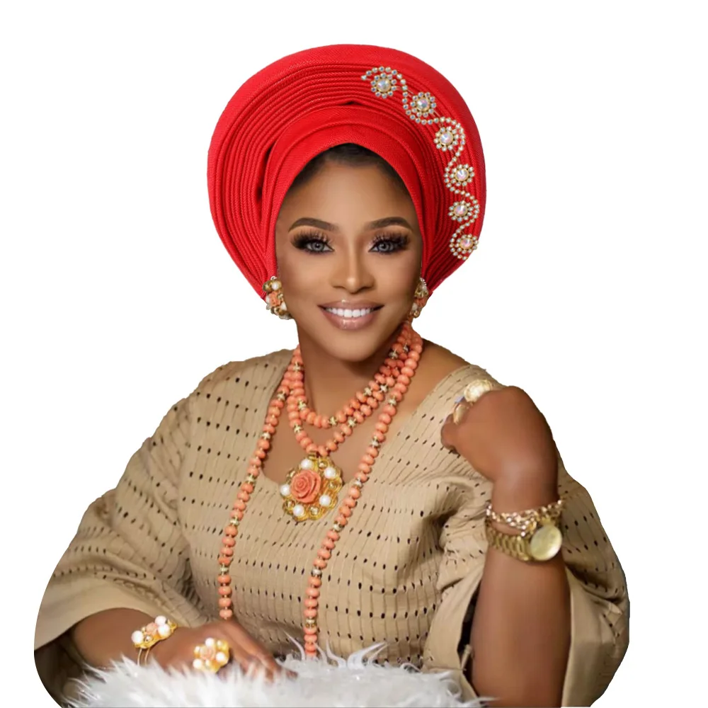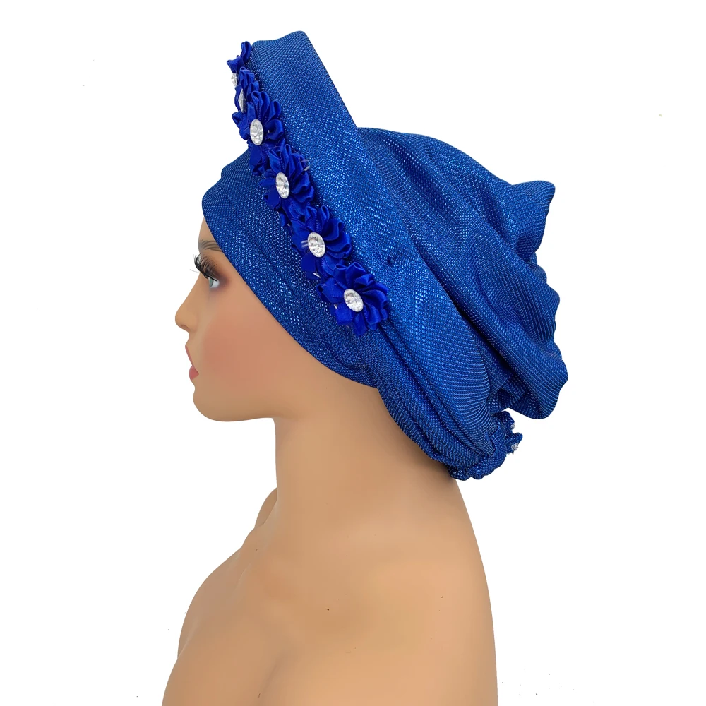 New African Headtie Turban Nigeria Head Ties with Flowers Already Made Auto Gele Women Head Wraps for Wedding Party
