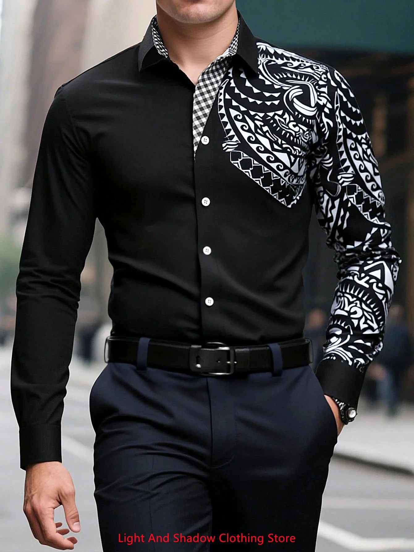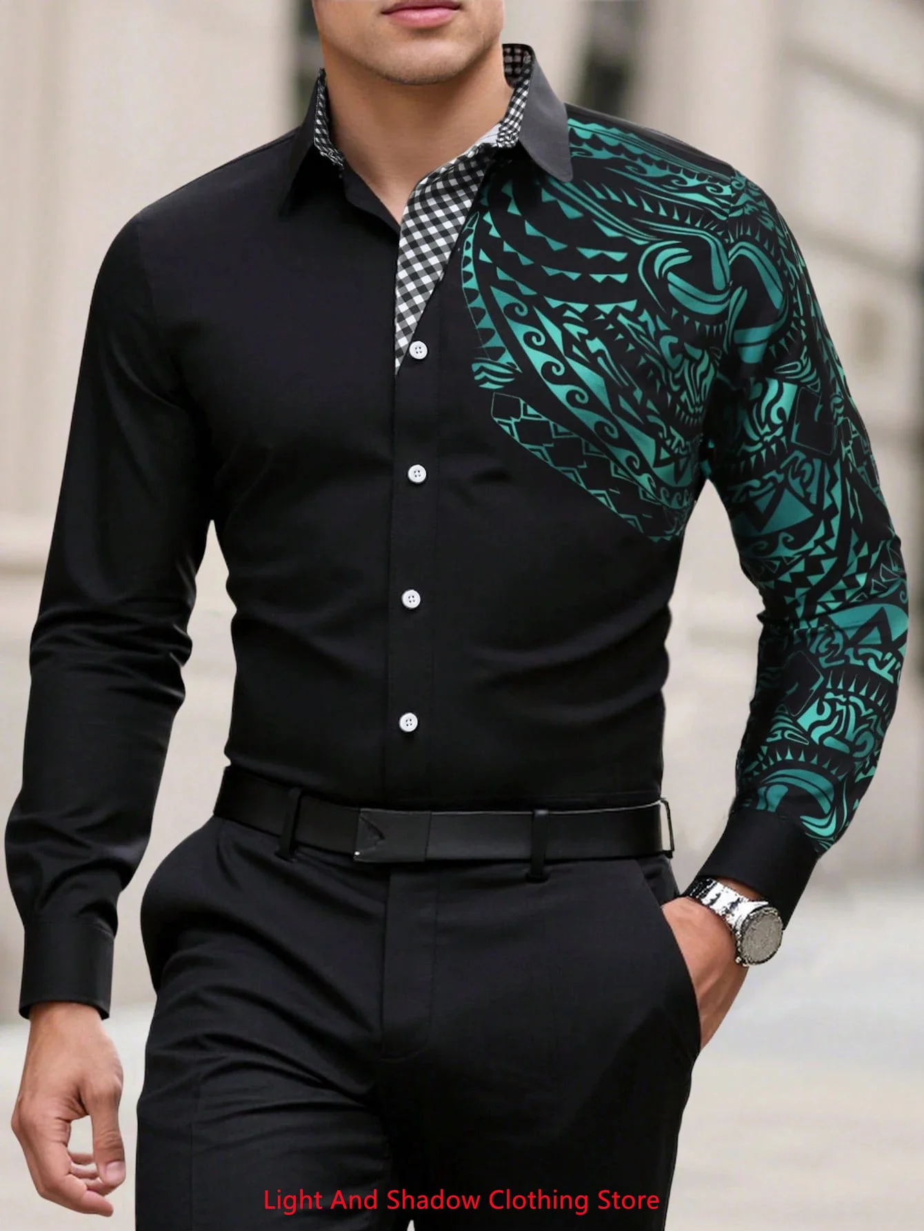 New men's fashionable business casual long sleeved shirt, classic printed collar, social party comfortable men's clothing
