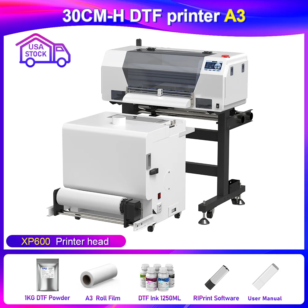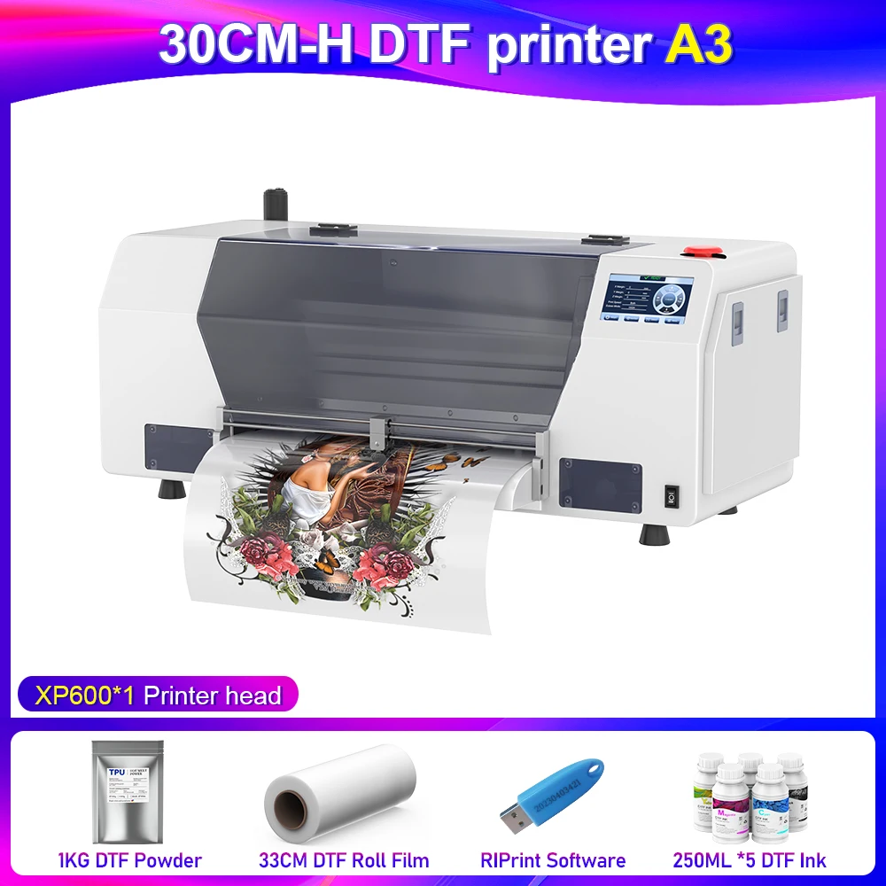 XP600 A3 DTF Printer + Roll holder + RIPrint Software +250ML*5 DTF ink +1KG DTF powder + 30CM Roll Film +DTF Oven A3