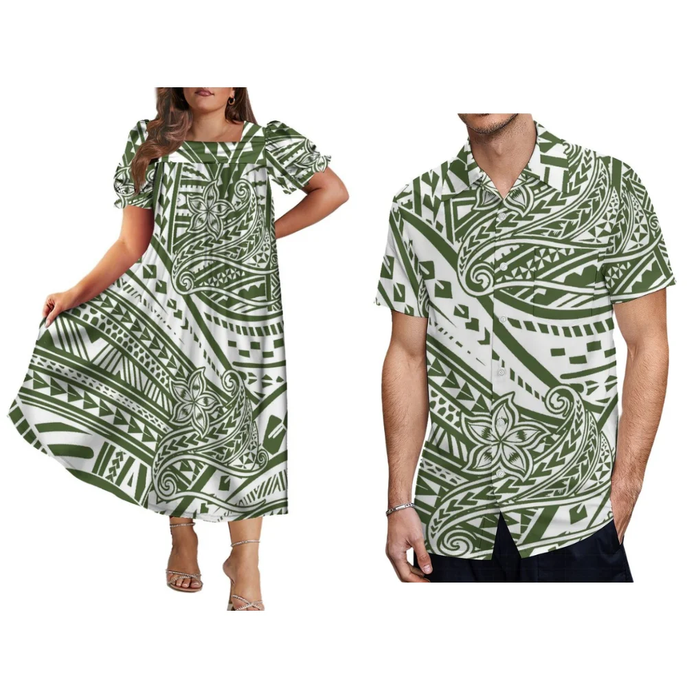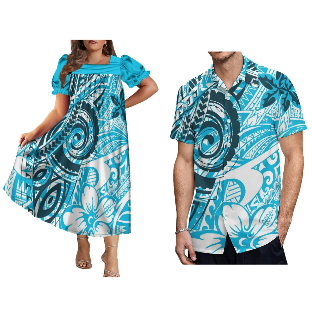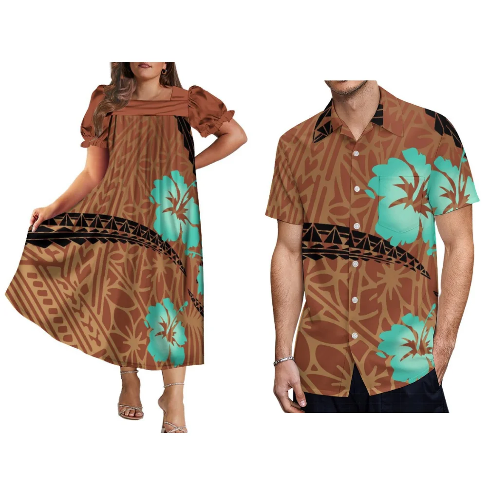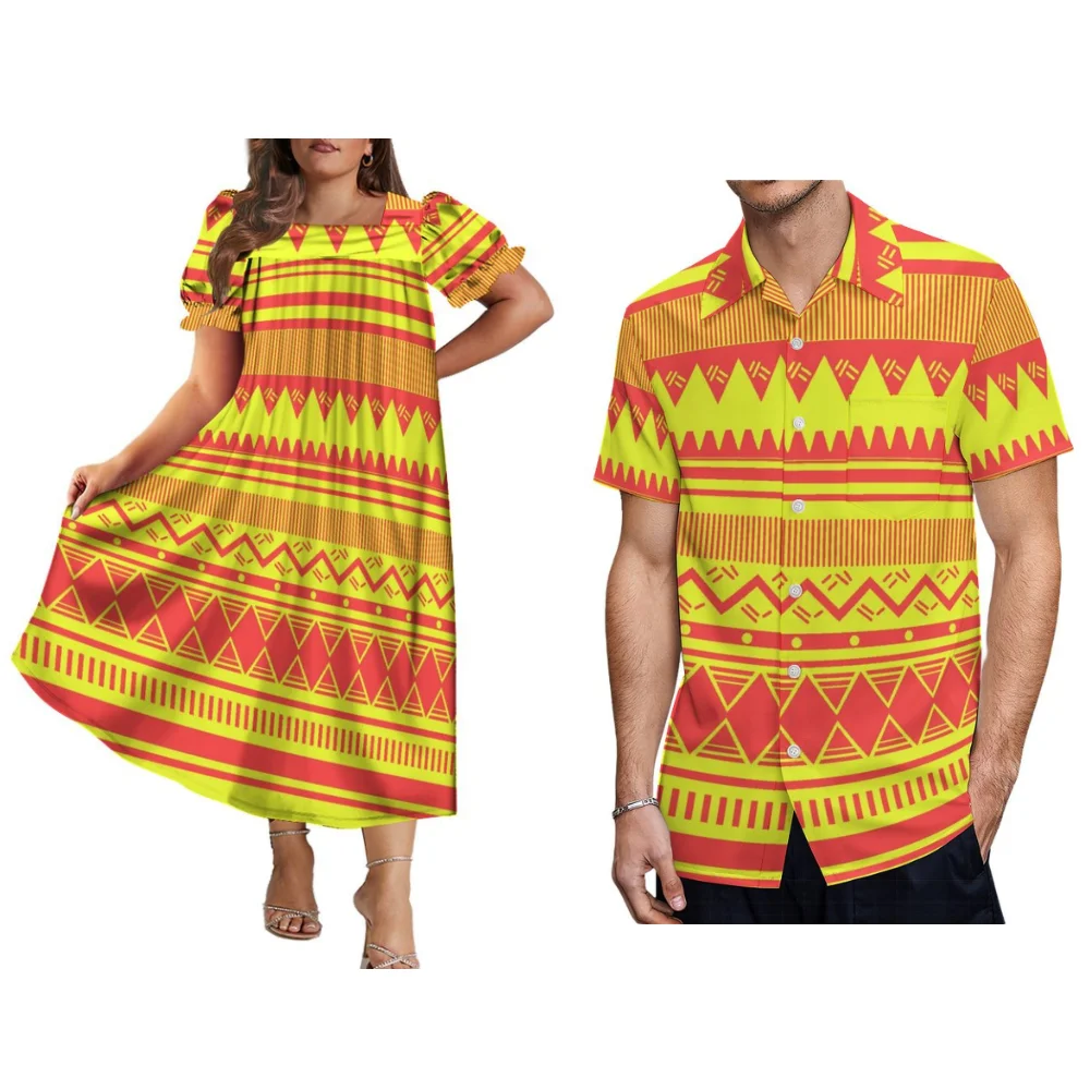 Polynesian Tribal Couple Dress Custom Samoan Traditional Ethnic Couple Suit Mumu Casual Art Dress And Beach Party Men'S Shirt