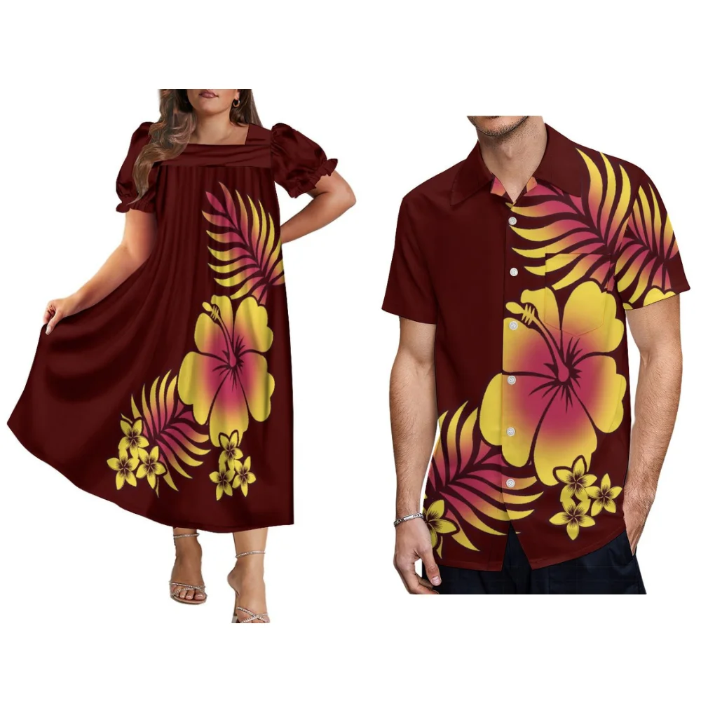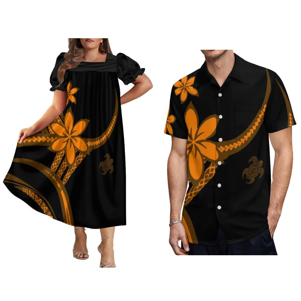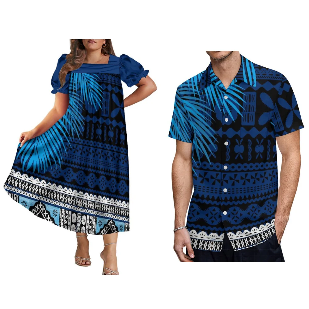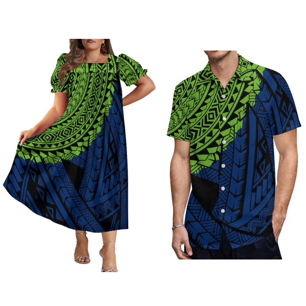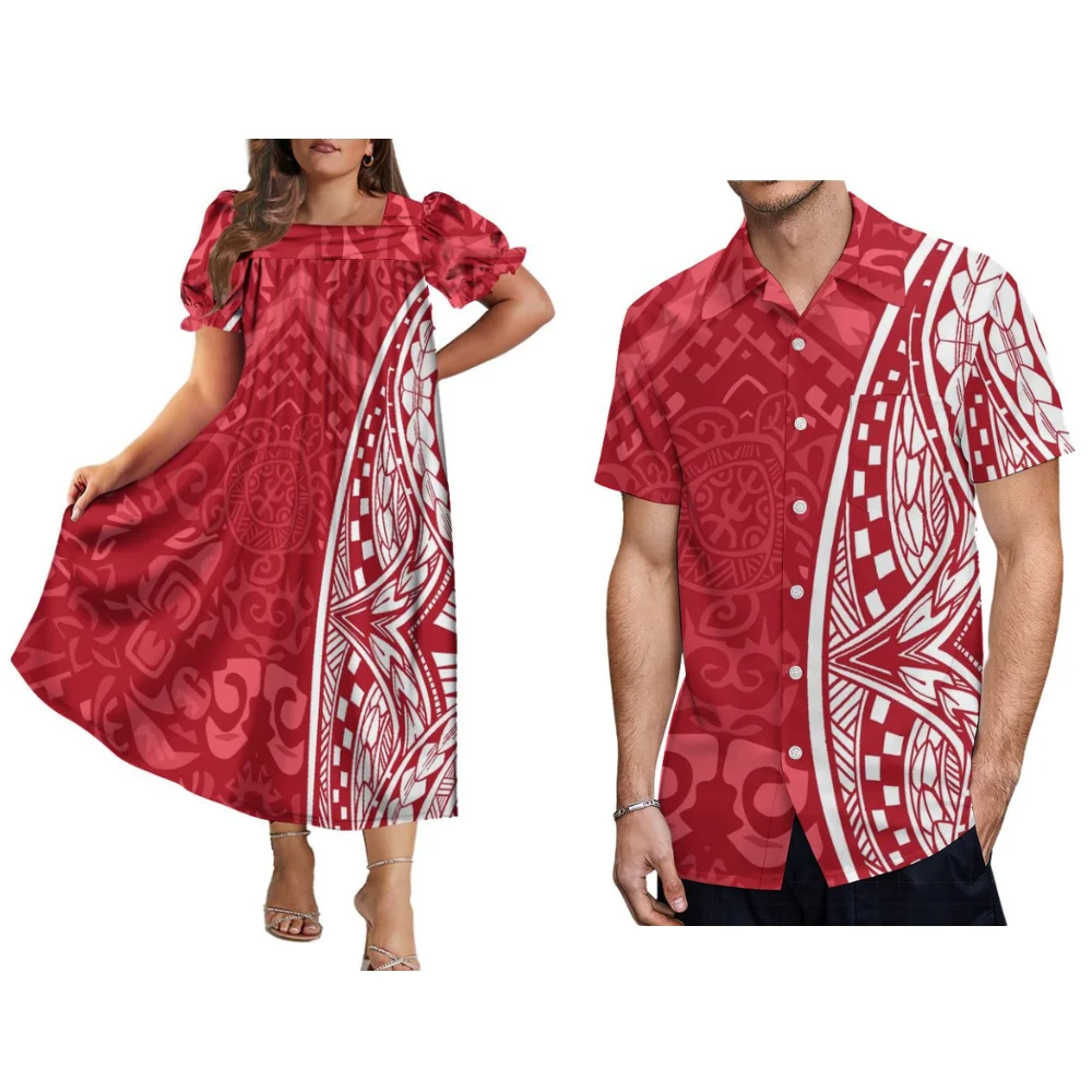 Polynesian Tribal Couple Dress Custom Samoan Traditional Ethnic Couple Suit Mumu Casual Art Dress And Beach Party Men'S Shirt