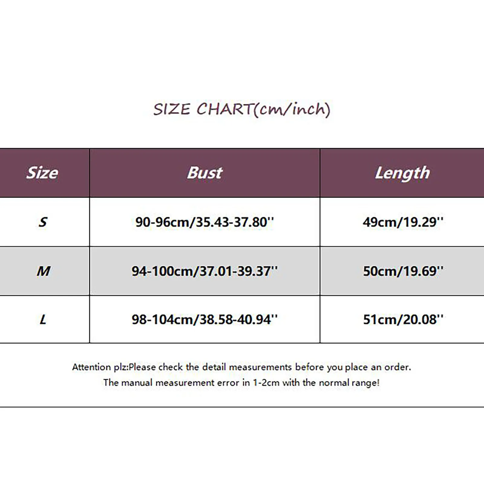 | Size:L | Bust:98-104cm/38.58-40.94'' | Length:51cm/20.08'' |