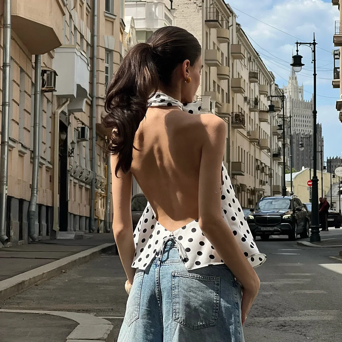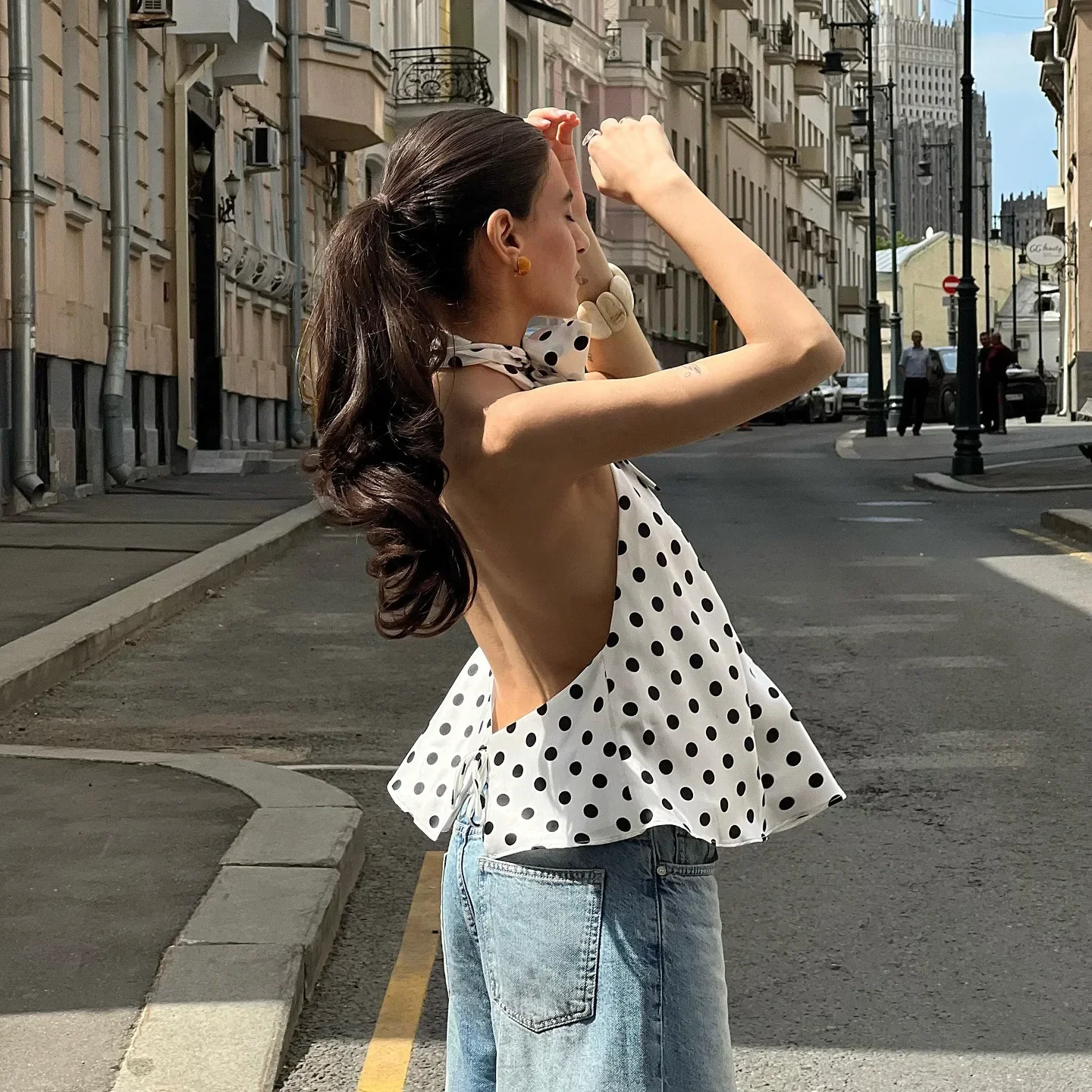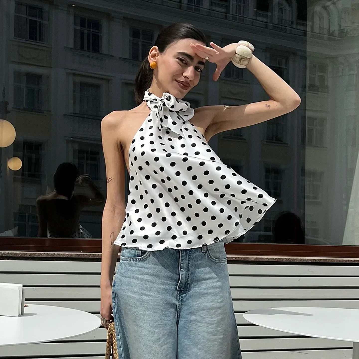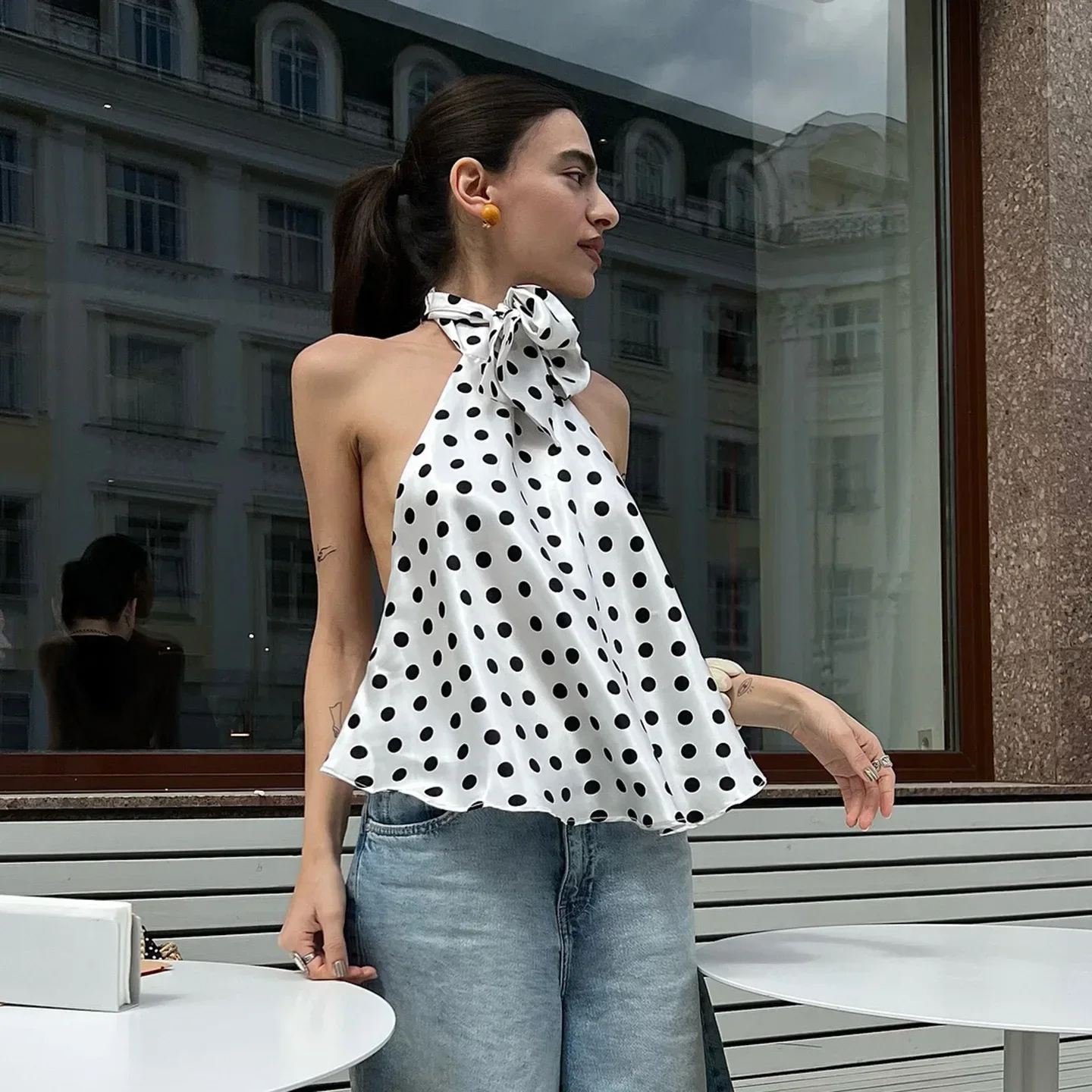 Vintage Polka Dot Tank Top Sexy Hanging Neck Contrast Bow Ribbon Backless Top Fashion Party Looks Backless Tops Women