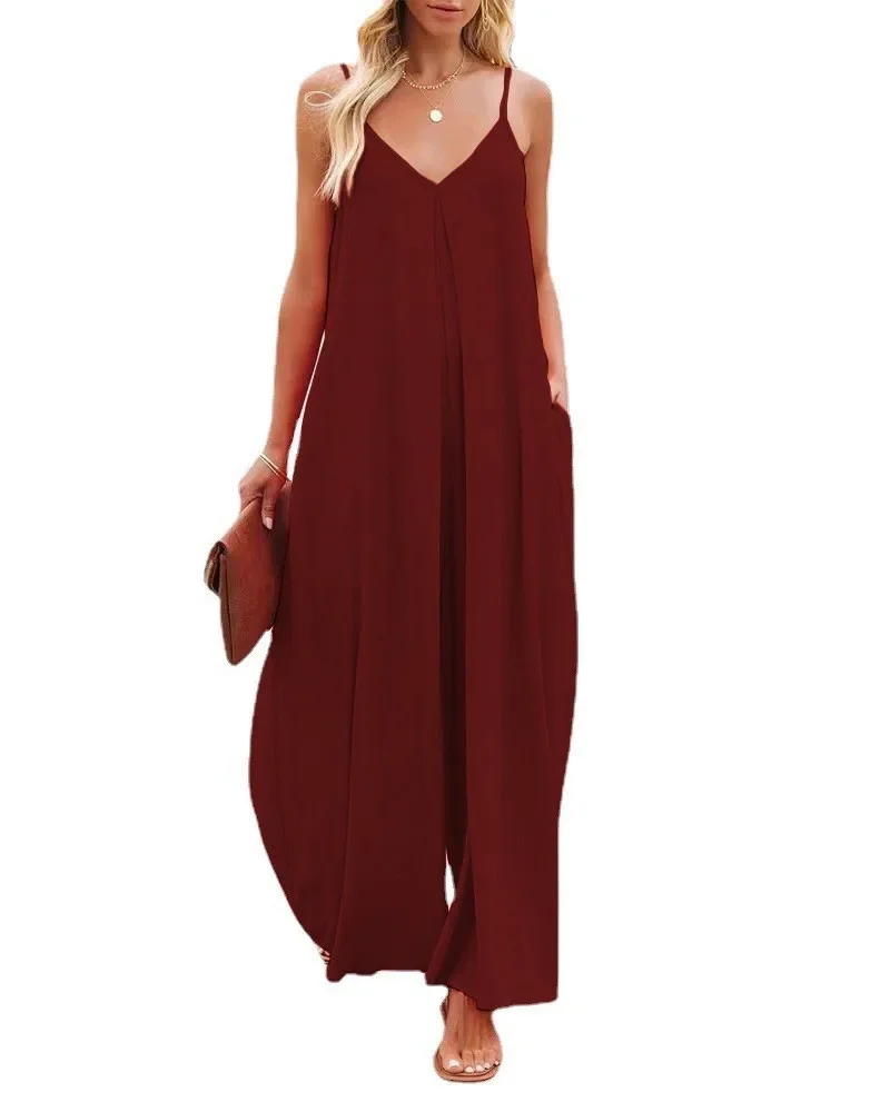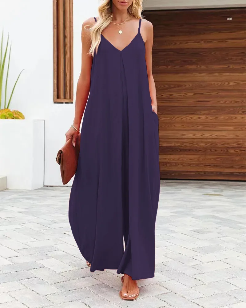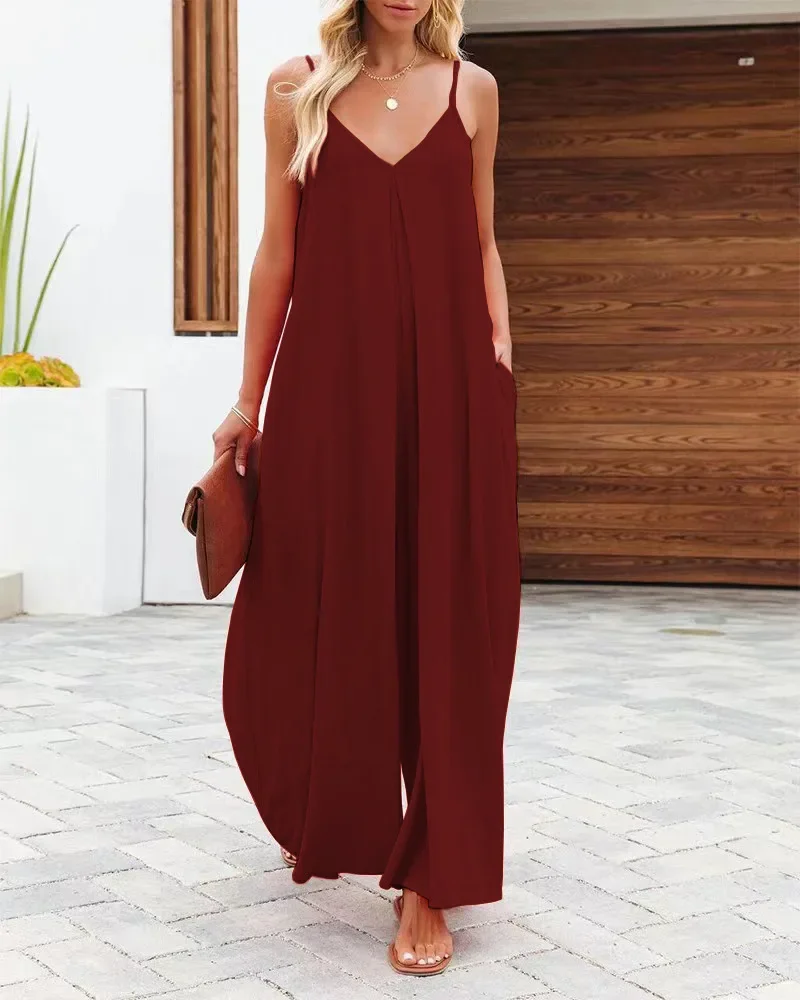 Women Jumpsuits V Neck One Piece Ankle Length Wide Leg Pants Rompers Backless Overalls Solid Pockets Loose Casual Mid Waist